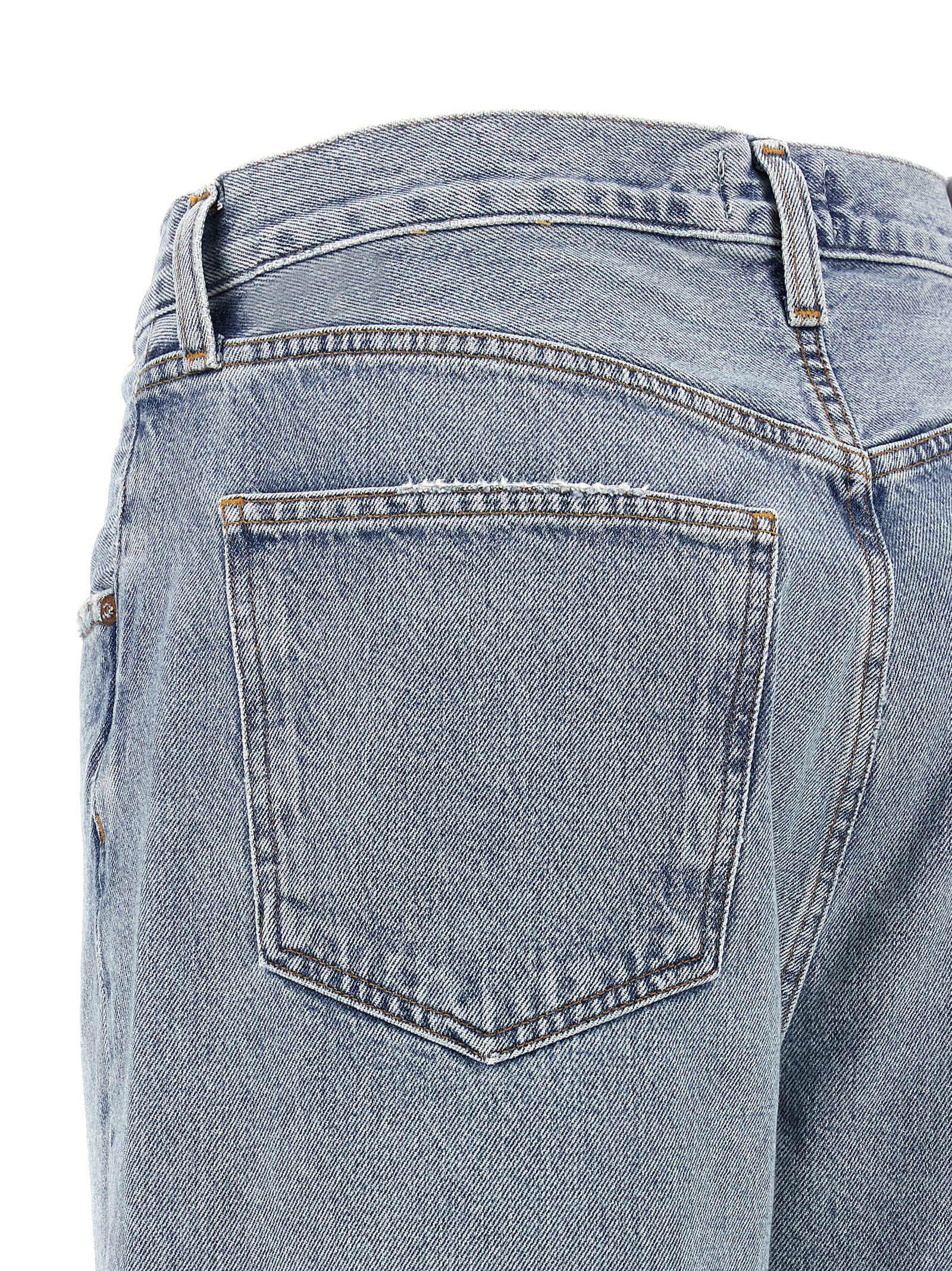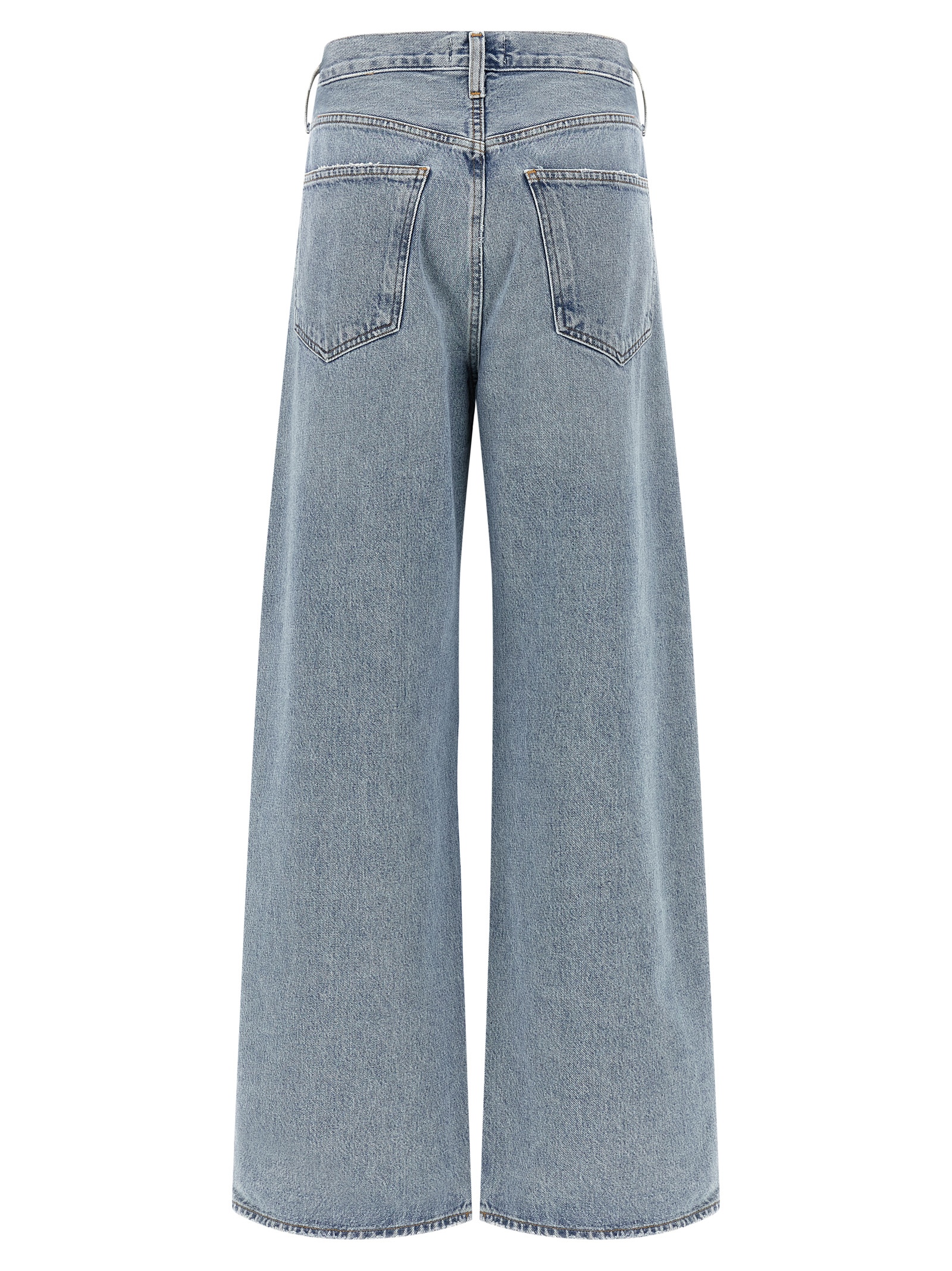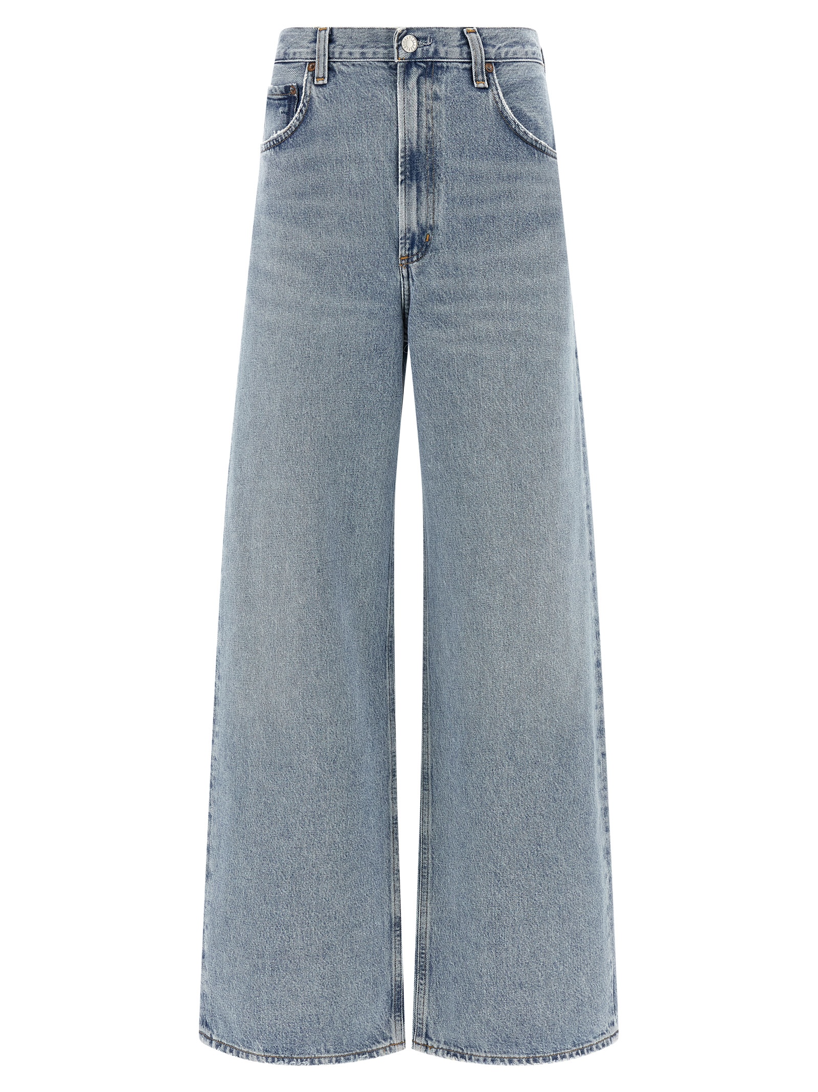 'Low Curve' vintage marbled light indigo denim jeans with discoloration and whiskering, mid waist, slightly tapered wide leg, zip and front button closure, five pockets. SUSTAINABLE: This product is made of regenerated cotton.