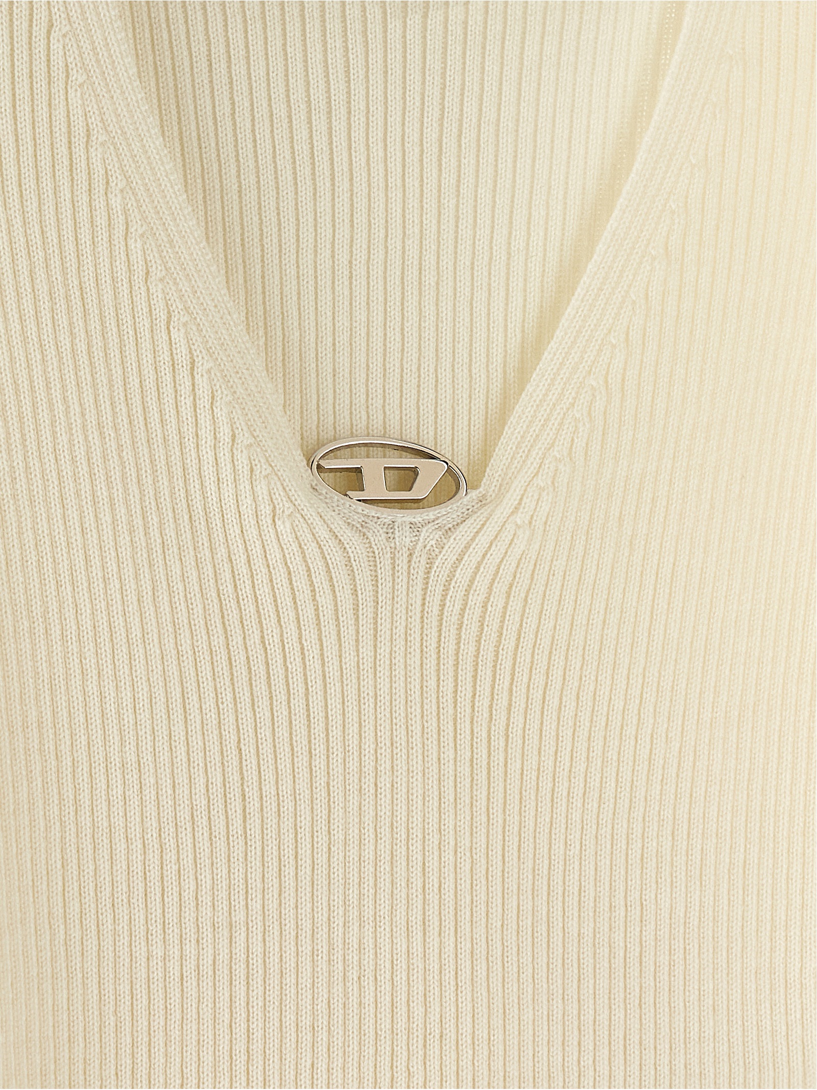 'M-Olive' ribbed stretch wool top with mock collar, front cut-out with metal Oval D appliqué, short sleeves.