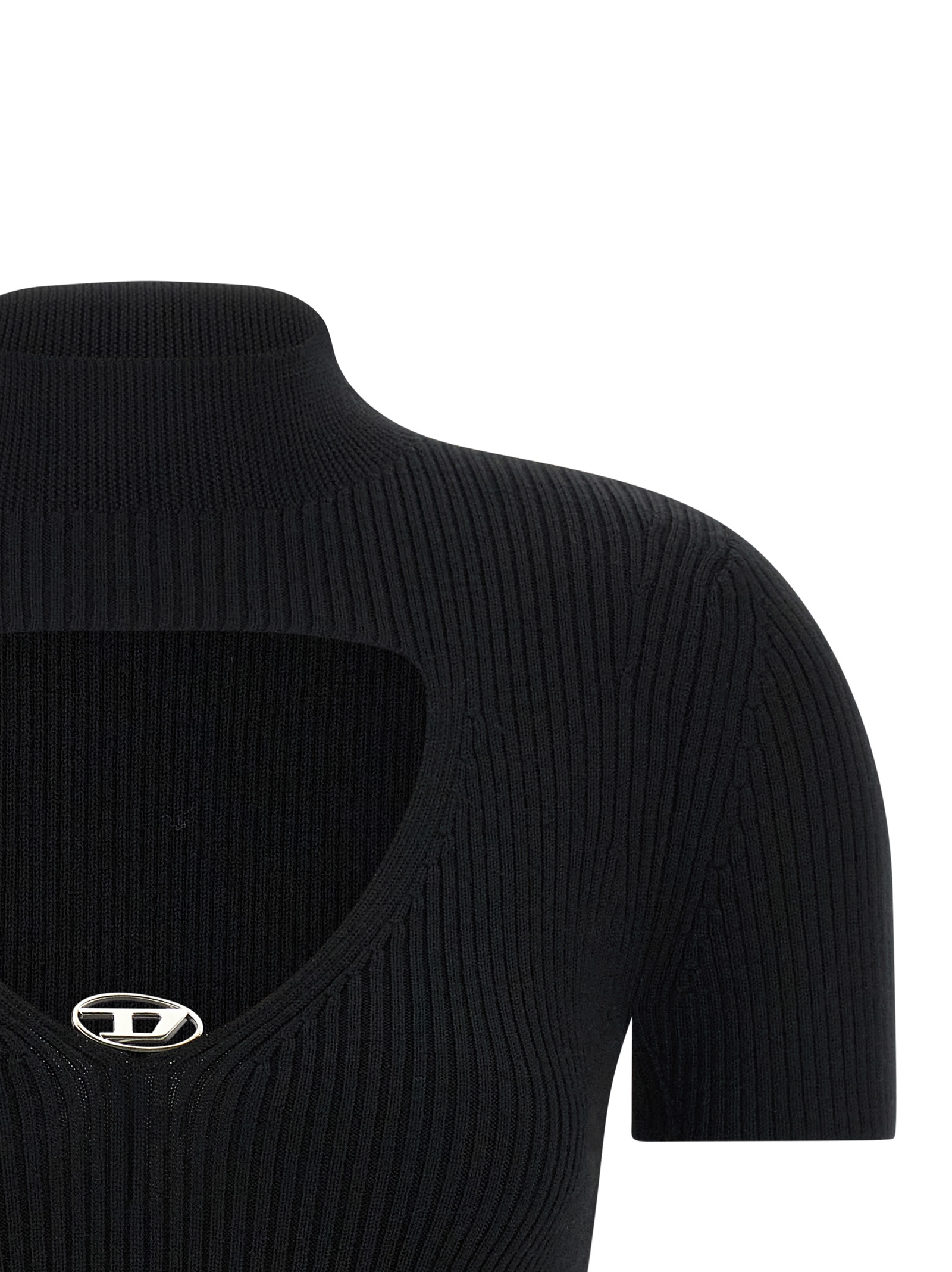 'M-Olive' ribbed stretch wool top with mock collar, front cut-out with metal Oval D appliqué, short sleeves.