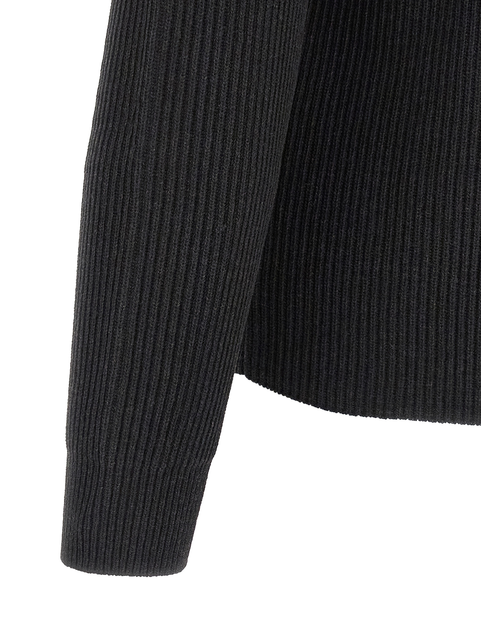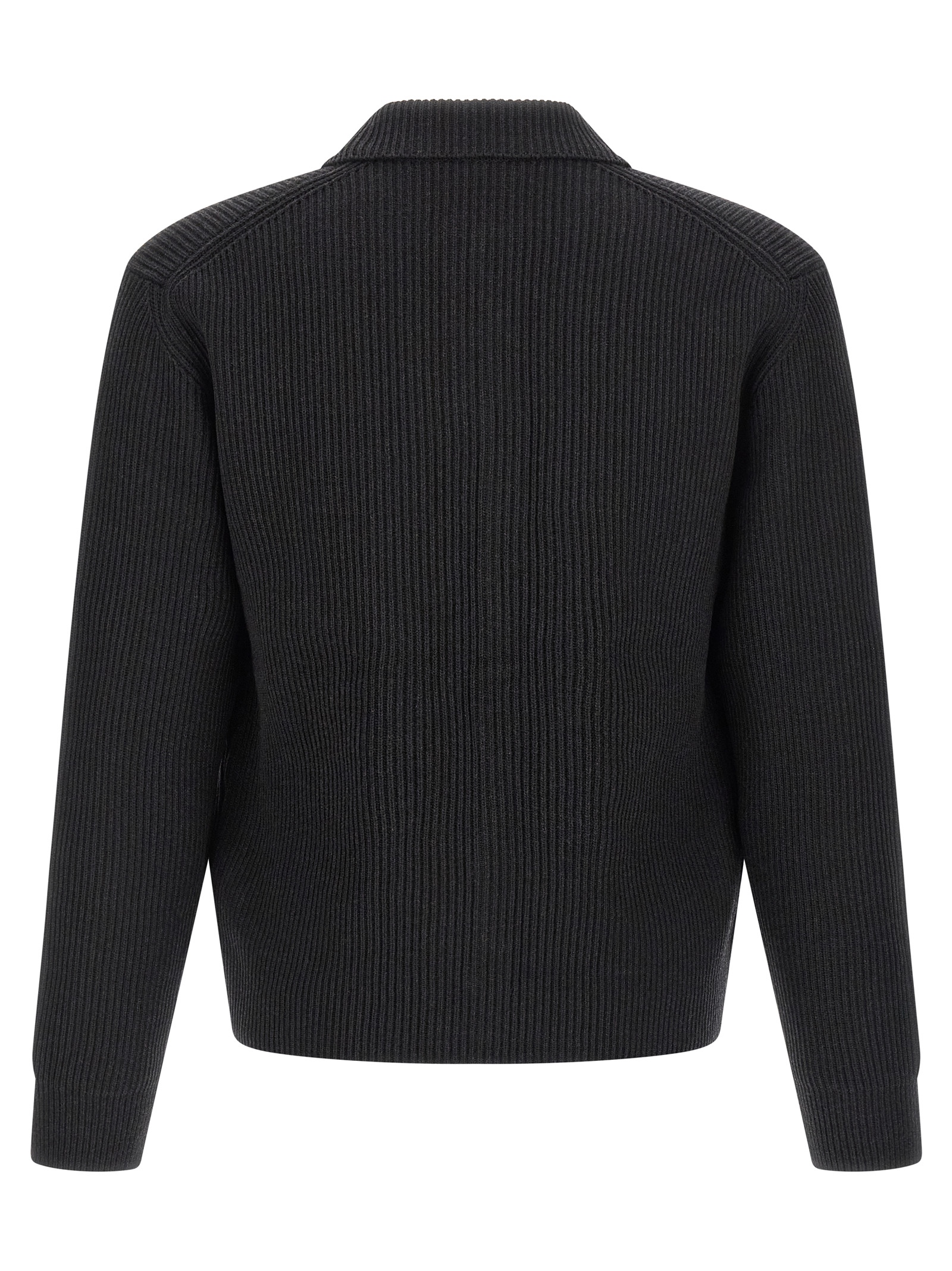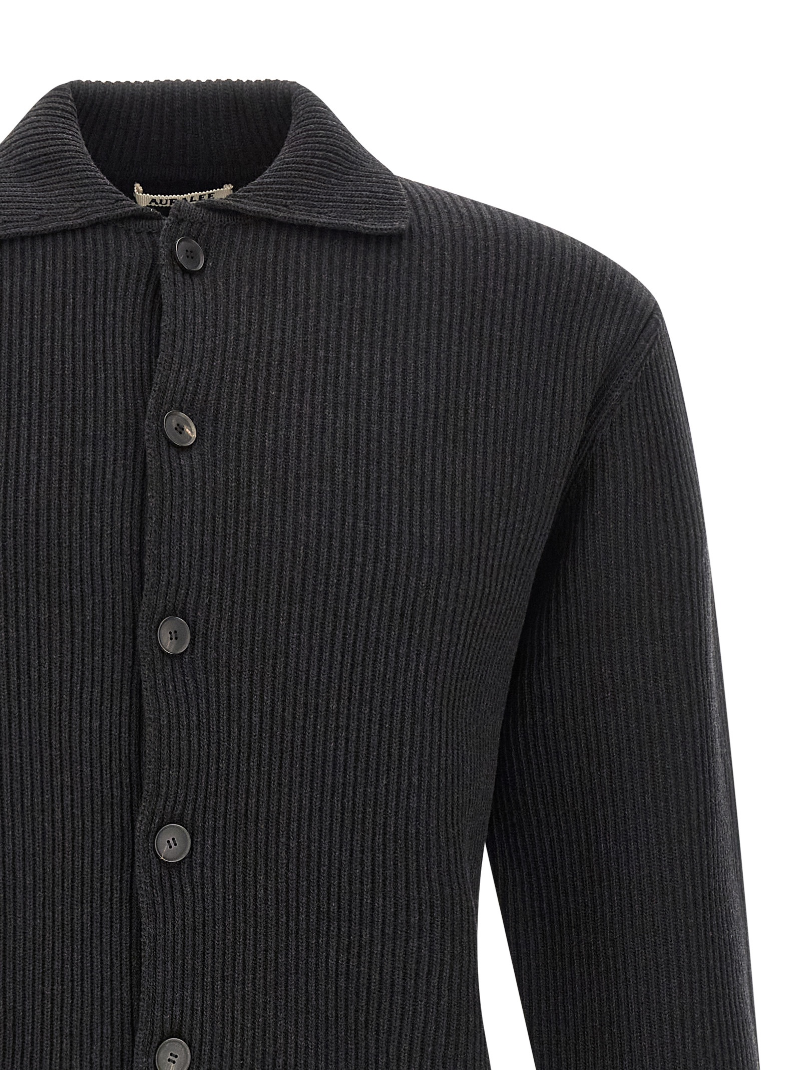 Super 160 ultra-fine knit cardigan with ribbed finish, shirt collar, front button closure, long cuffed sleeves.