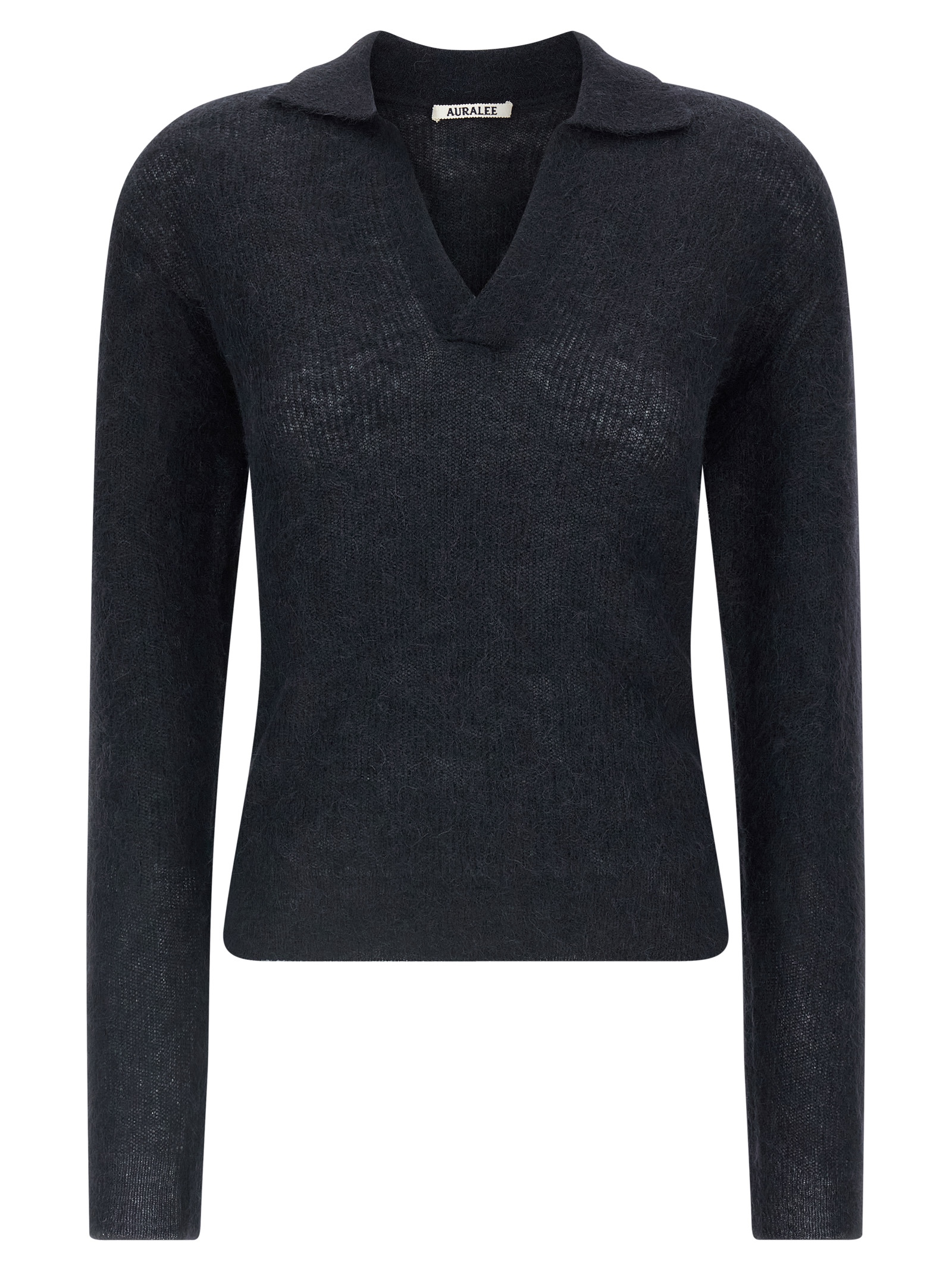 Polo shirt in precious tam yarn of rare suri baby alpacas, V-neck, collar, long sleeves with cuffs and dropped shoulder.