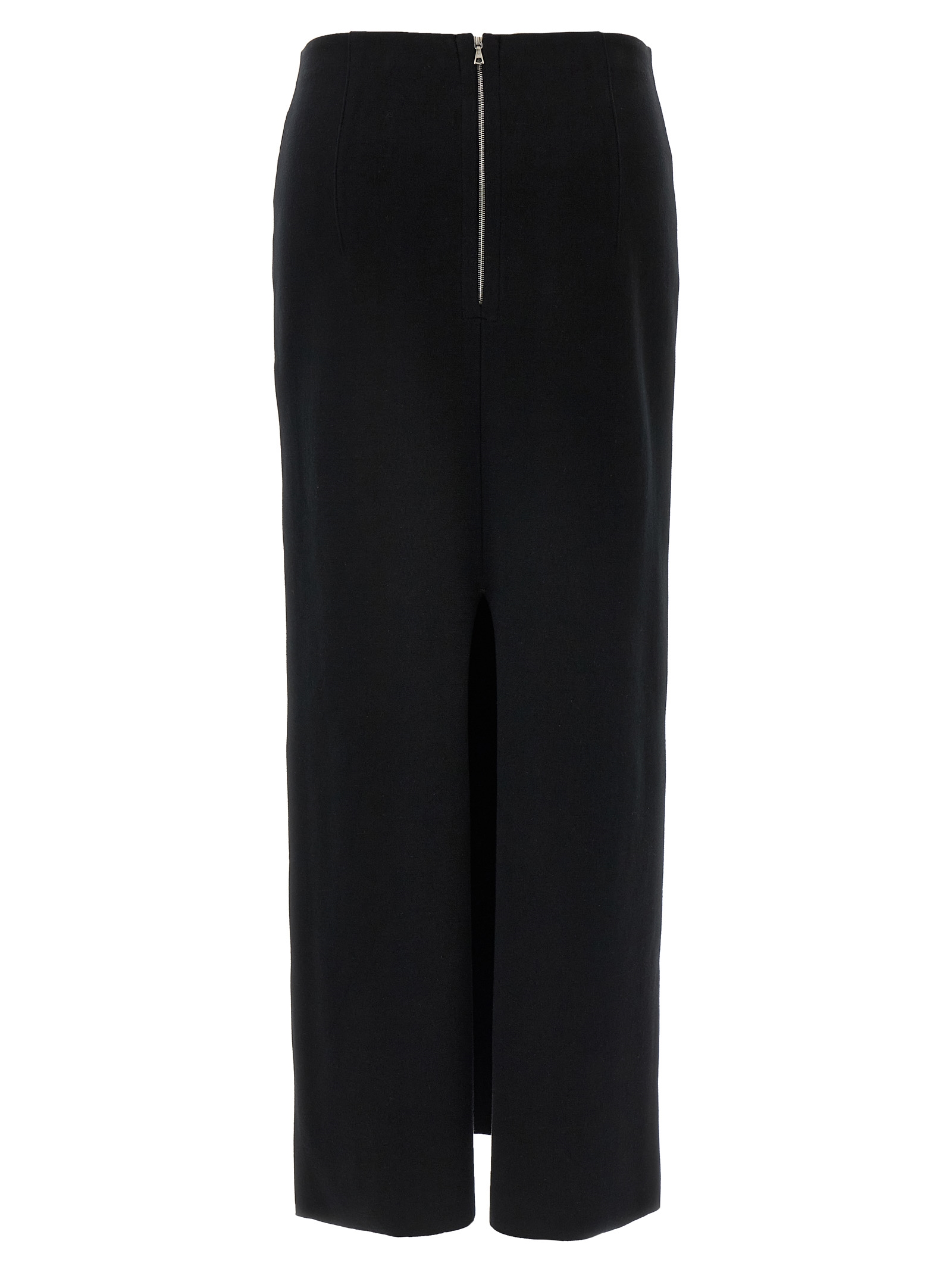 Long double-sided knitted skirt in yarn dyed with Supima cotton blend and silk with brushed finish and an elasticized yarn back, split and back zip closure.