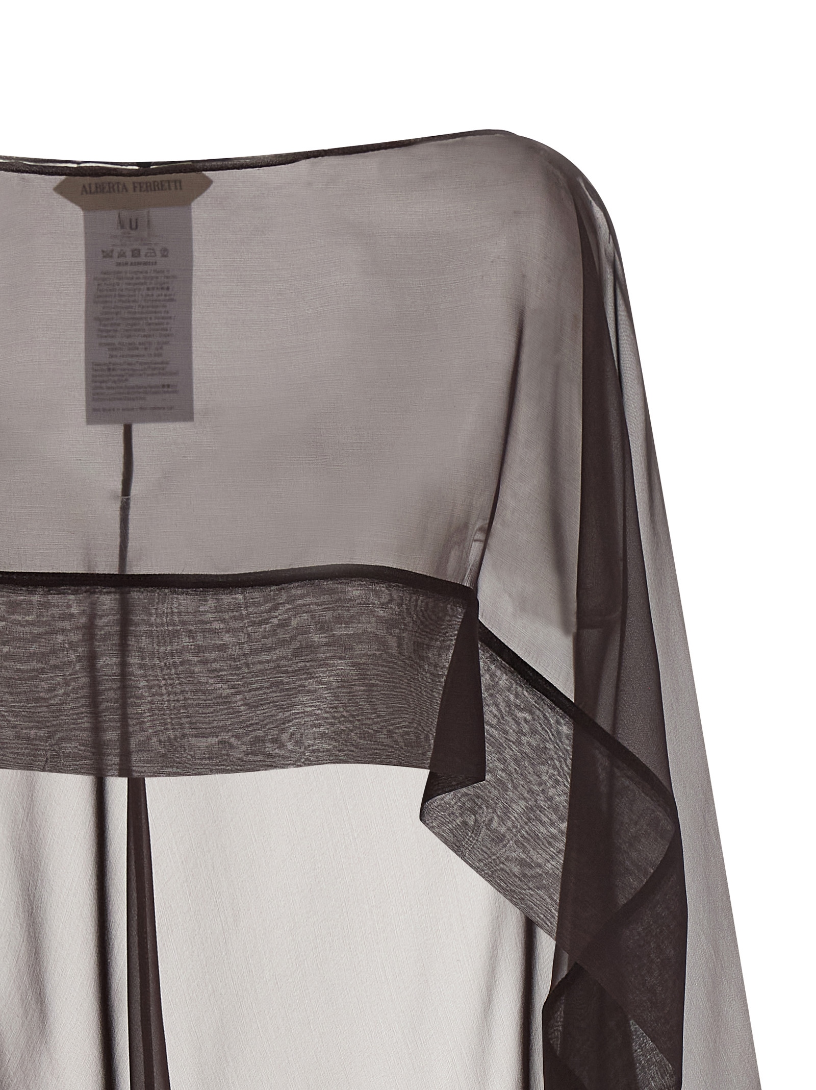Semi-transparent silk chiffon scarf, hood style with boat neckline and asymmetric hem.