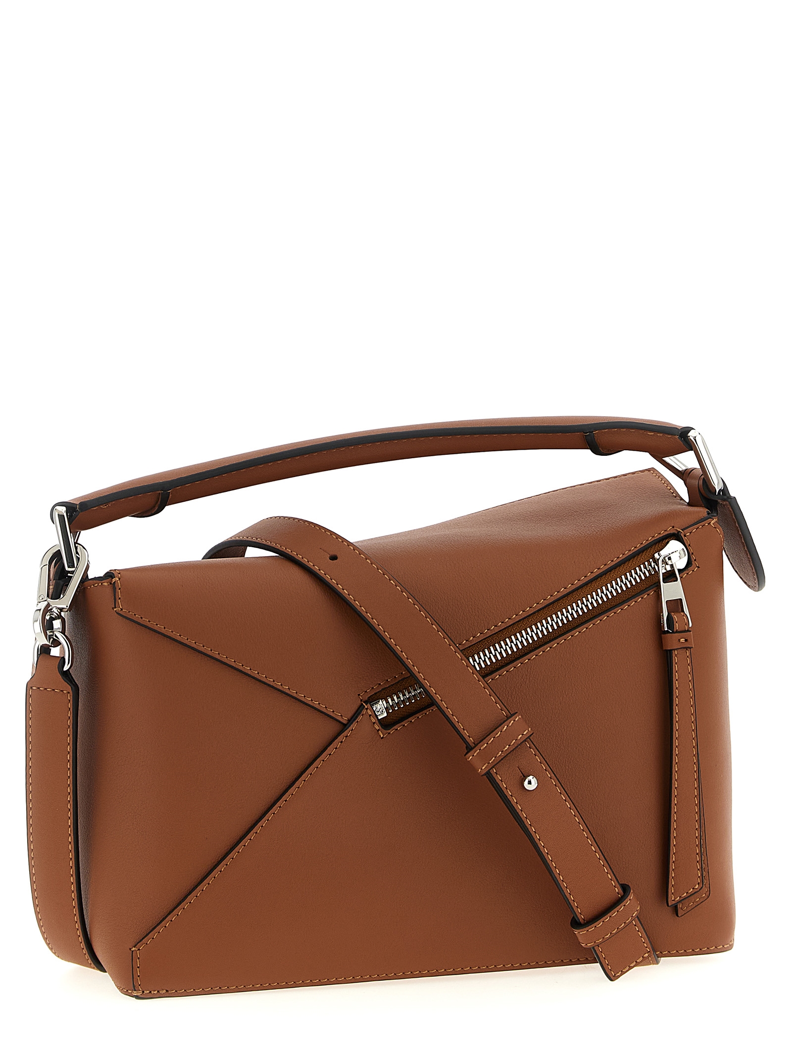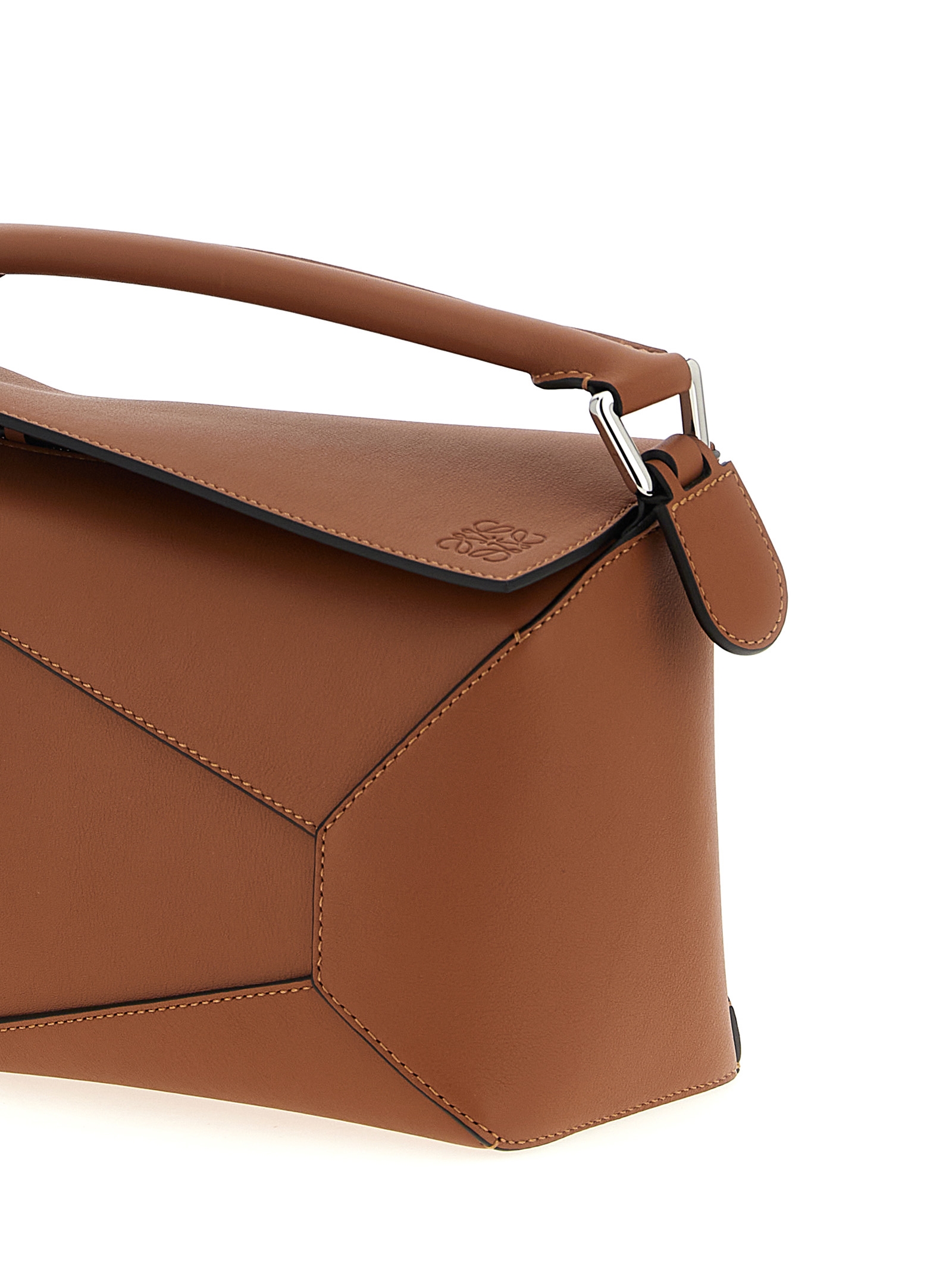 Small 'Puzzle Edge' smooth calf leather handbag, classic construction for overlapping panels with single-line stitching, fixed handle, flap closure with embossed Anagram logo and hidden zip underneath, back zip pocket, herringbone cotton canvas lining, adjustable and removable shoulder strap.