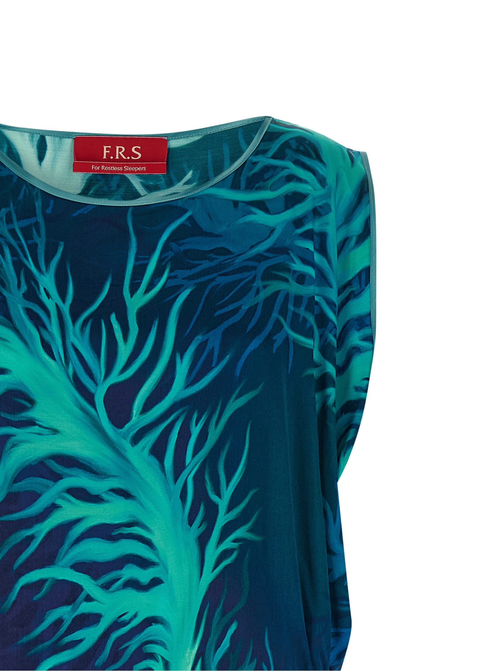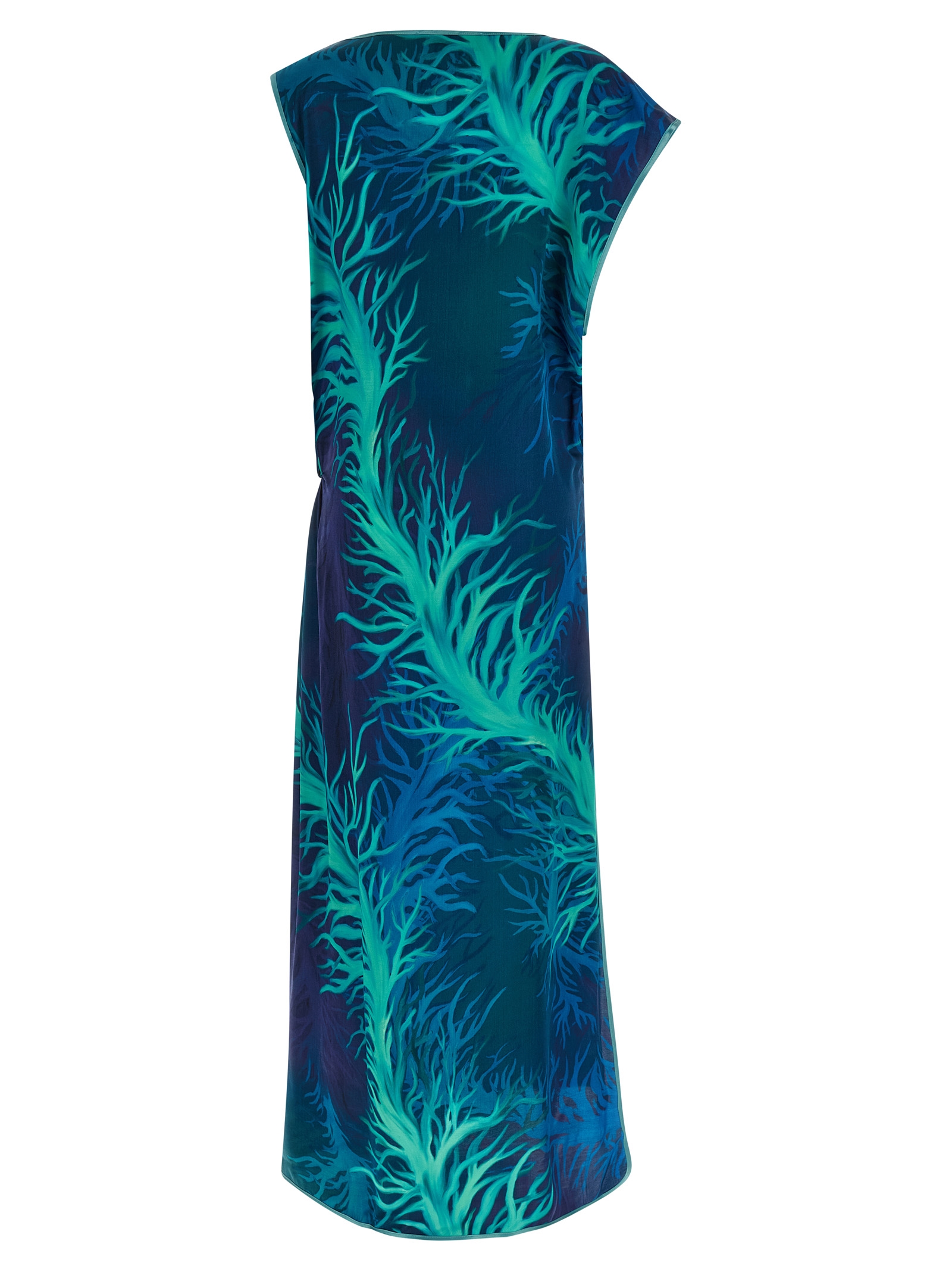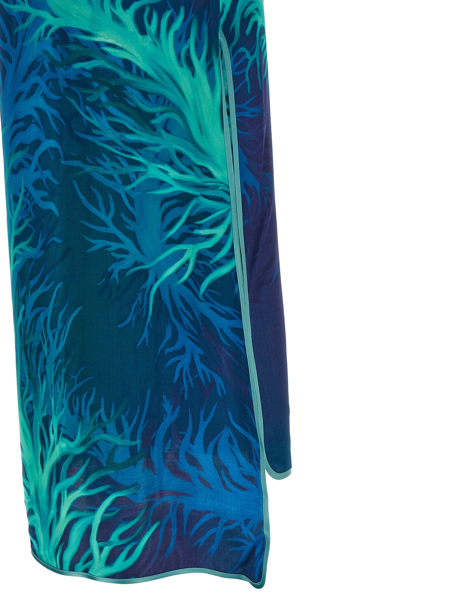 'Briseide' long dress in silk viscose satin with 'Corals Blue' print, solid color piping, asymmetrical construction, draped waistband, round neckline, sleeveless, wide armholes, zip closure and wide side split.Характеристики товара