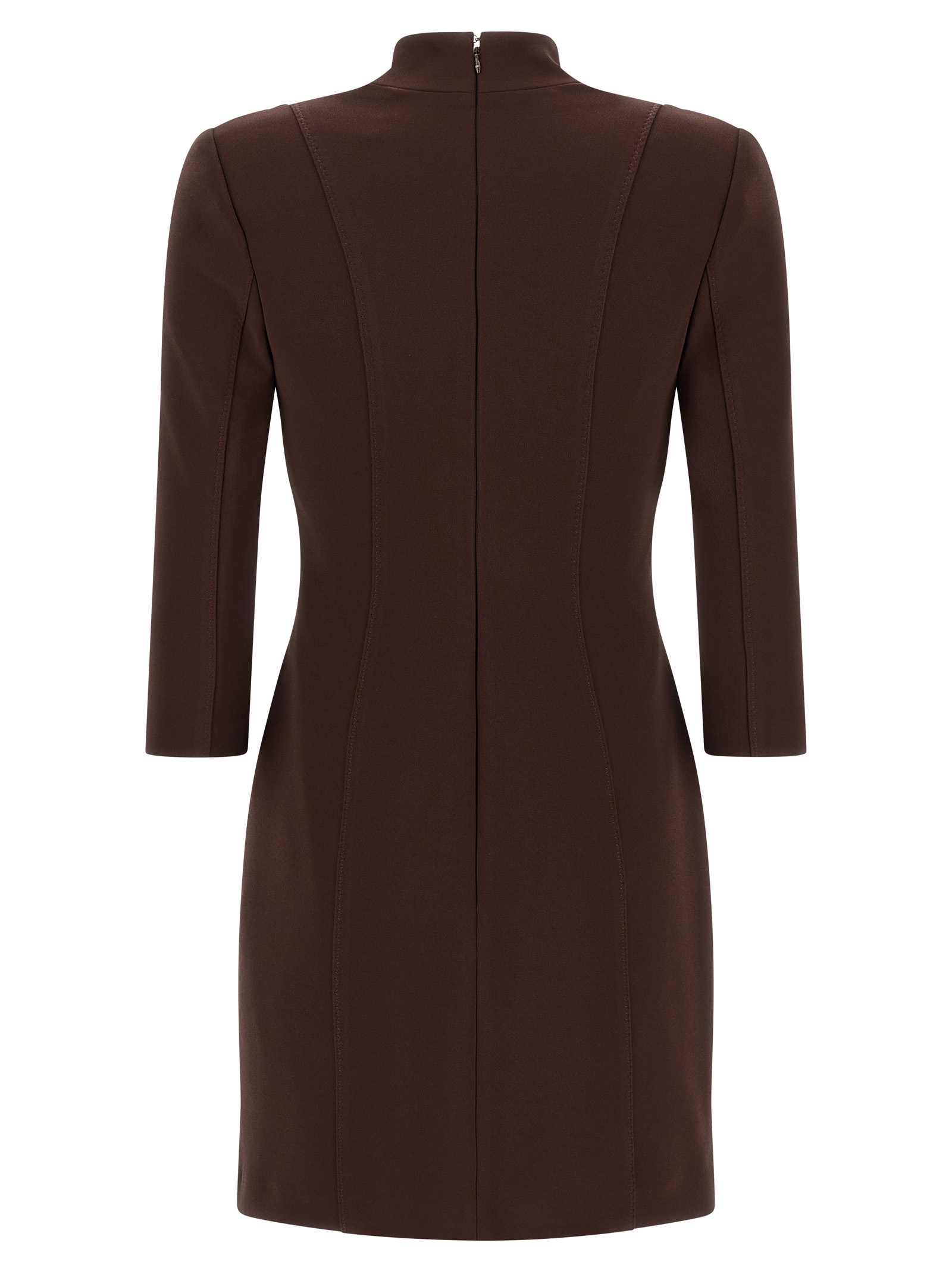 Double stretch crêpe mini dress, metal logo detail with adjustable elastic waistbands, corsetry-inspired model with front cups and zigzag stitching, tone-on-tone satin V-mount, structured shoulder straps, 3/4 sleeves, back zip closure, monogram satin lining.