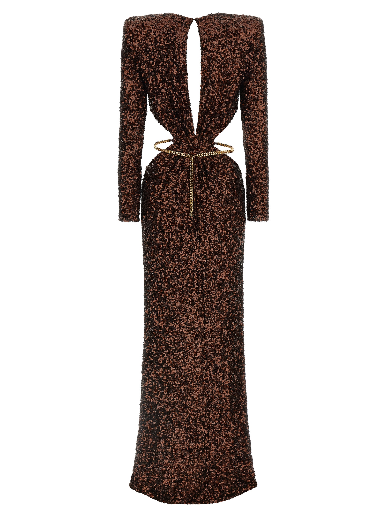 All-over sequined fabric Red Carpet dress, wide front V-neck, back button closure with teardrop cut-out detail, padded shoulders, long sleeves, side cut-out details, jewel chain belt with removable engraved logo, wide front slit, and knit lining.