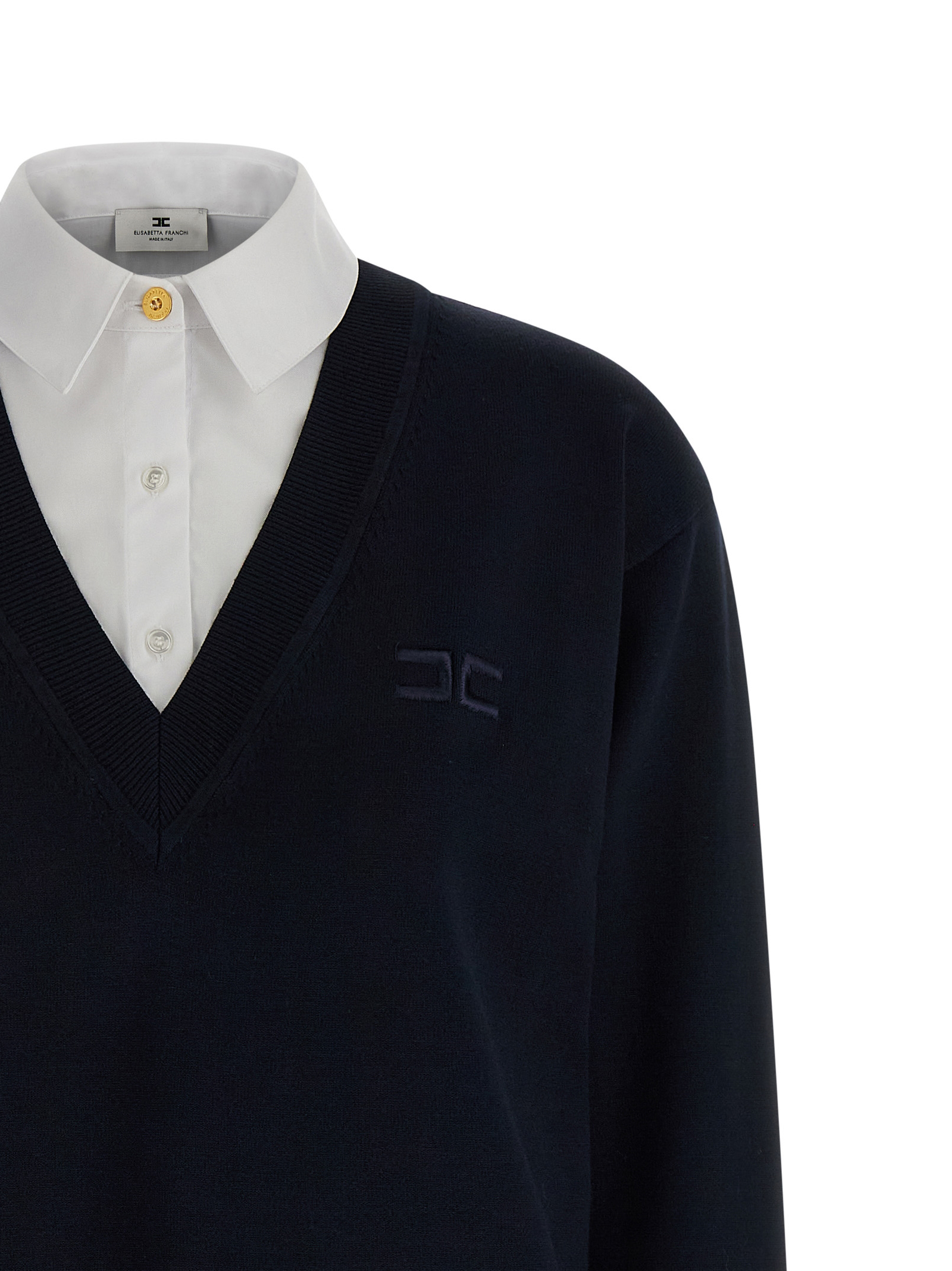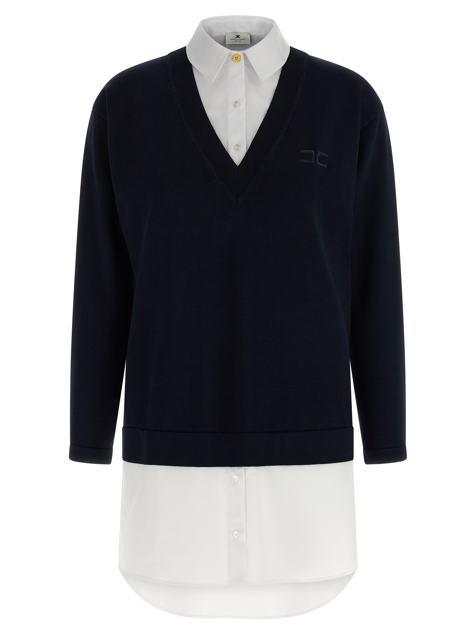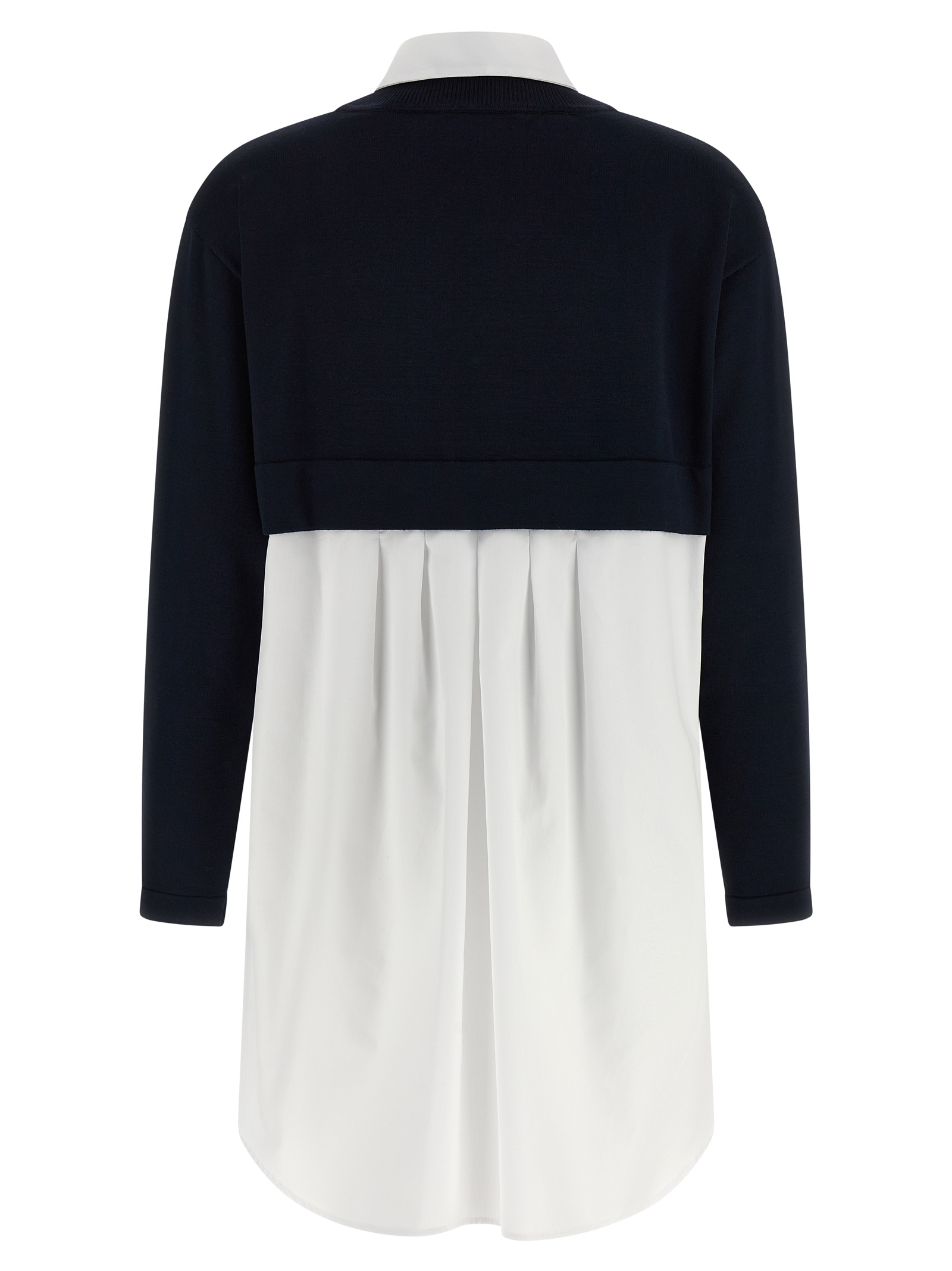 Mini dress, knit and cotton poplin with multi-layer effect consisting of V-neck knit shirt, front button closure, long sleeves.