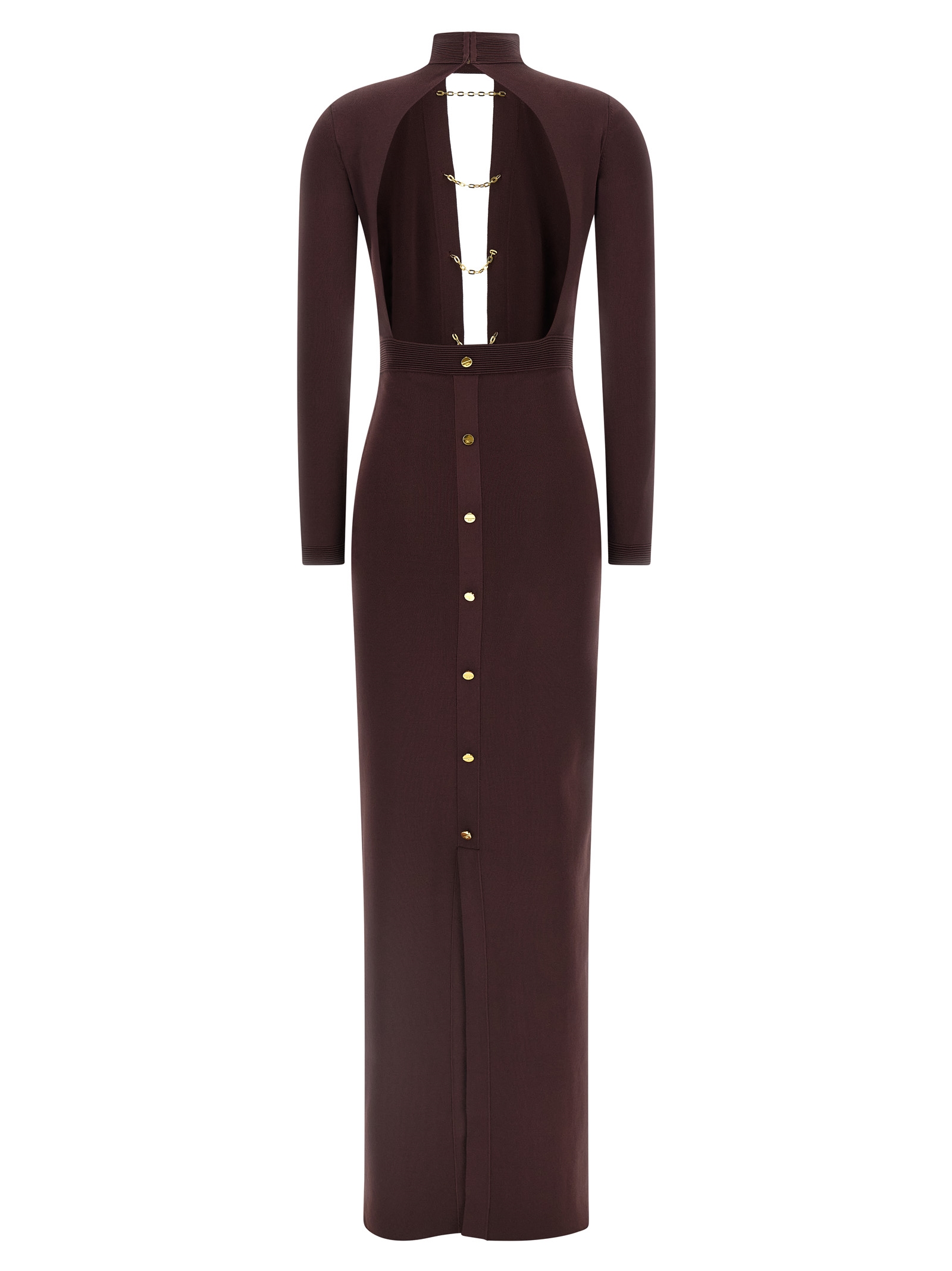 Long viscose knit Red Carpet dress, high neck with back hook closure, wide front cut-out with jewel cufflinks with metal chain, long sleeves, tube skirt with metal buttons and back split, porthole on the back, side zip closure.