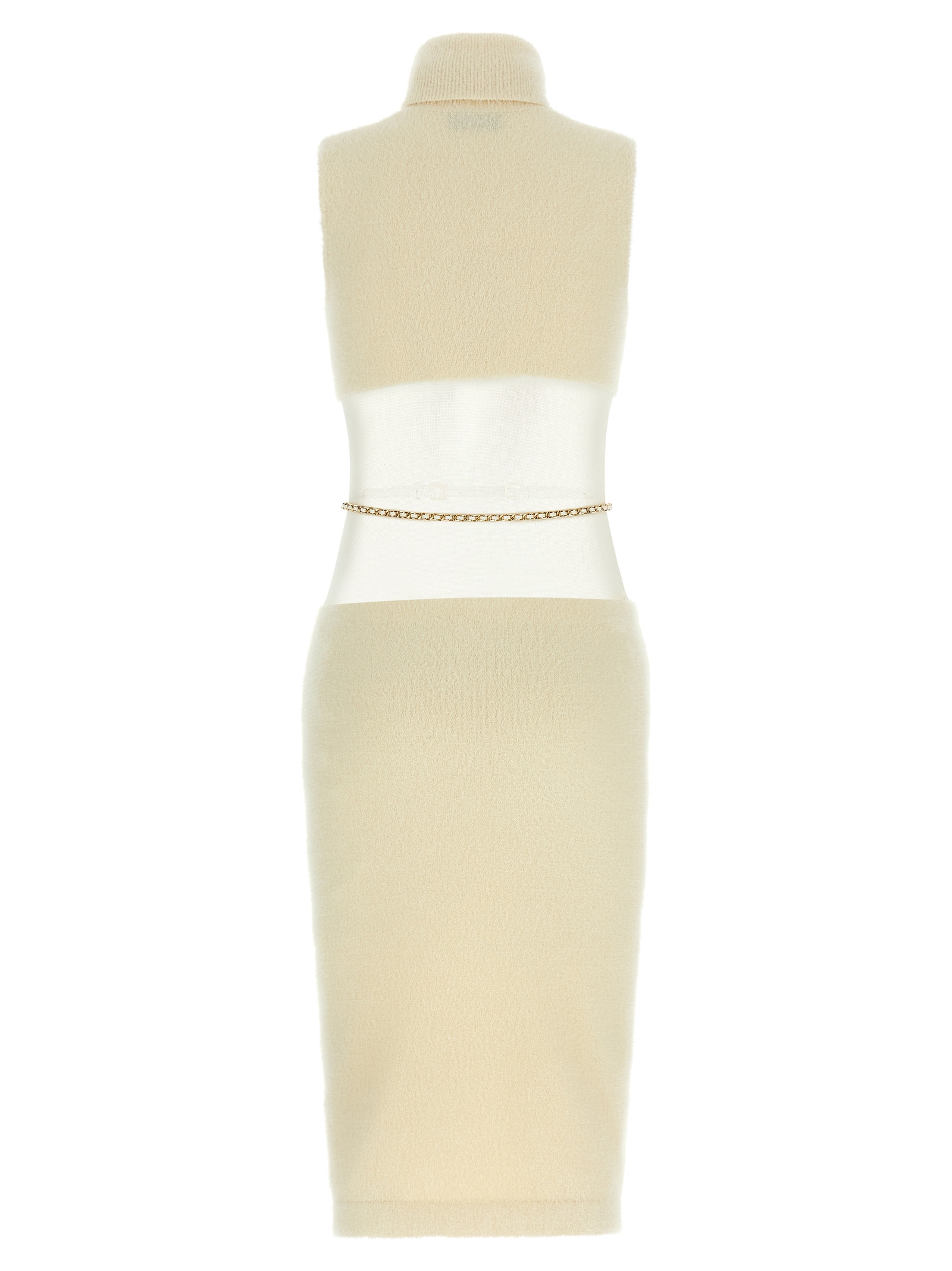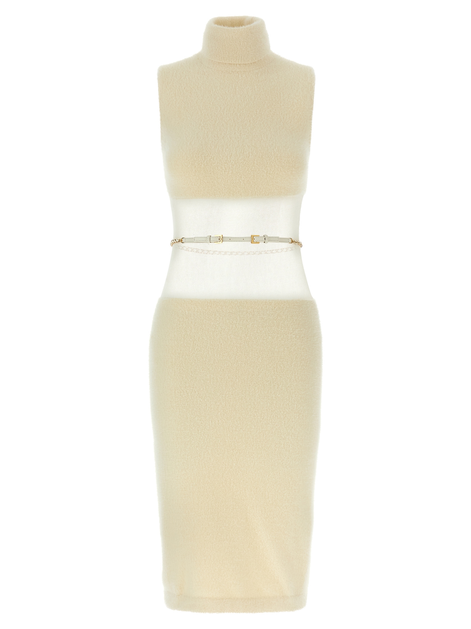 Fur-effect stretch knit midi dress with semi-transparent gauze insert at the waist, sleeveless turtleneck neck, longuette skirt, removable belt.Характеристики товара