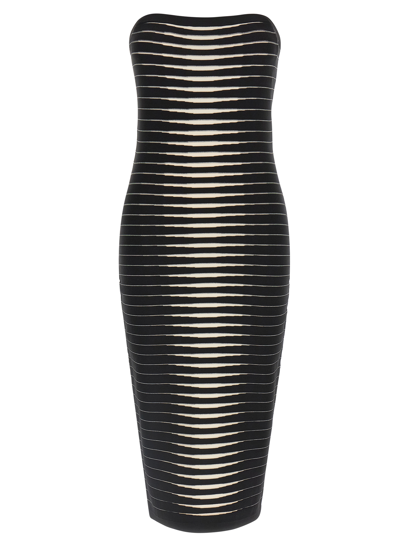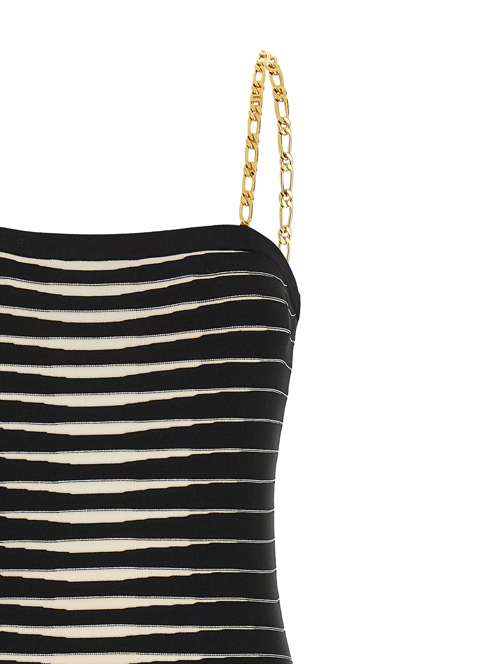 Midi dress in jacquard fabric that recreates a striped pattern dégradé zebra effect, off-the-shoulder bandeau model, removable metal chain braces, sleeveless.