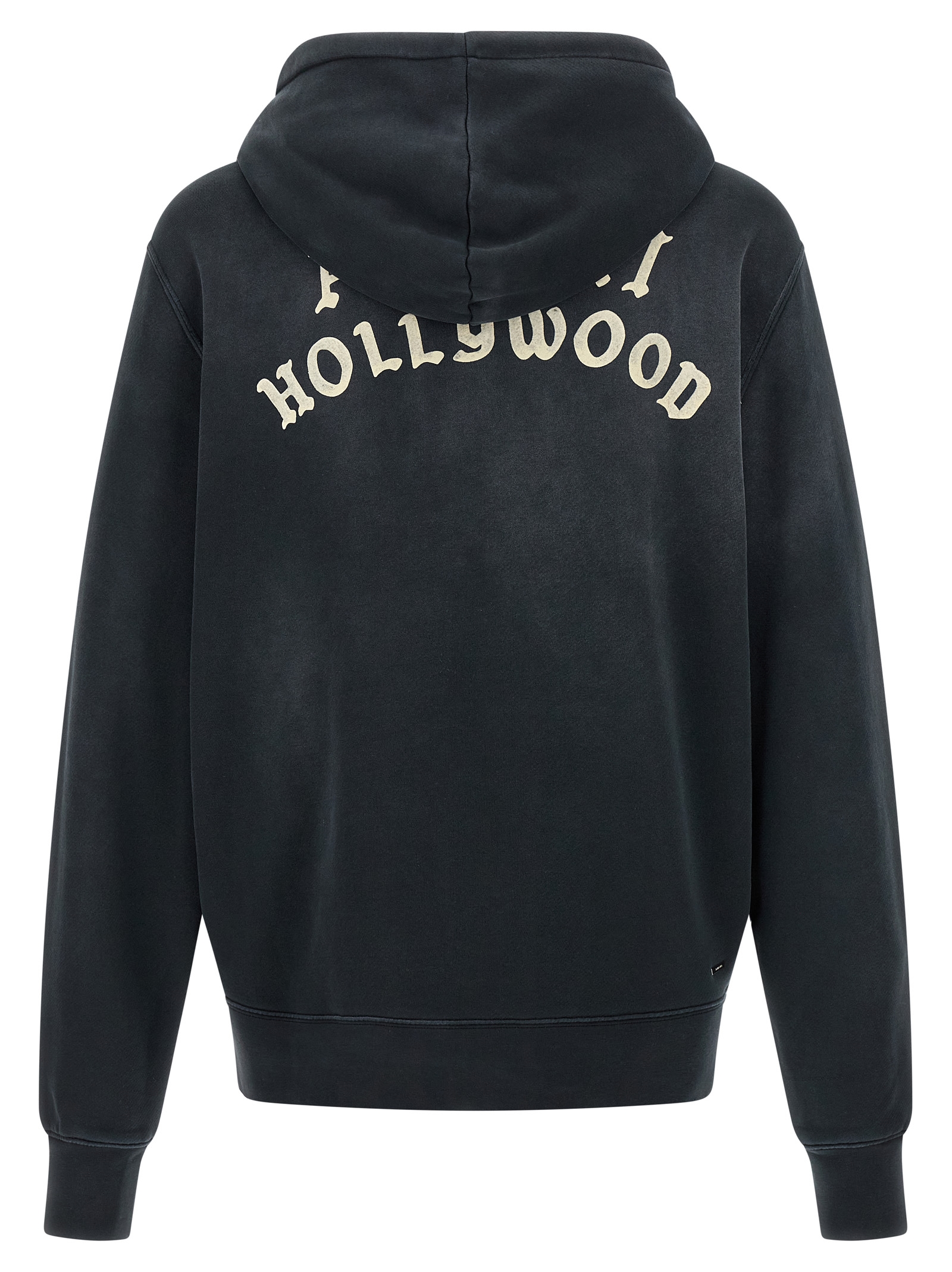 'Amiri Hollywood' gauze cotton hoodie with used effect washed, flocked logo on the front and back, front zip closure, pockets, long cuffed sleeves and dropped shoulders.