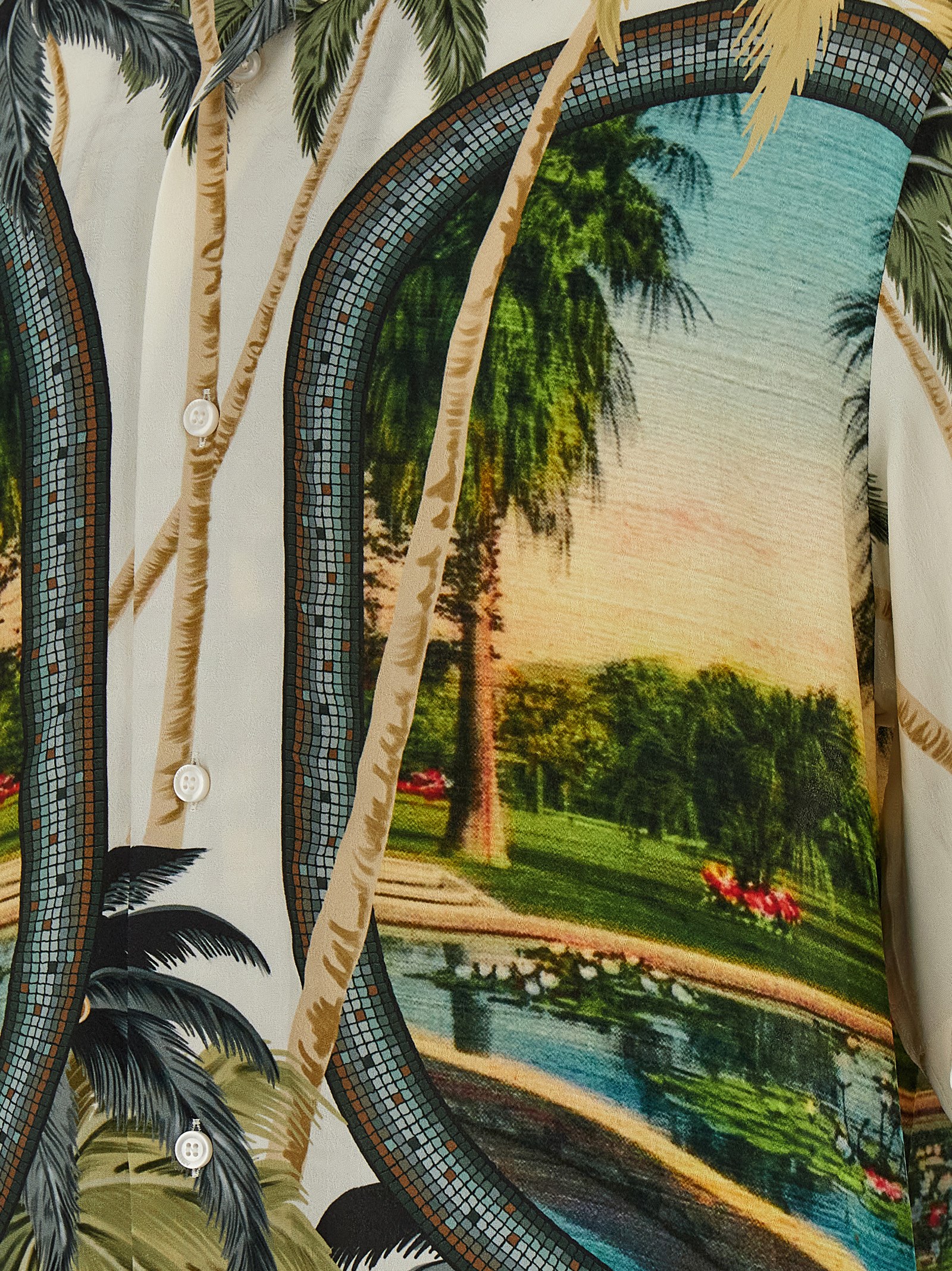'Paradise Bowling' silk-effect fabric shirt with all-over print, V-neck style with resealable lapels with button, front button closure, short sleeves.