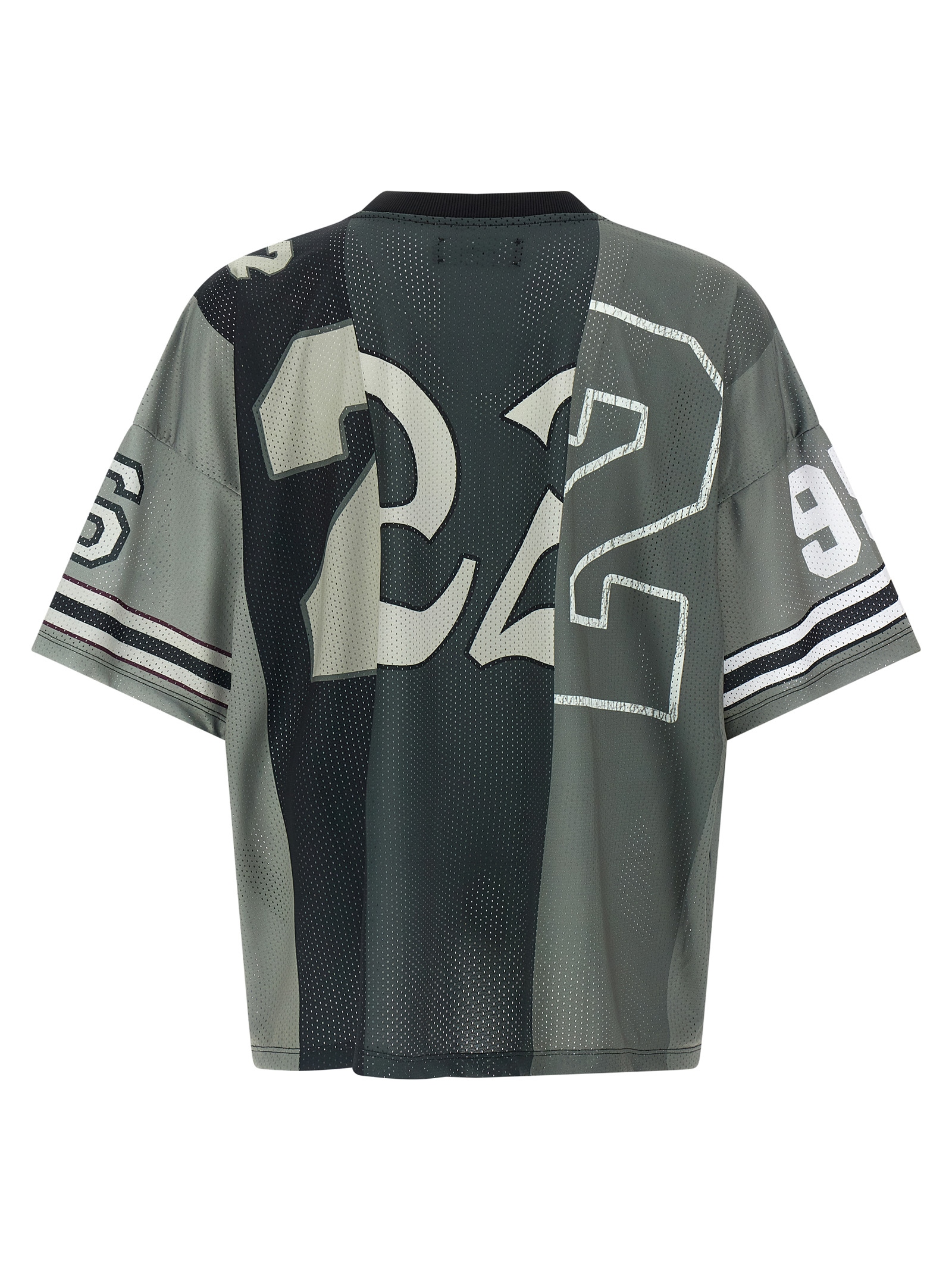 'Spliced' mesh T-shirt, patchwork construction with all-over graphic print, V-neck, short sleeves with dropped shoulders. This garment has undergone a special process that has resulted in intentional variations in shades and colors and adds unique characteristics to the garment.