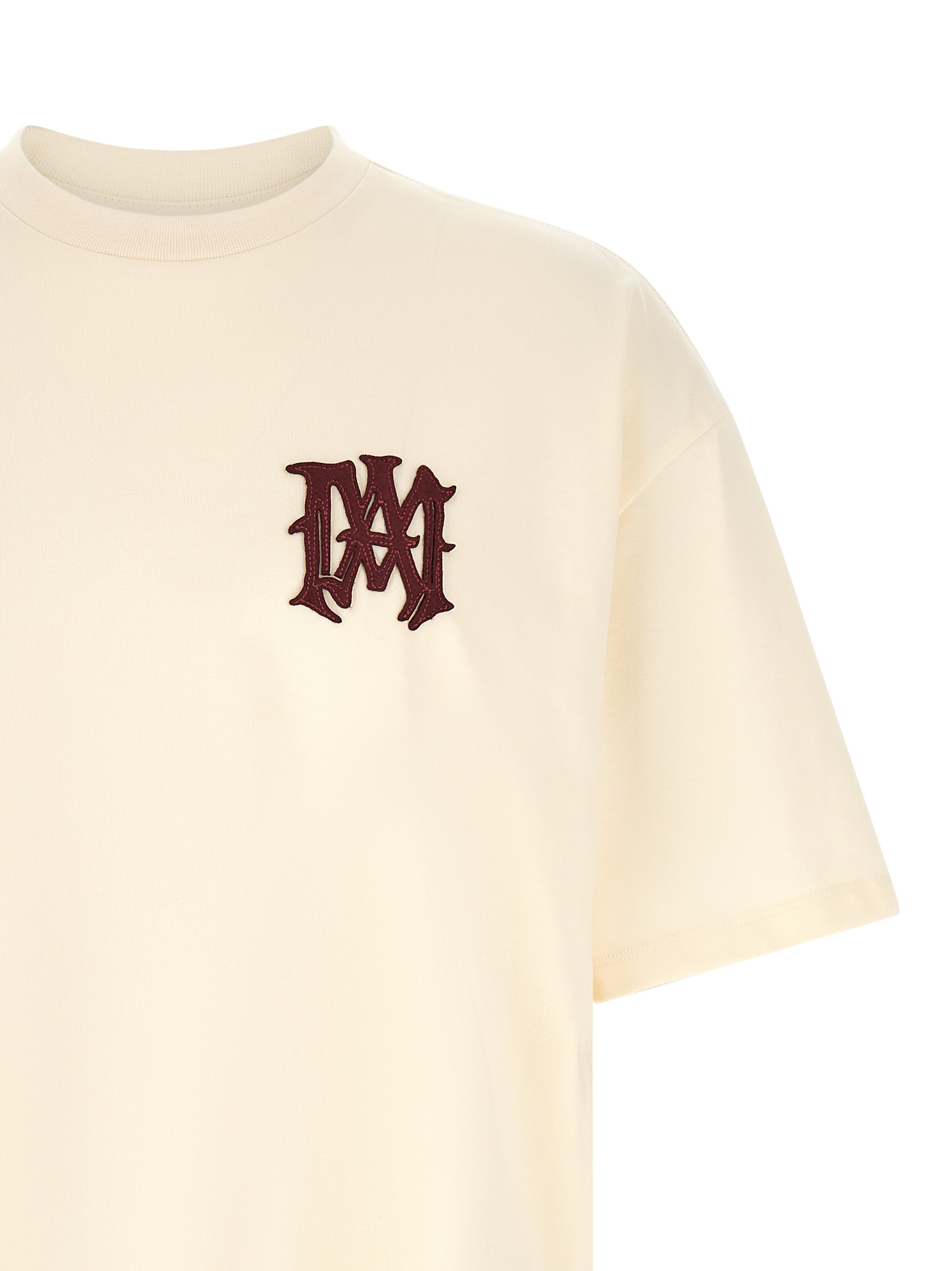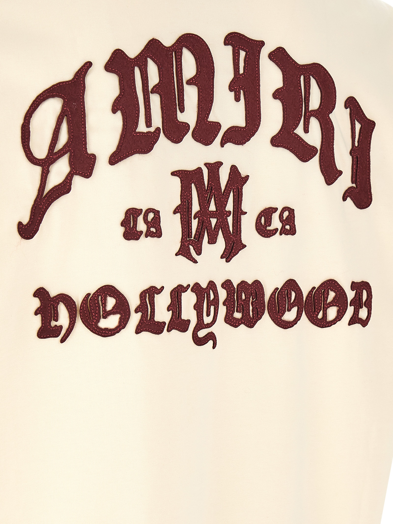 'Amiri Hollywood' sun-faded treated cotton t-shirt, felt patch on the front and back, crew neck, short sleeves with dropped shoulders. This garment has undergone a special process that has resulted in intentional variations in shades and colors and adds unique characteristics to the garment.