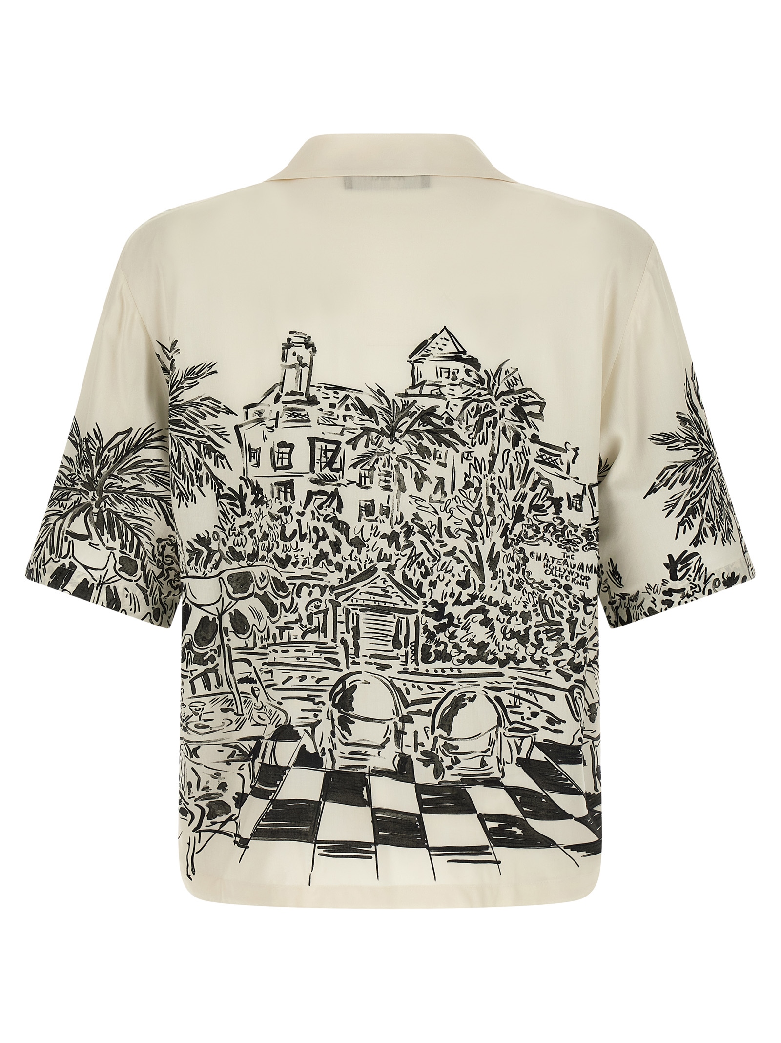 'Chateau Sketch' patterned silk bowling shirt, logo embroidery and front mother-of-pearl button closure, short sleeves. with dropped shoulders. This garment has undergone a special process that has resulted in intentional variations in shades and colors and adds unique characteristics to the garment.