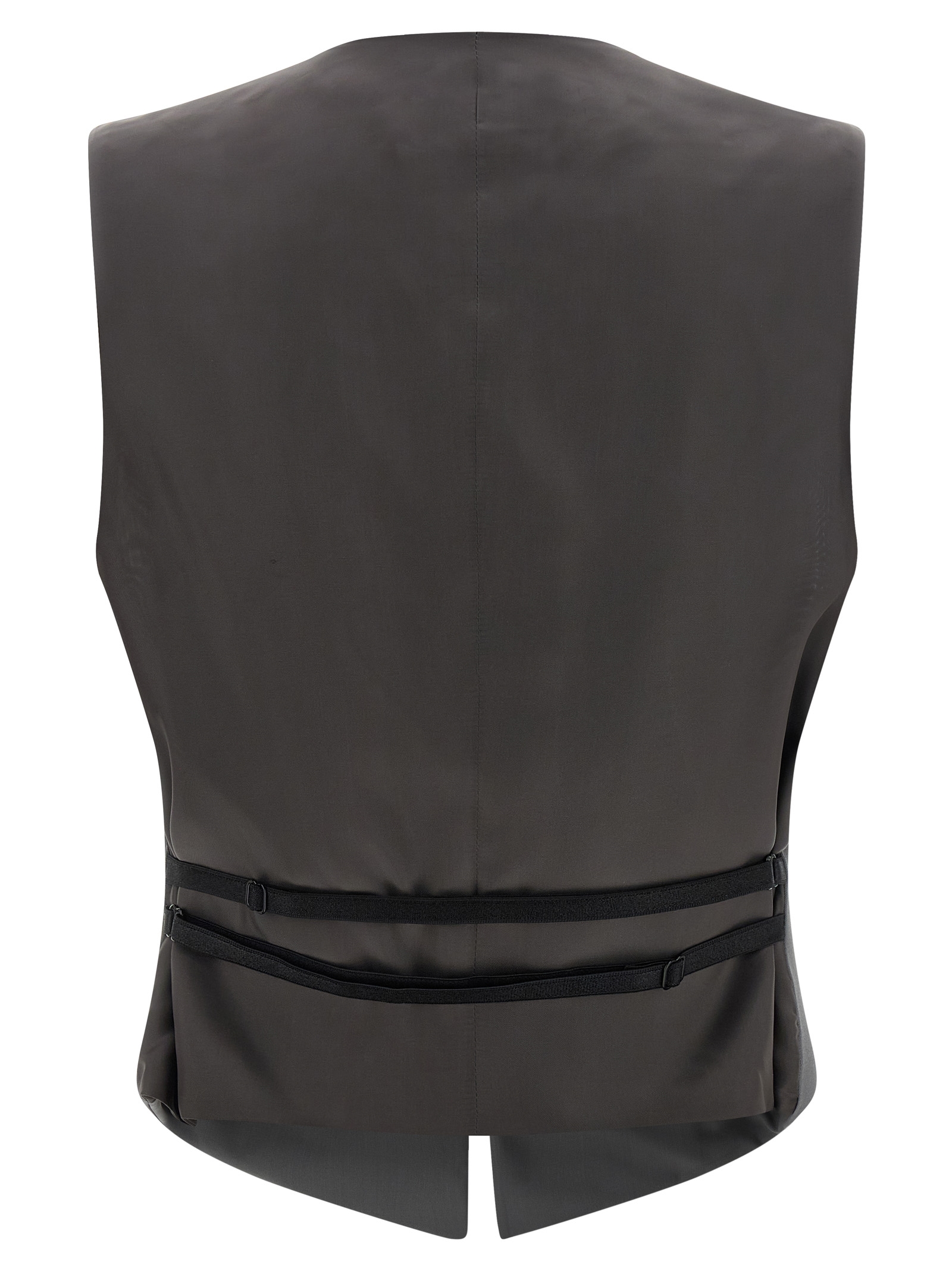 Virgin wool 'Guia' vest with V-neck with concealed hook closure, satin back panel, sleeveless, and adjustable elastic band at the waist.