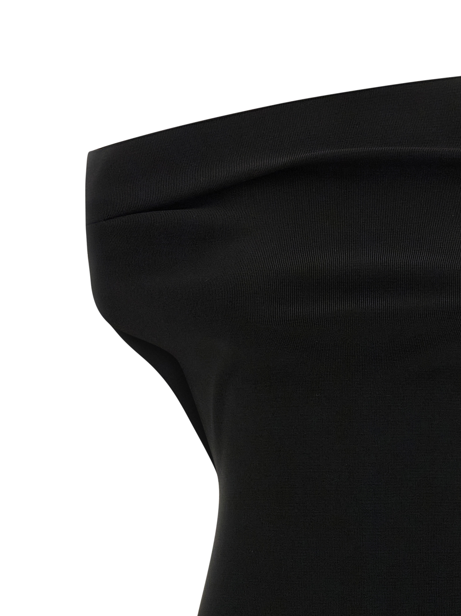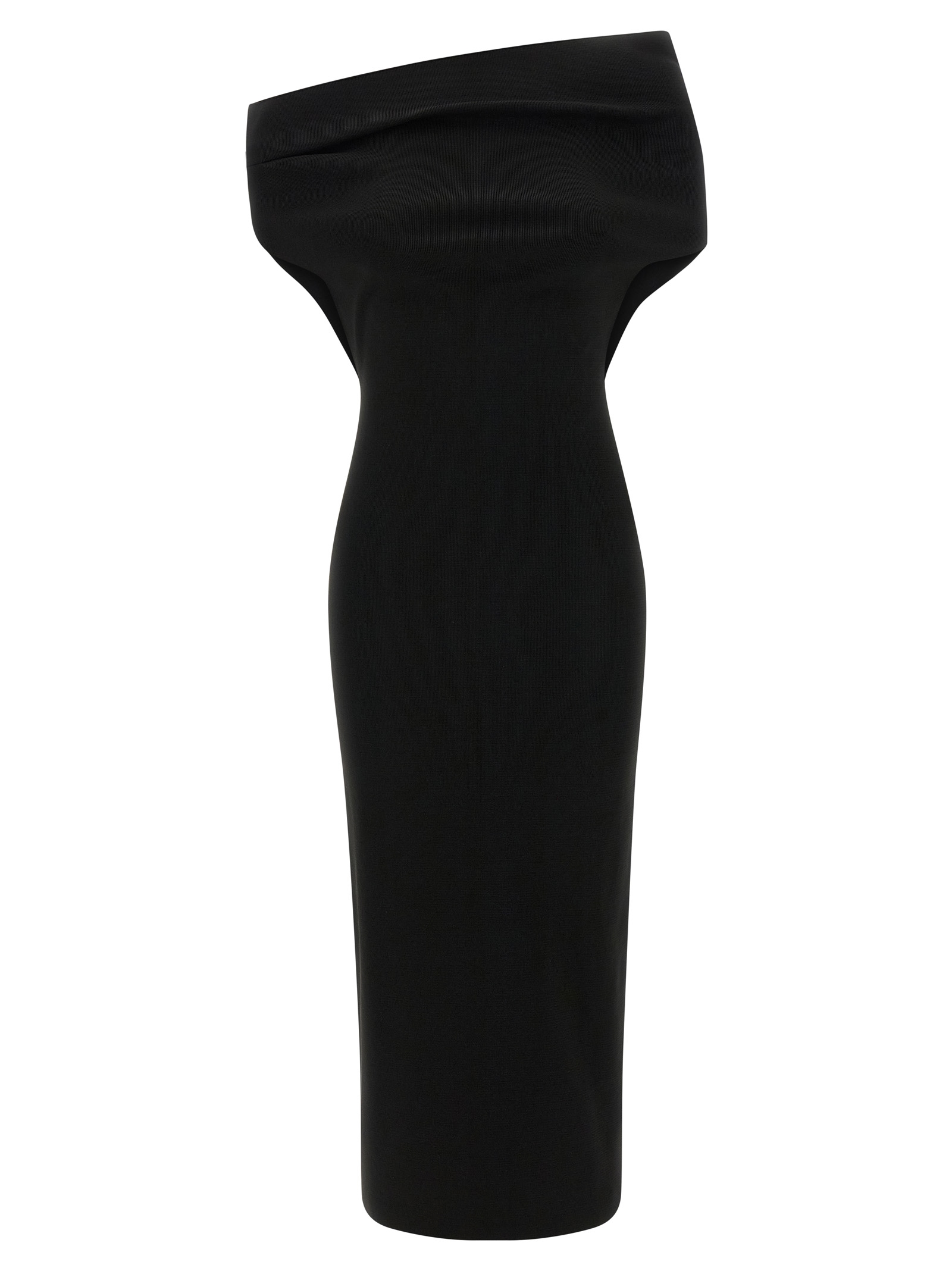 'Debra' off-the-shoulder midi dress in stretch viscose knit with modular shawl shoulders, short sleeves, sheath skirt.