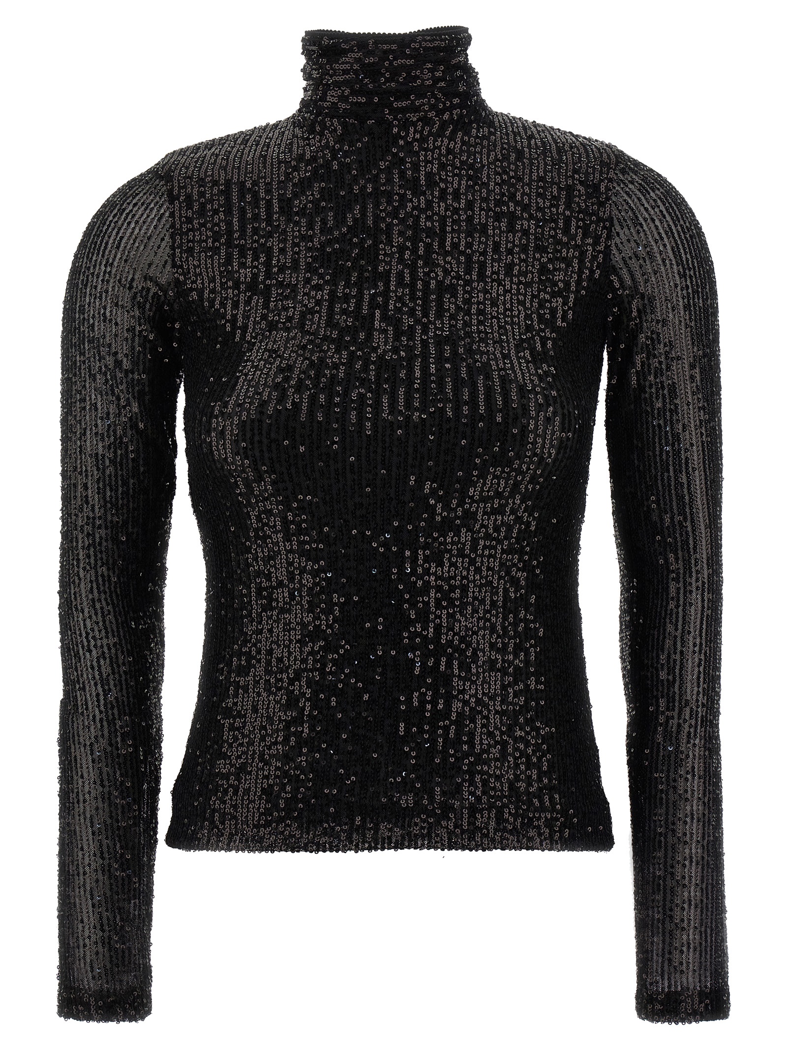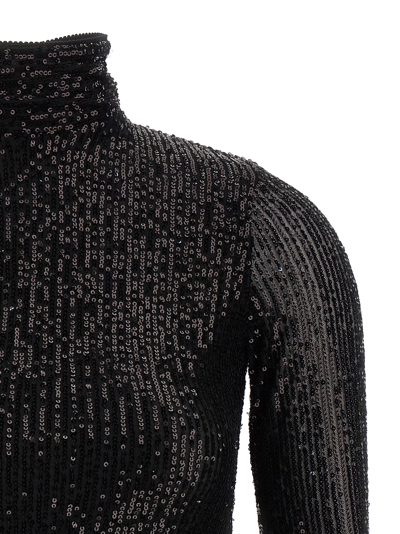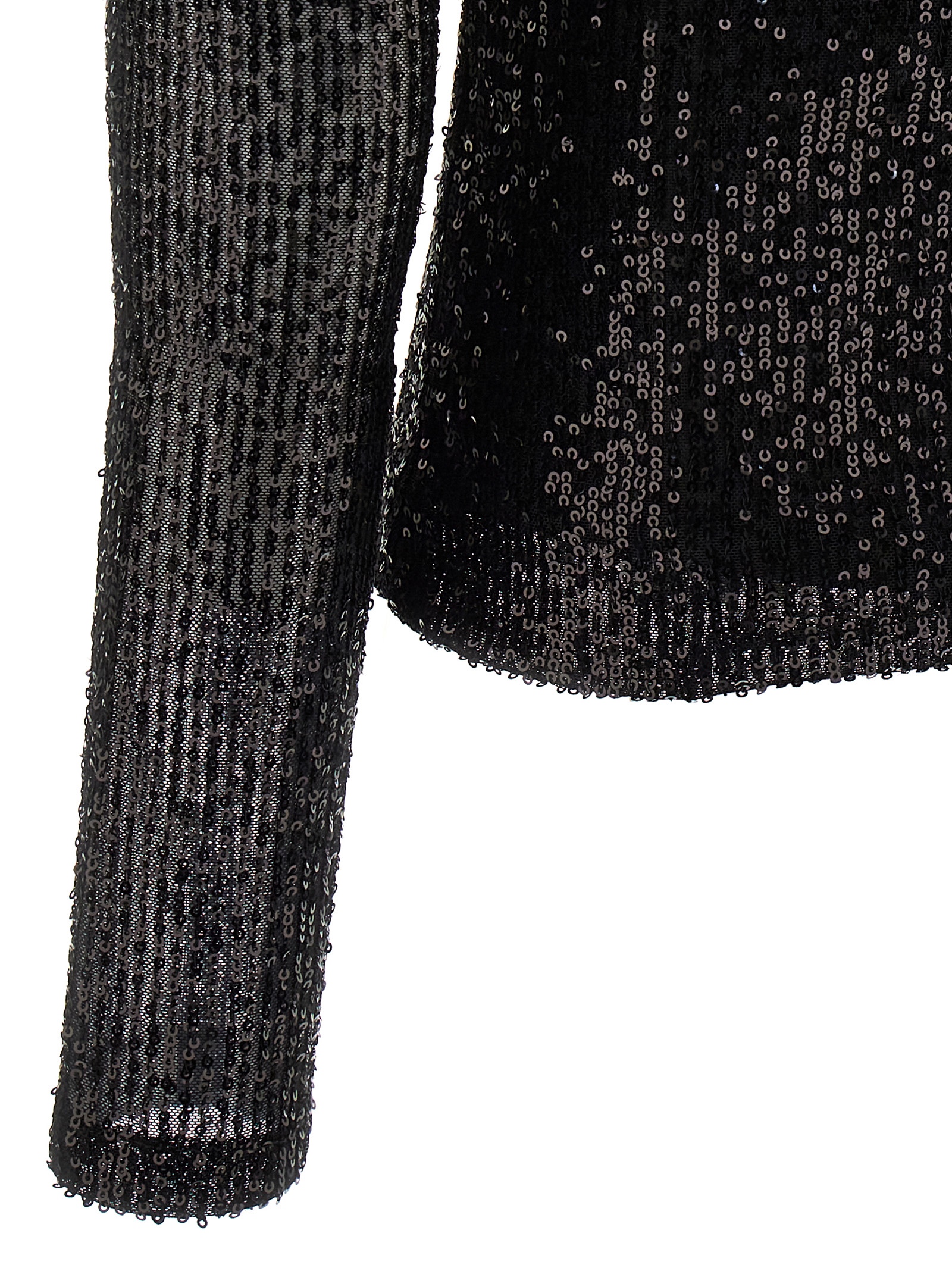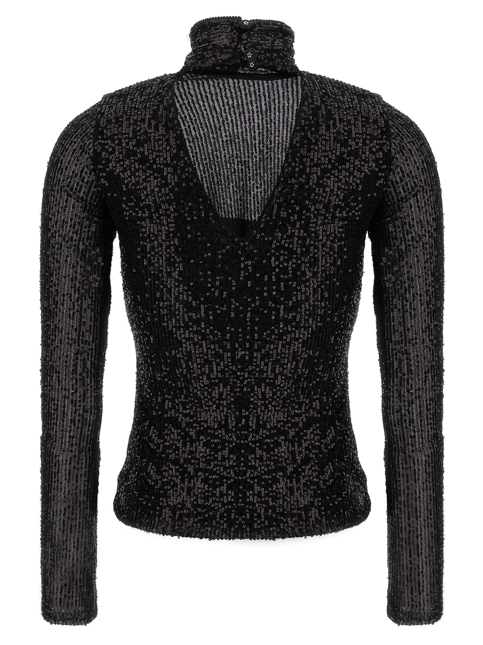 'Assisi' top with all-over sequins, high neck, long sleeves, cut out detail at the back.