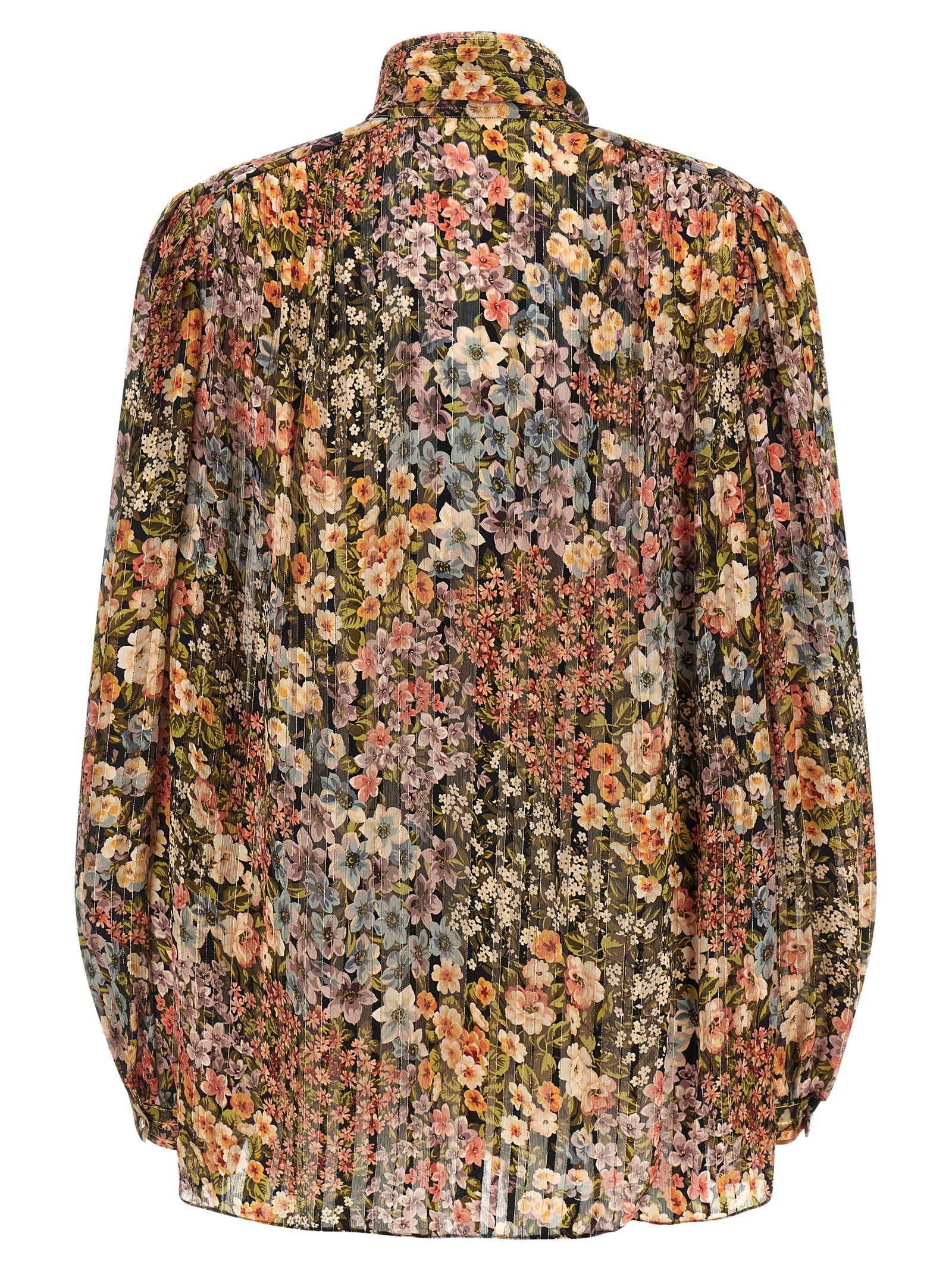 All-over 'Après l'hiver - Fiorellini' print semi-transparent silk shirt with lamé thread, lavallière collar, front button closure, long puff sleeves with cuffs.