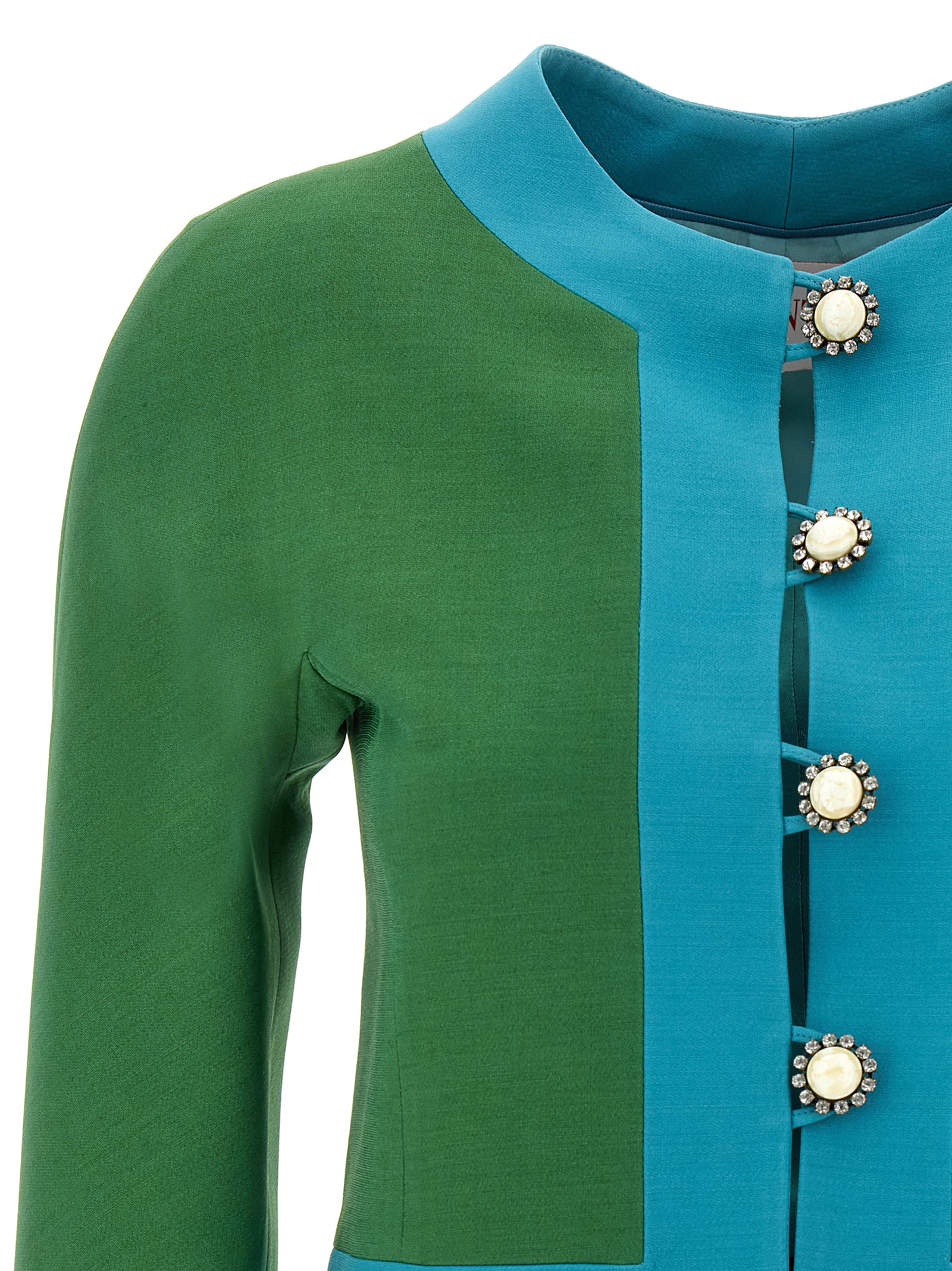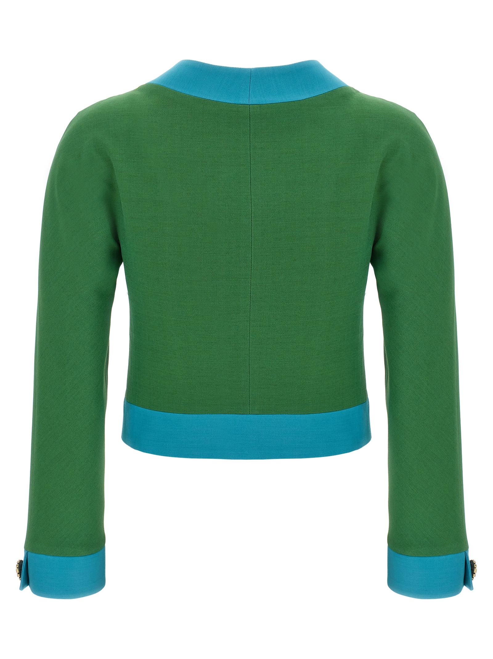 'Solid' blazer in wool and silk crepe couture with contrast piping, bolero model, front jewel button closure, crew neck, long cuffed sleeves.Характеристики товара
