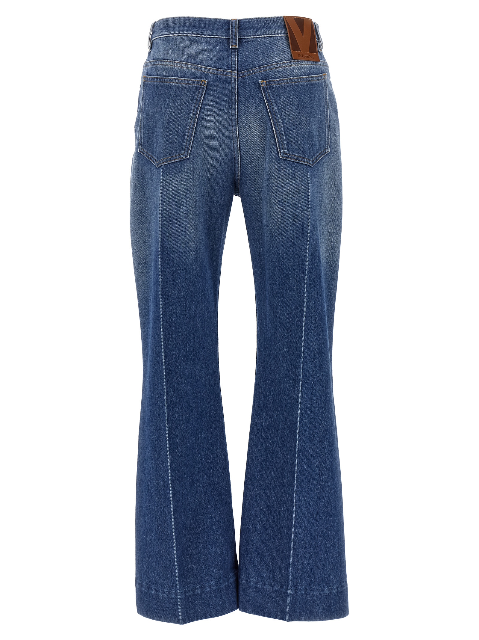 Flared leg cotton denim jeans with delavé effect wash with front stretched pleat, zip and button closure, pockets.