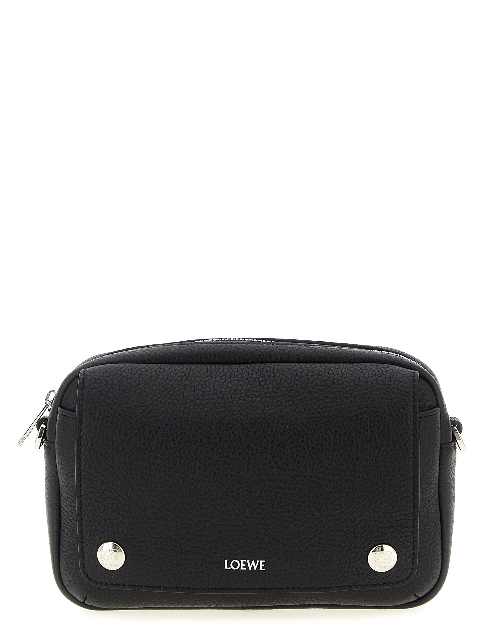 Small 'Messenger Pebble' crossbody bag in grenade calf leather, top zip closure, front pocket with magnetic flap closure with embossed logo and double metal Anagram Pebble emblem, adjustable and removable ribbon shoulder strap with jacquard logo.