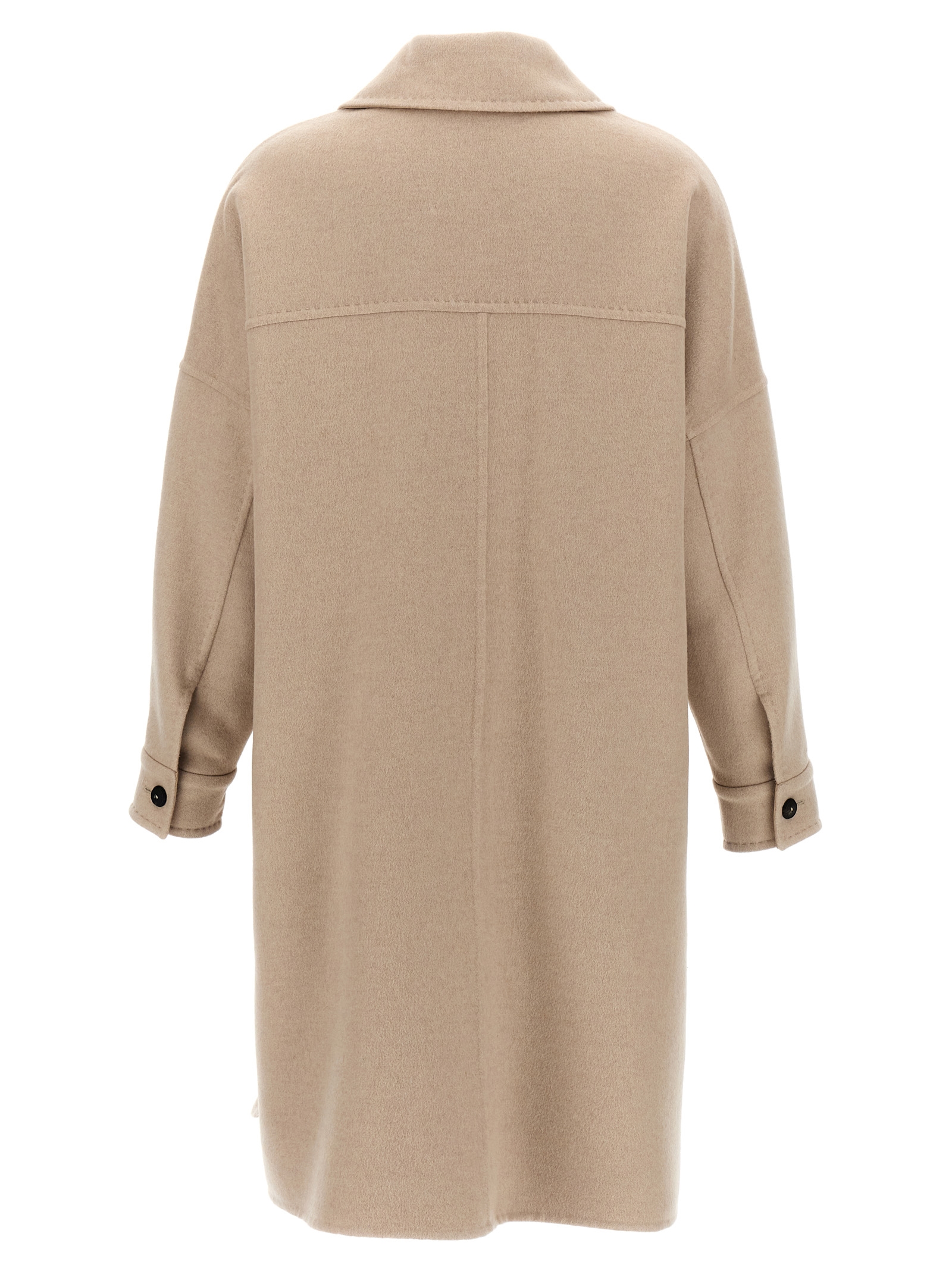 'Baruffa' double cashmere coat with chemise style with button closure, leather details, pockets, long sleeves, side slits. Canvas dress holder and custom hanger.