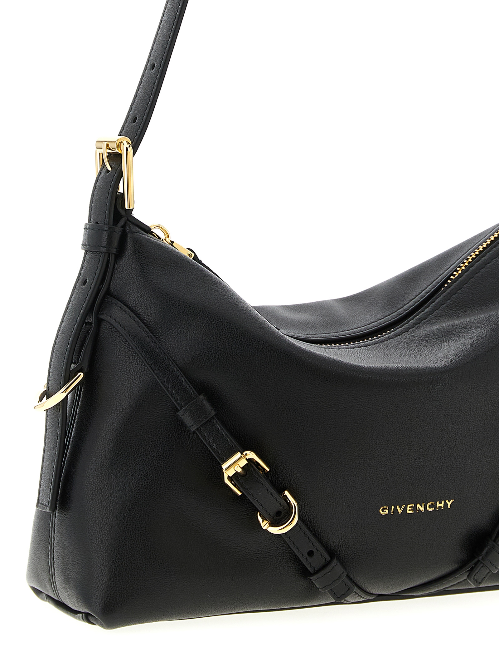 Mini shoulder bag in smooth and shiny calf leather, 'Voyou' line, embossed logo and front strap detail, top zip closure, adjustable handle, canvas lining.