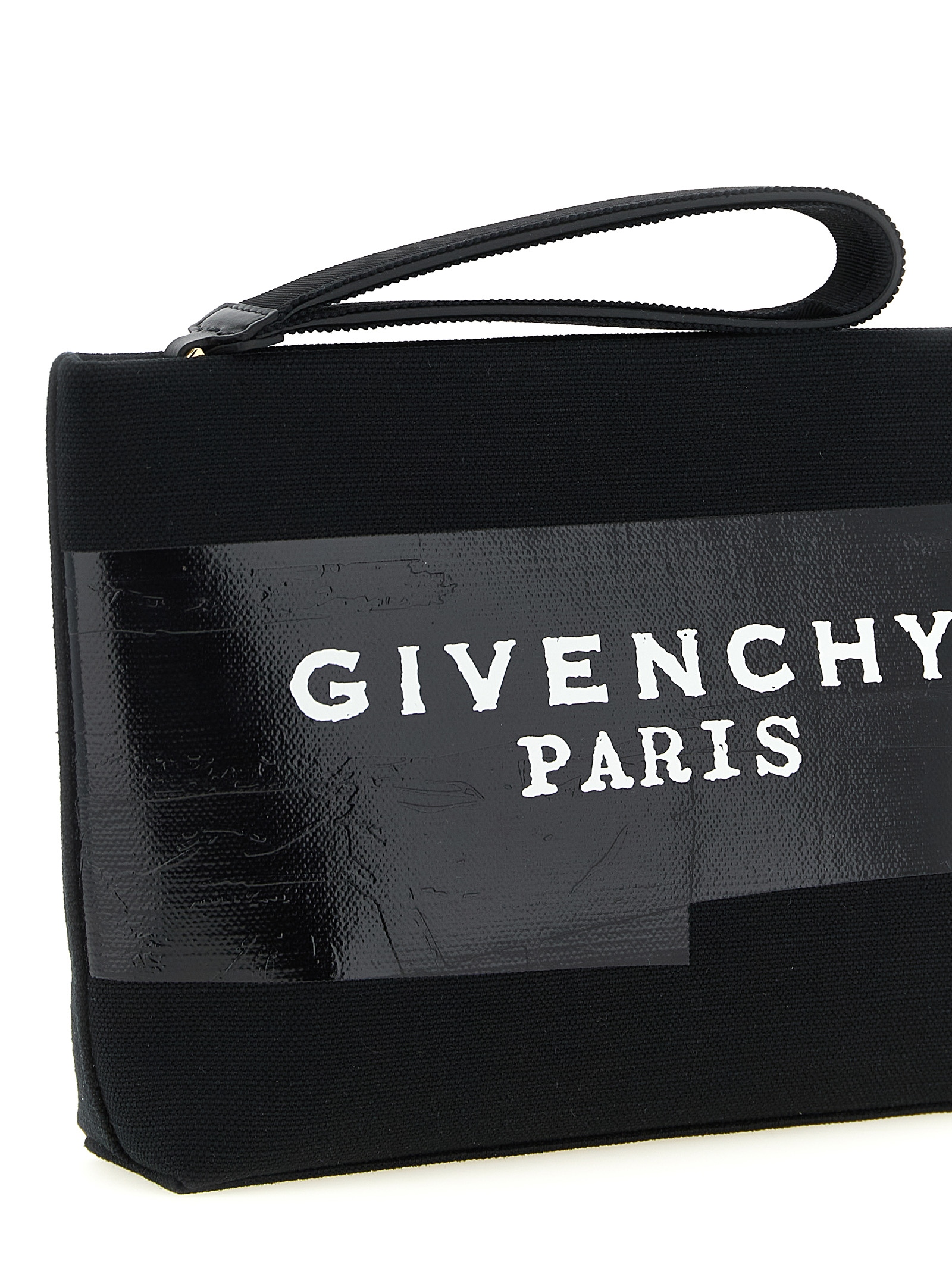 Small cotton canvas clutch bag with front 3D 'Givenchy Tape' print, top zip closure, leather handle covered in tone-on-tone grosgrain.