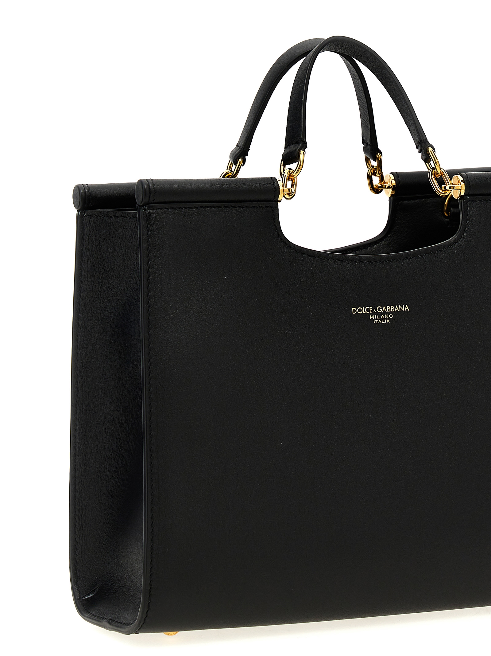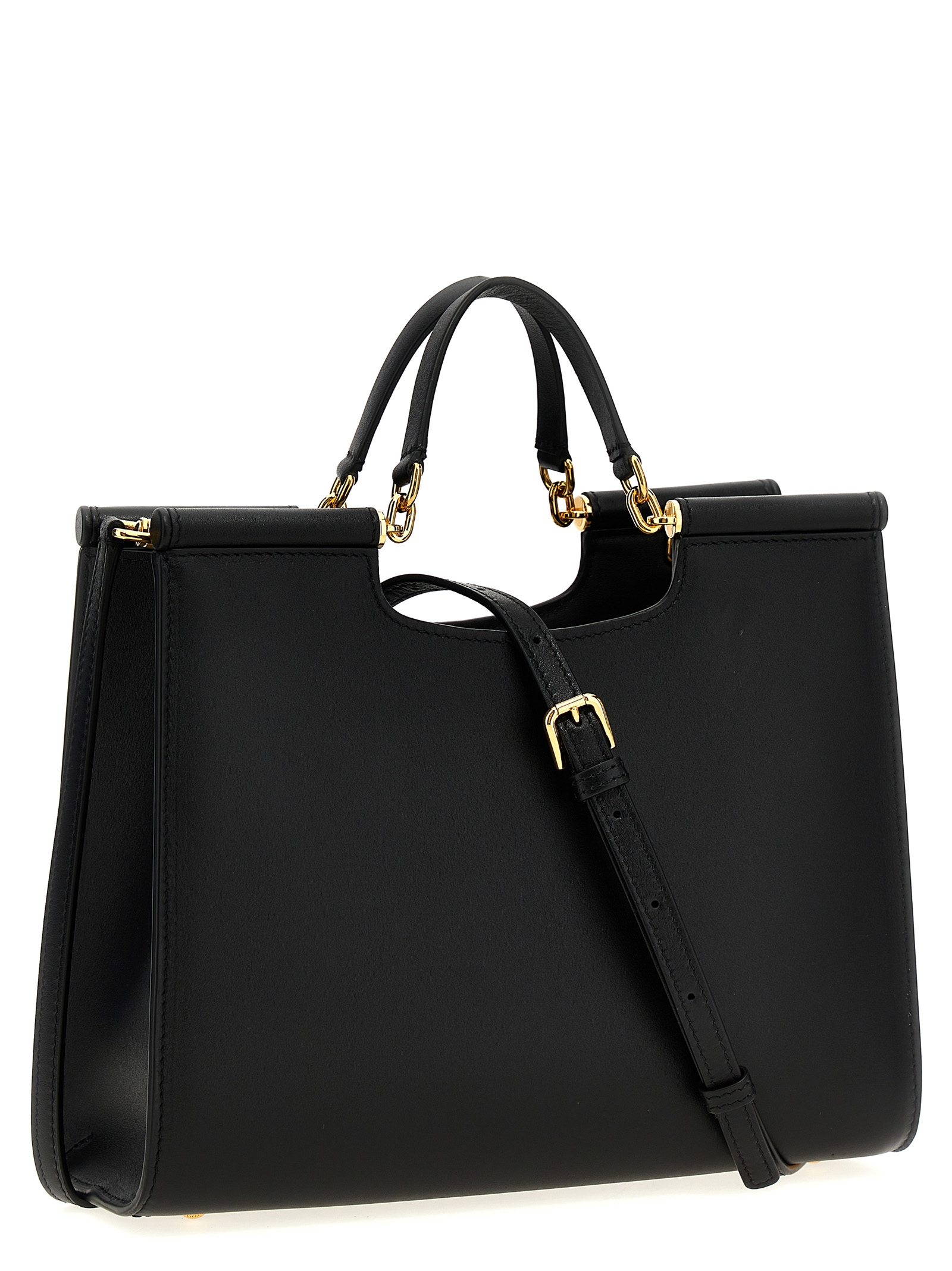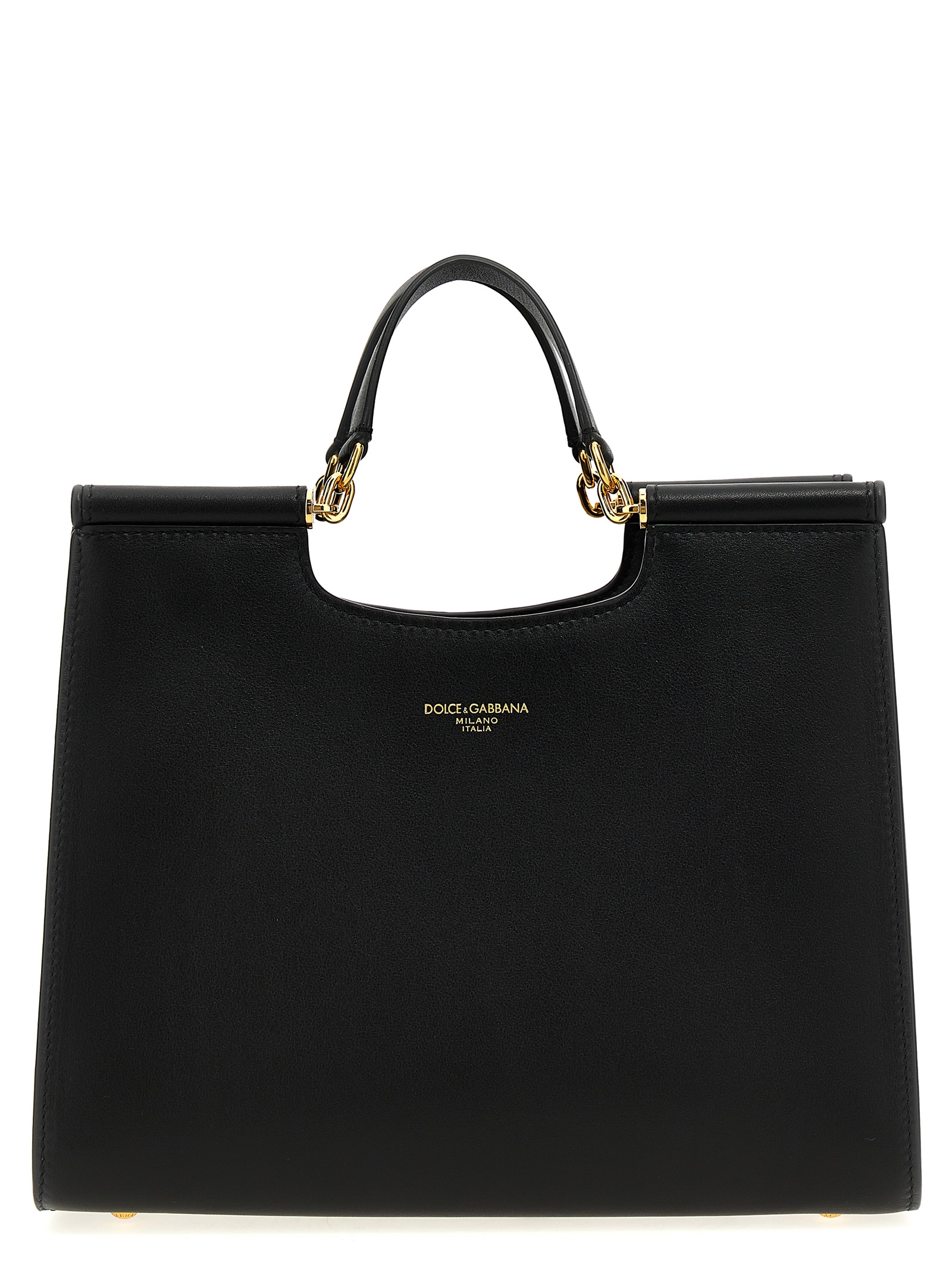 Small 'Sicily' leather shopping bag, double fixed handle, front embossed logo, gold metal details, adjustable and removable shoulder strap.