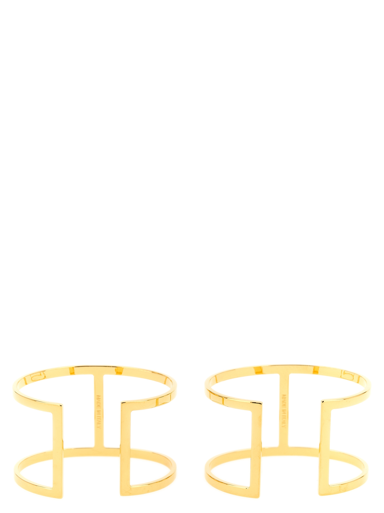 Set of two gold-finish metal bracelets, rigid logo design.