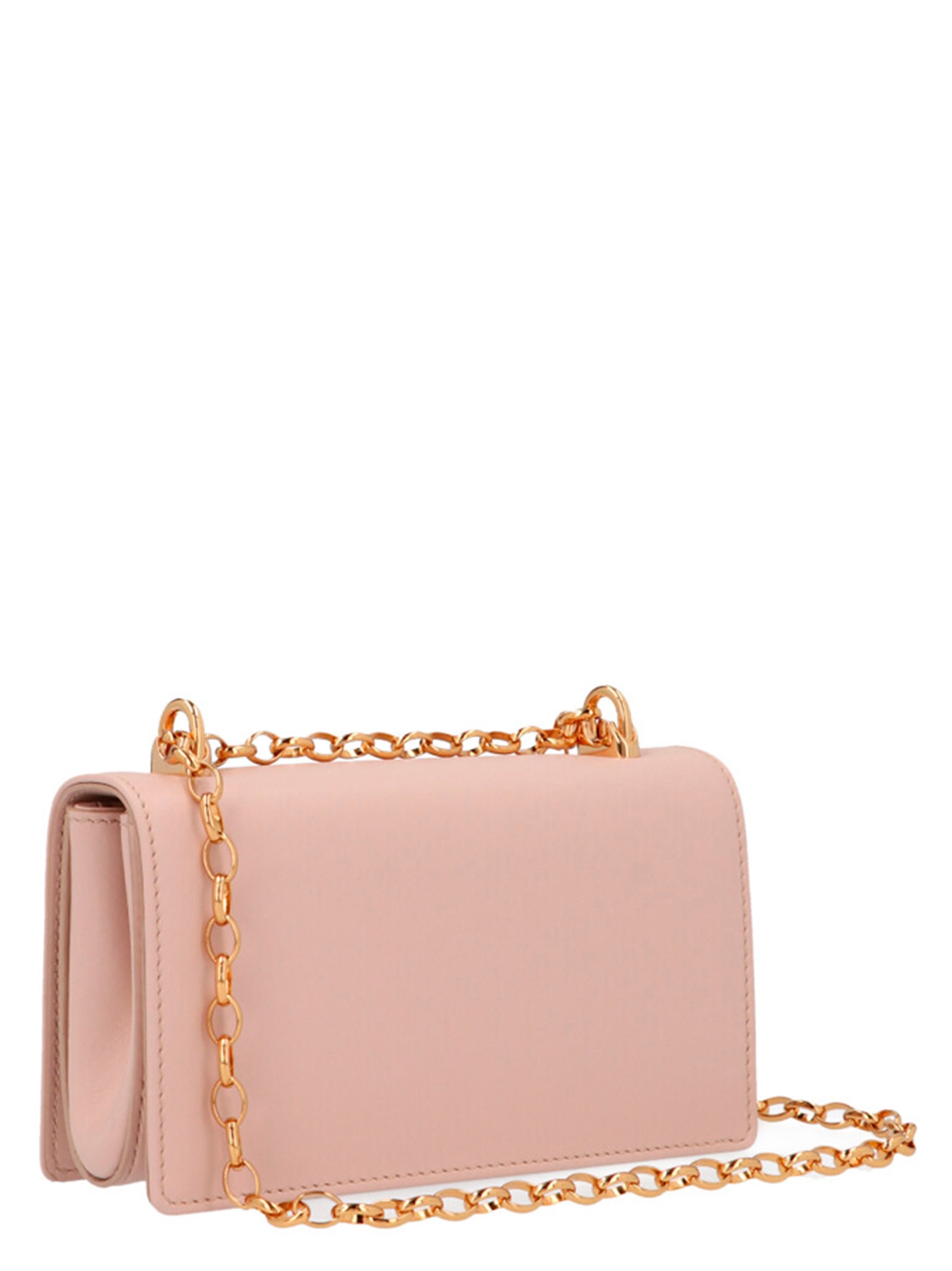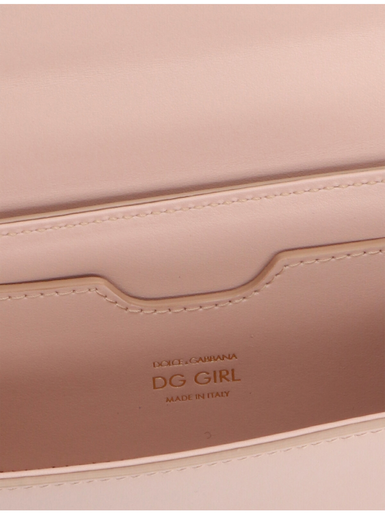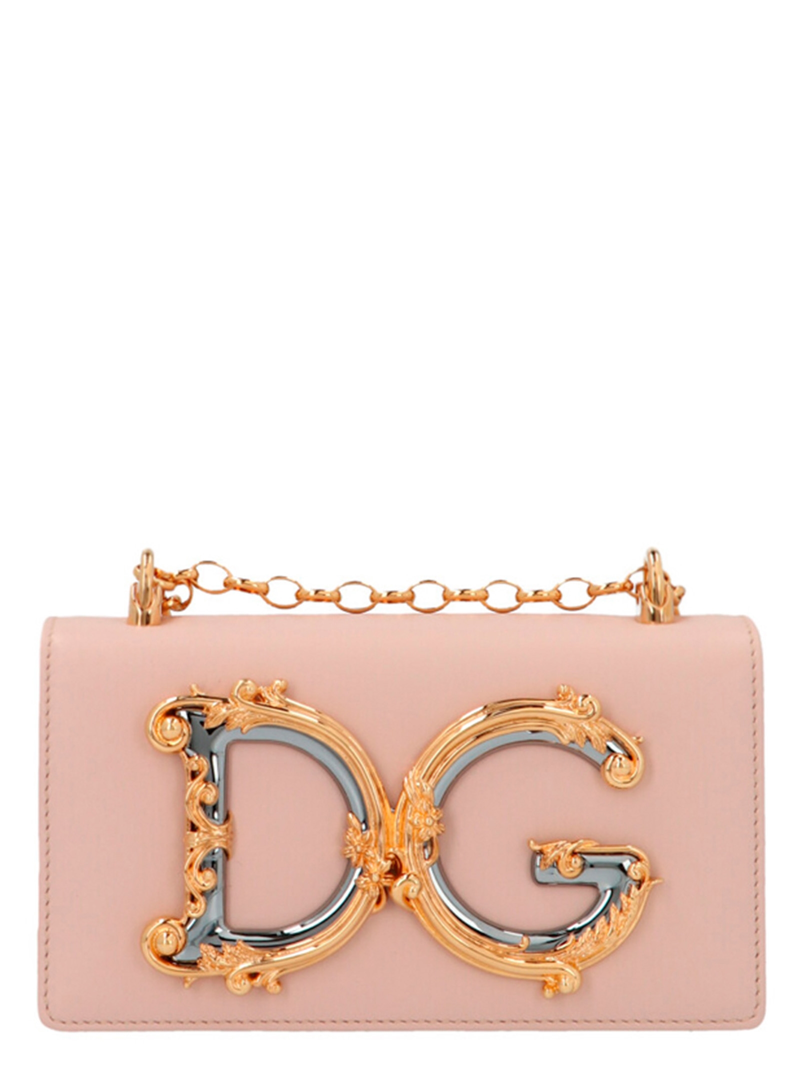 'DG Girl' mini calf leather crossbody bag with gold logo and hardware, flap closure and chain shoulder strap.