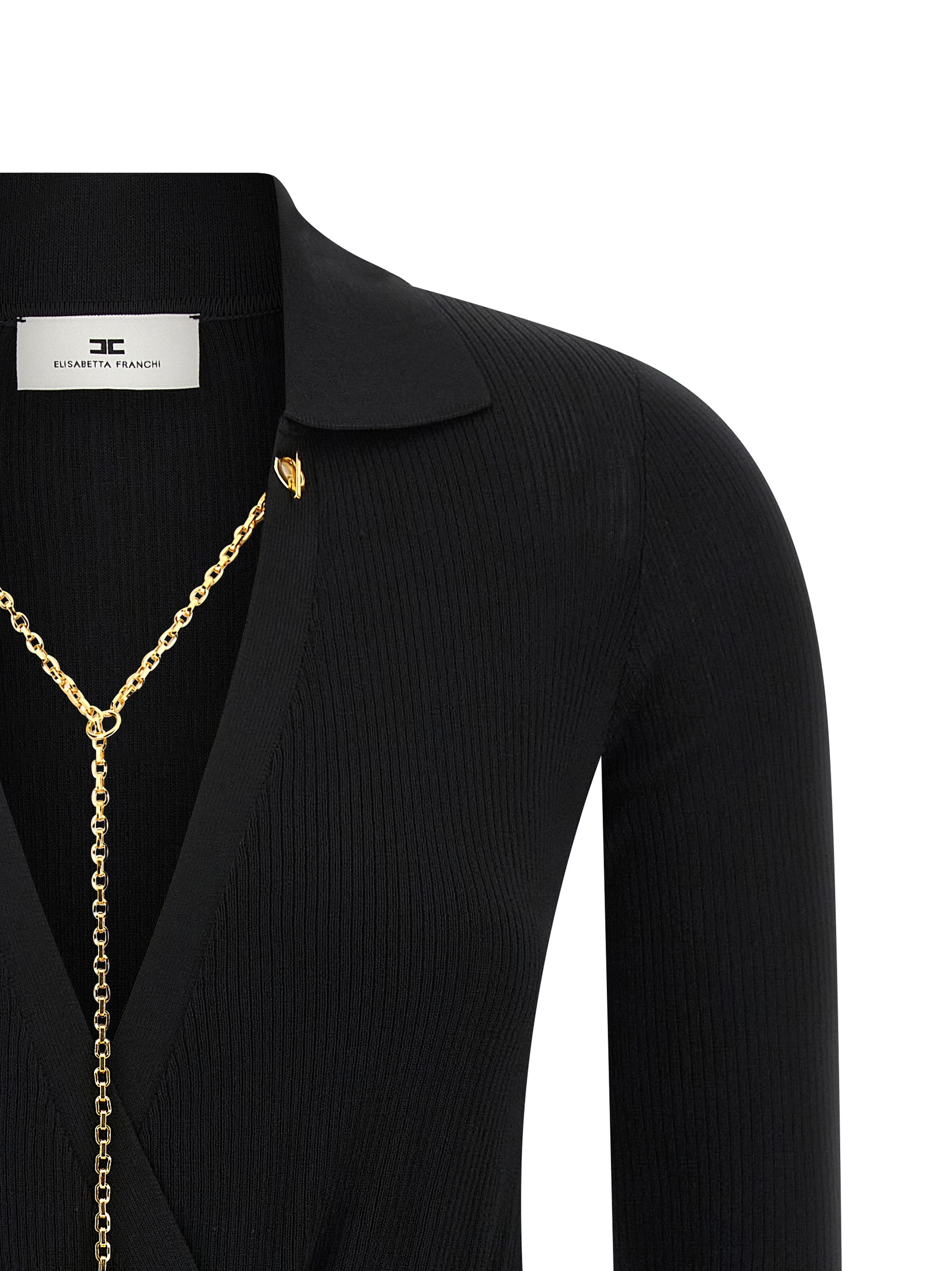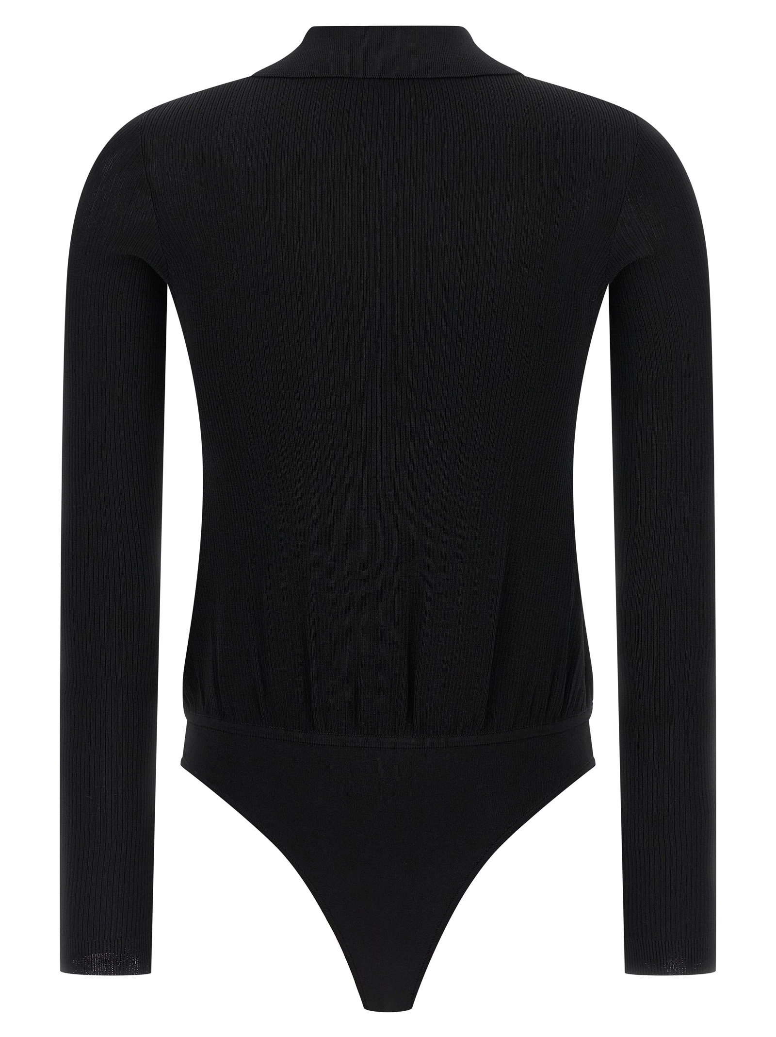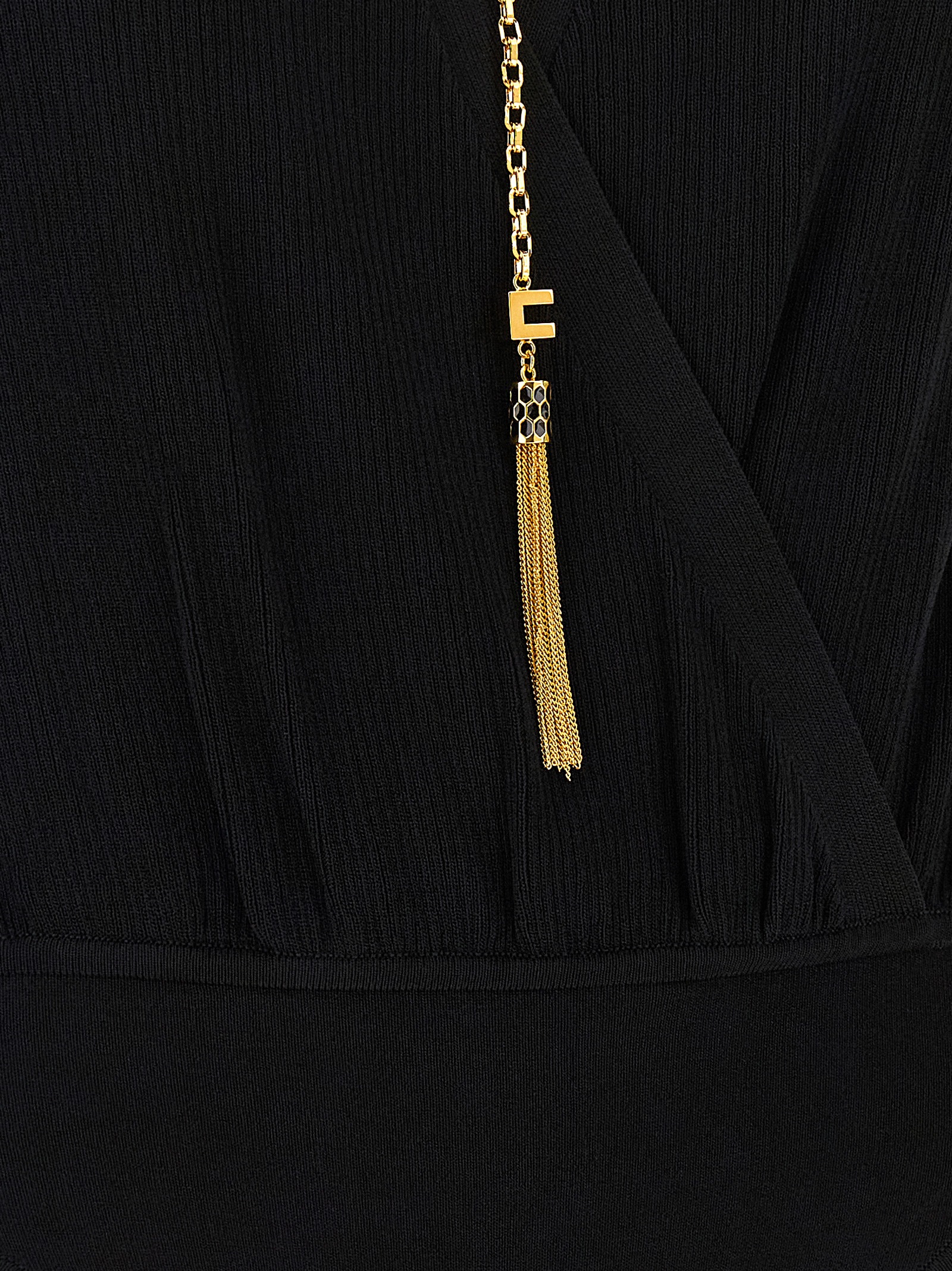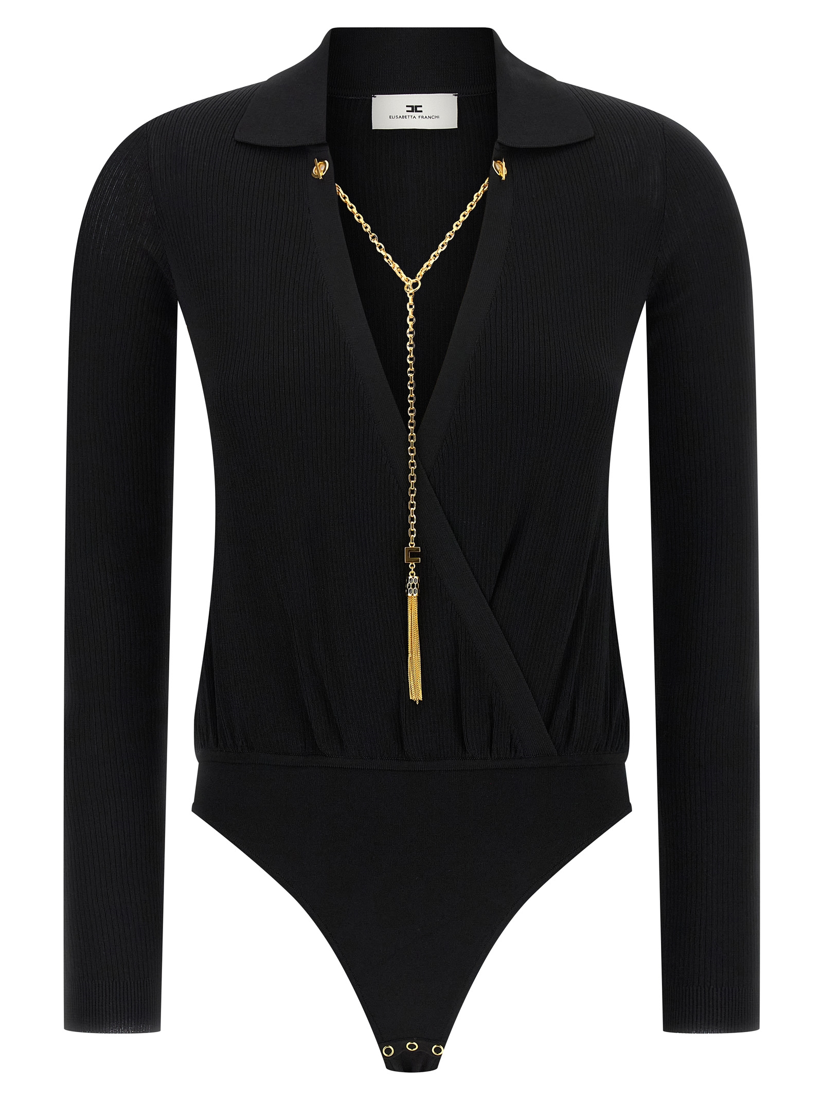 Ribbed knit bodysuit in viscose and silk yarn, collar, deep front V-neck with crossing and metal chain detail with t-bar and snake tassel, long sleeves, snap buttons on the hem.