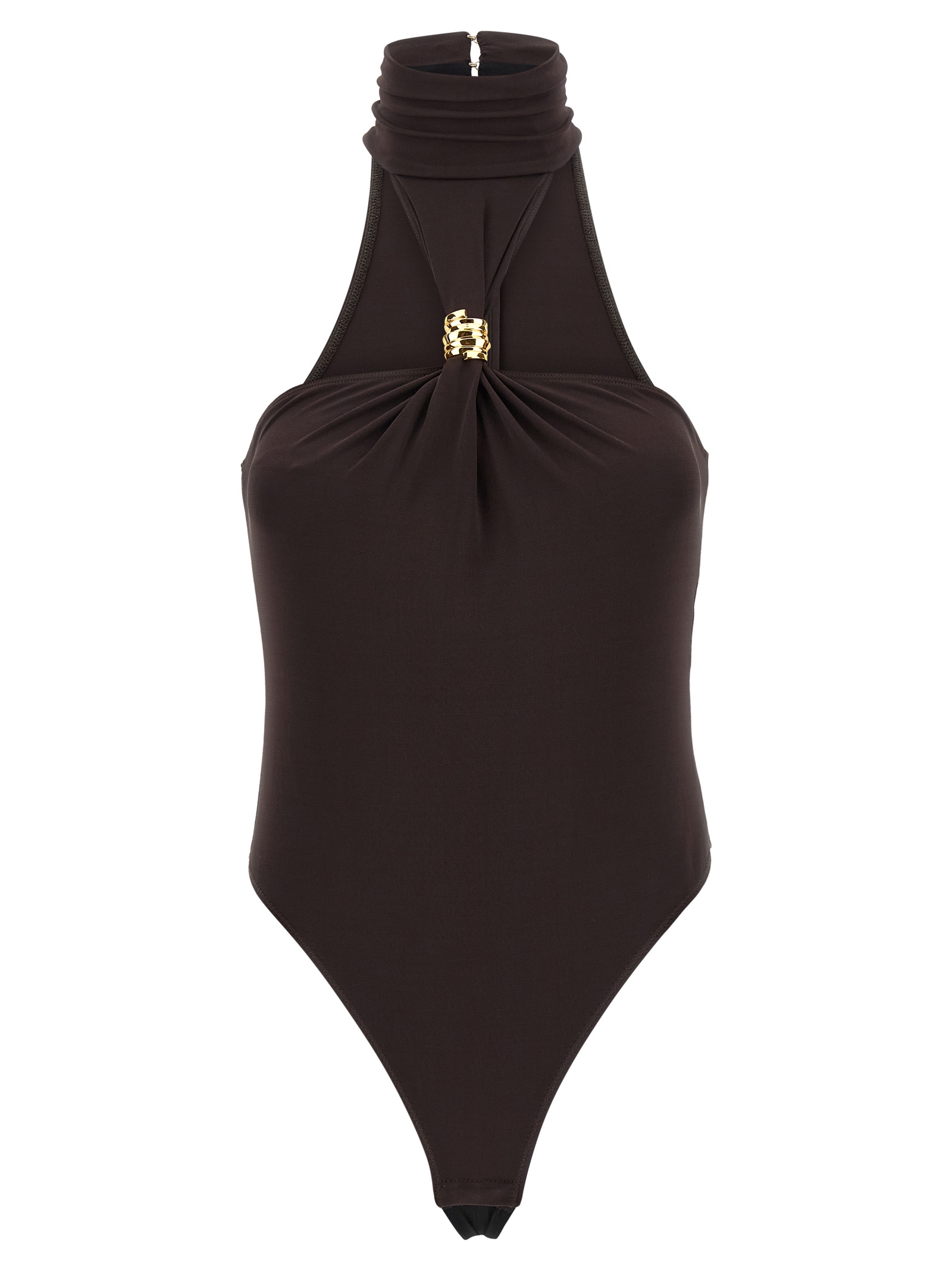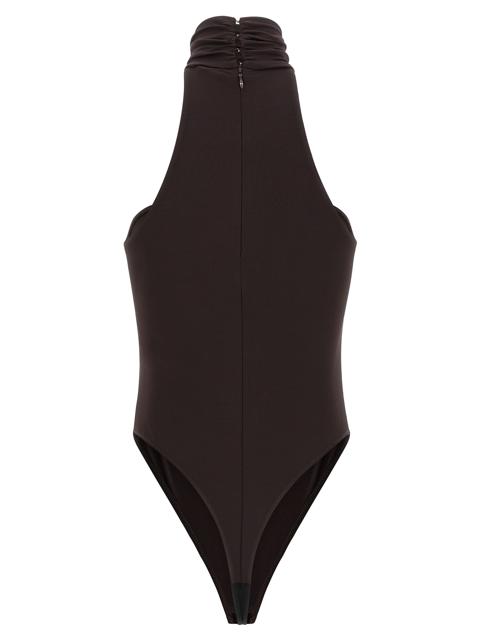 Jersey crêpe bodysuit with high neck, rowing machine with metal jewel detail on the front, back zip closure, high leg, snap buttons on the hem, knit lining.