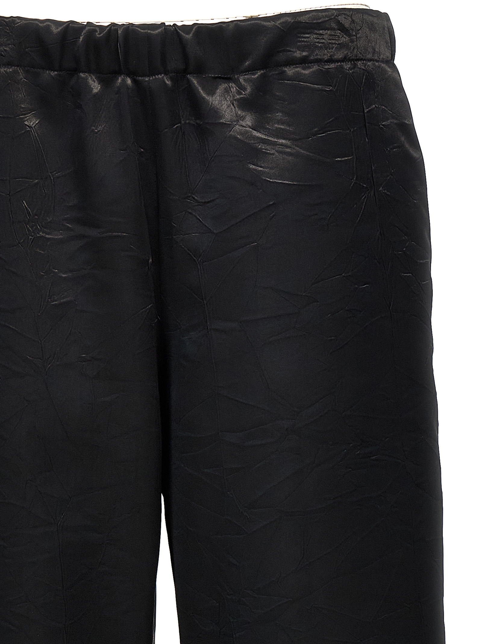 Shiny fabric trousers, regular fit, straight leg, elastic waistband, pockets.