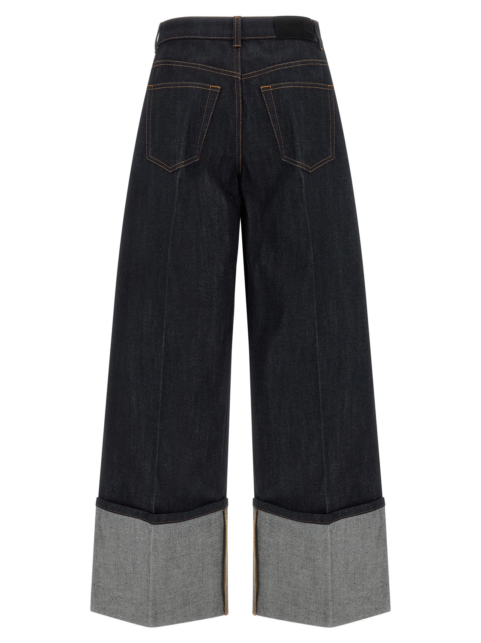 Джинсы из хлопкового денима с эффектом необработанного полотна, контрастная строчка, расклешенный силуэт, очень широкие и длинные штанины, эластичные складки, застежка на молнию и пуговицу спереди, пять карманов, замшевая бирка с логотипом сзади, пришитый отворот по низу штанин.