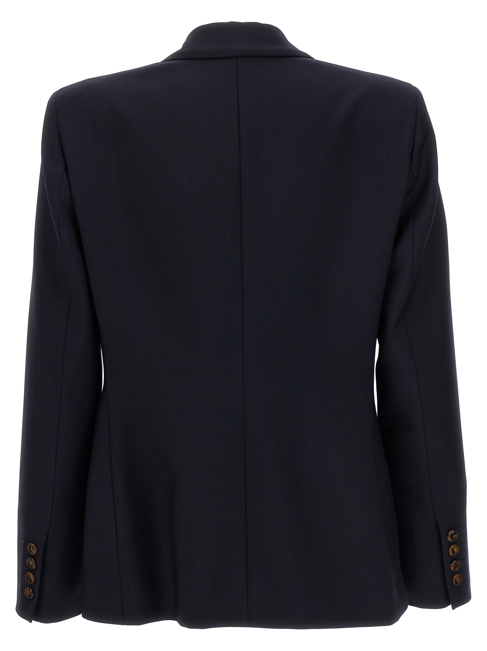 'First Class Charmer' double-breasted hourglass blazer in wool and mohair with front button closure, peak lapels, breast pocket, 'Smiley' pockets, long sleeves, padded shoulders, monogram viscose lining.
