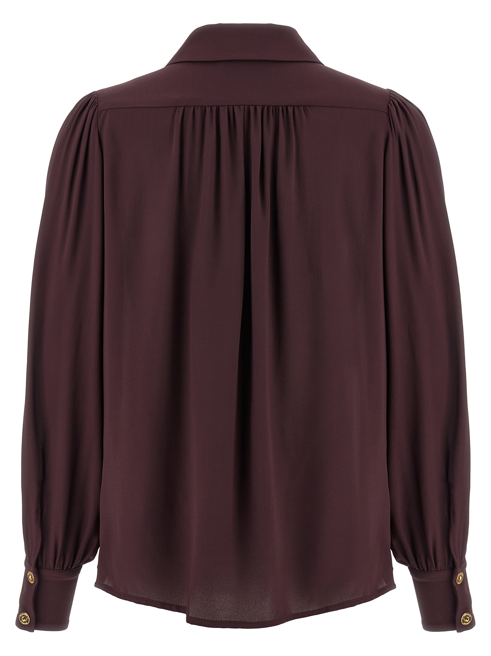 Viscose georgette shirt with V-neck, collar with removable metal necklace detail, ruffled shoulders, long cuffed sleeves.