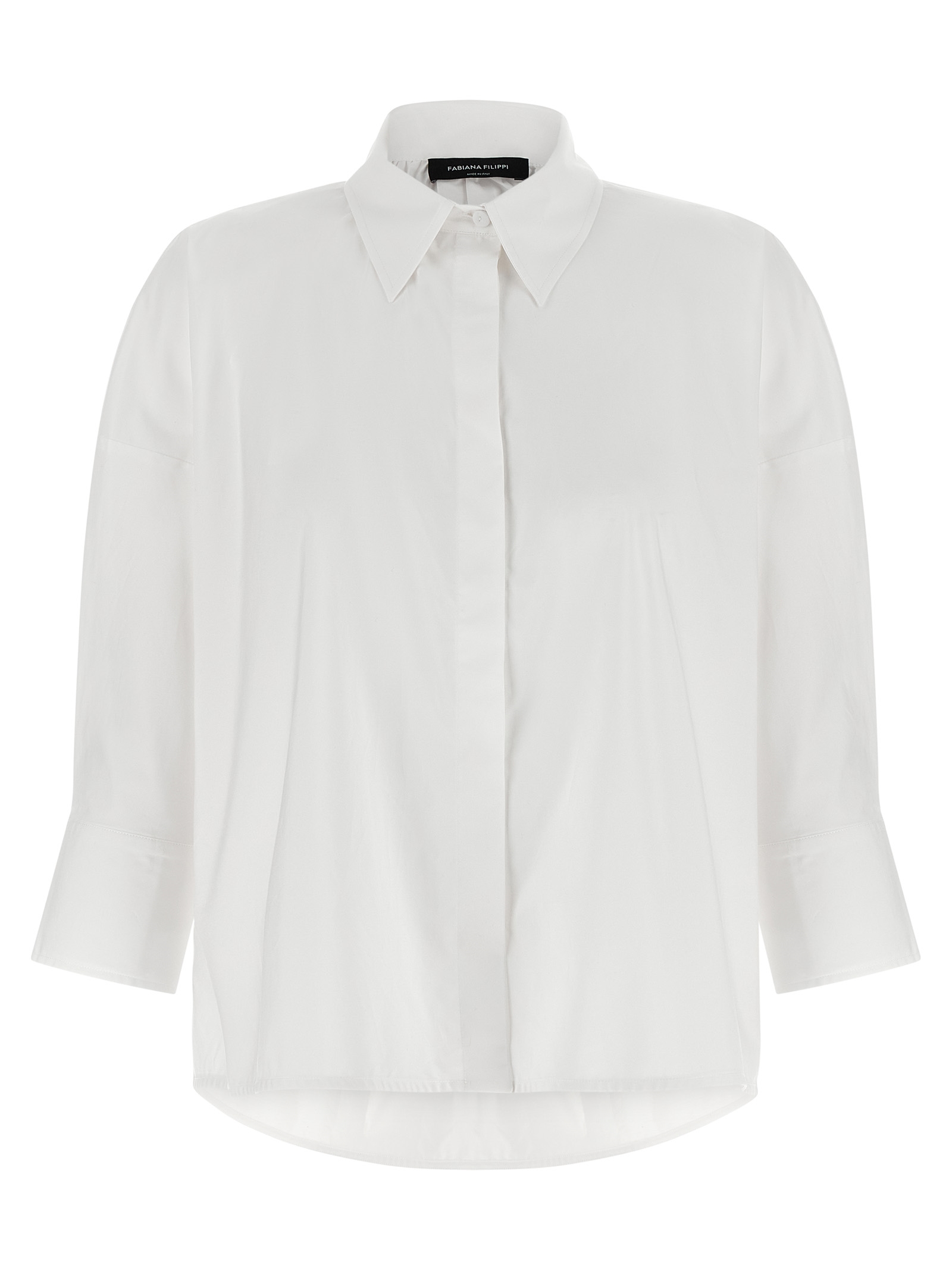 Cotton poplin shirt with back tulle and diamond thread inserts, concealed front button closure, 3/4 sleeves with cuffs and dropped shoulder, side slits, asymmetrical hem.