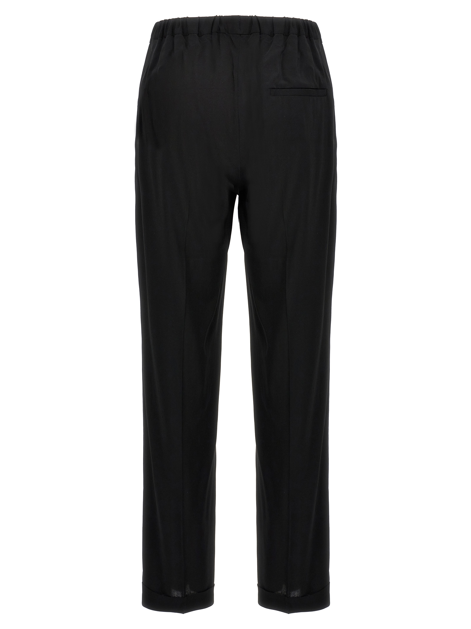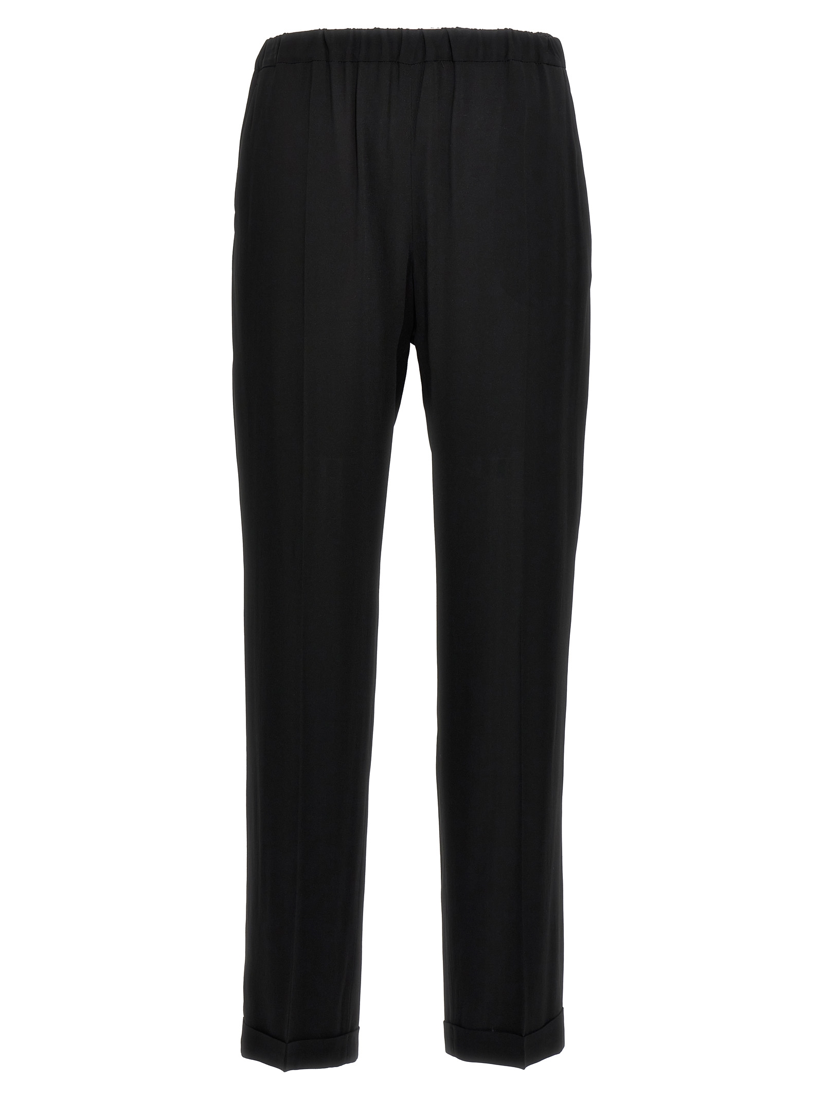 Georgette crepe pants, turned-up hem, elastic waistband, side pockets.