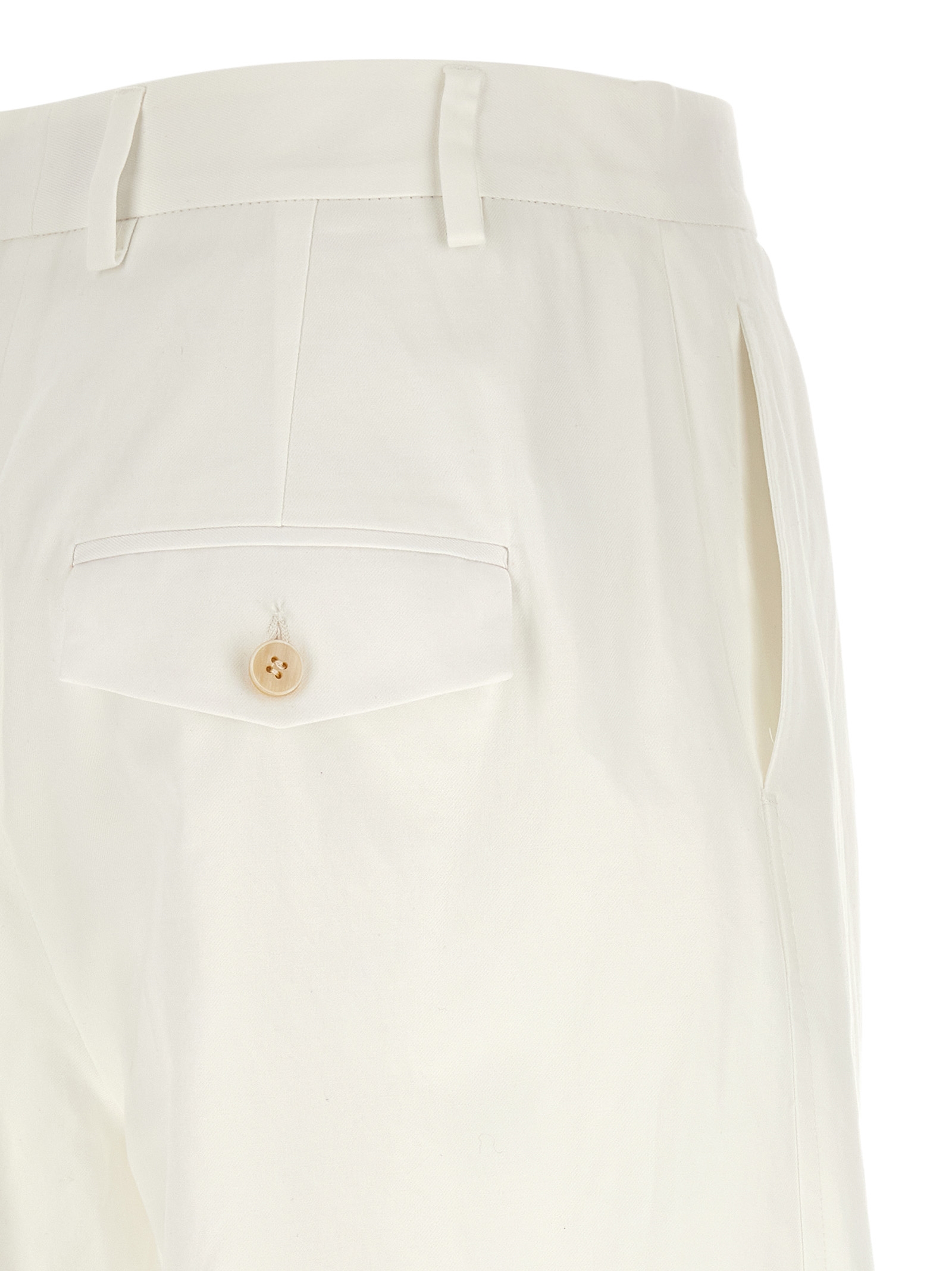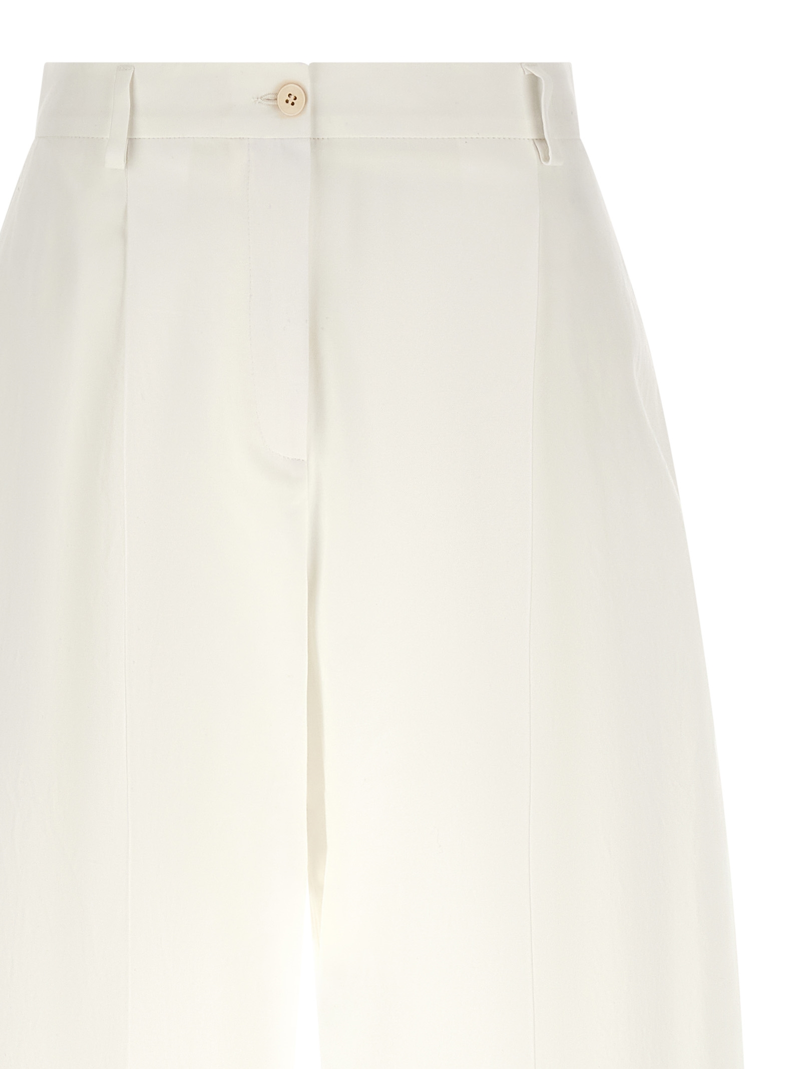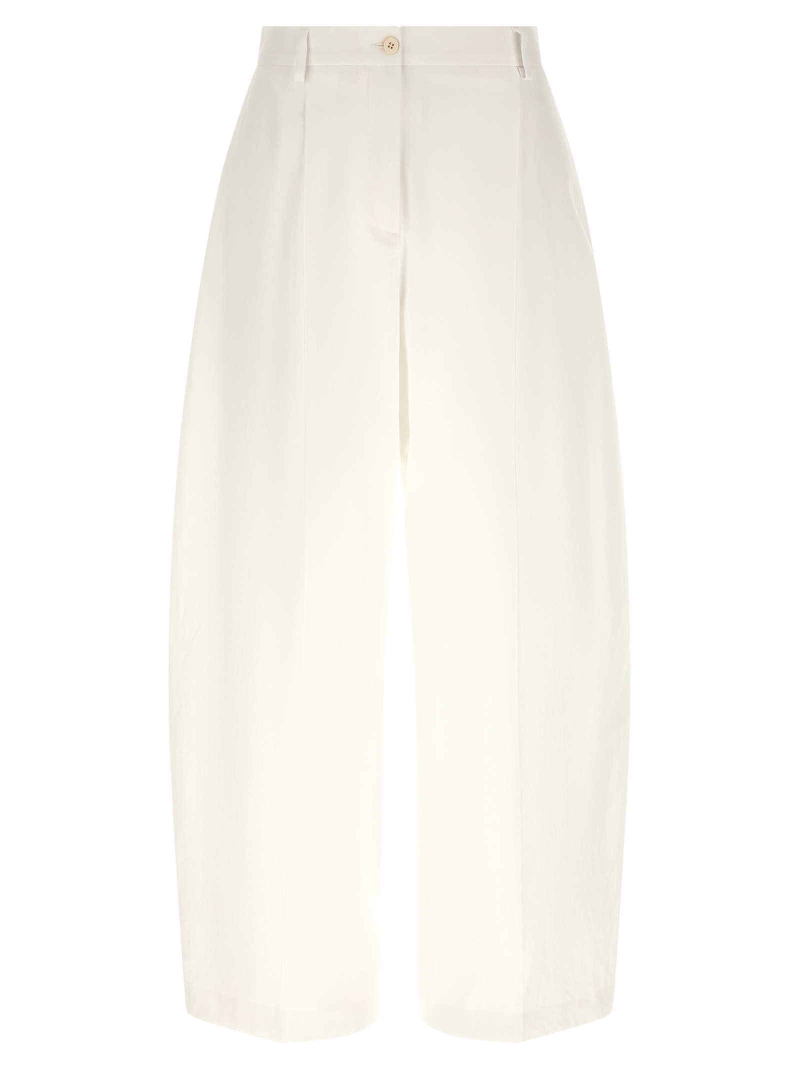 Cotton trousers, wide and curved leg, pince, stretched pleat, front zip and button closure, front French pockets, back welt pockets.