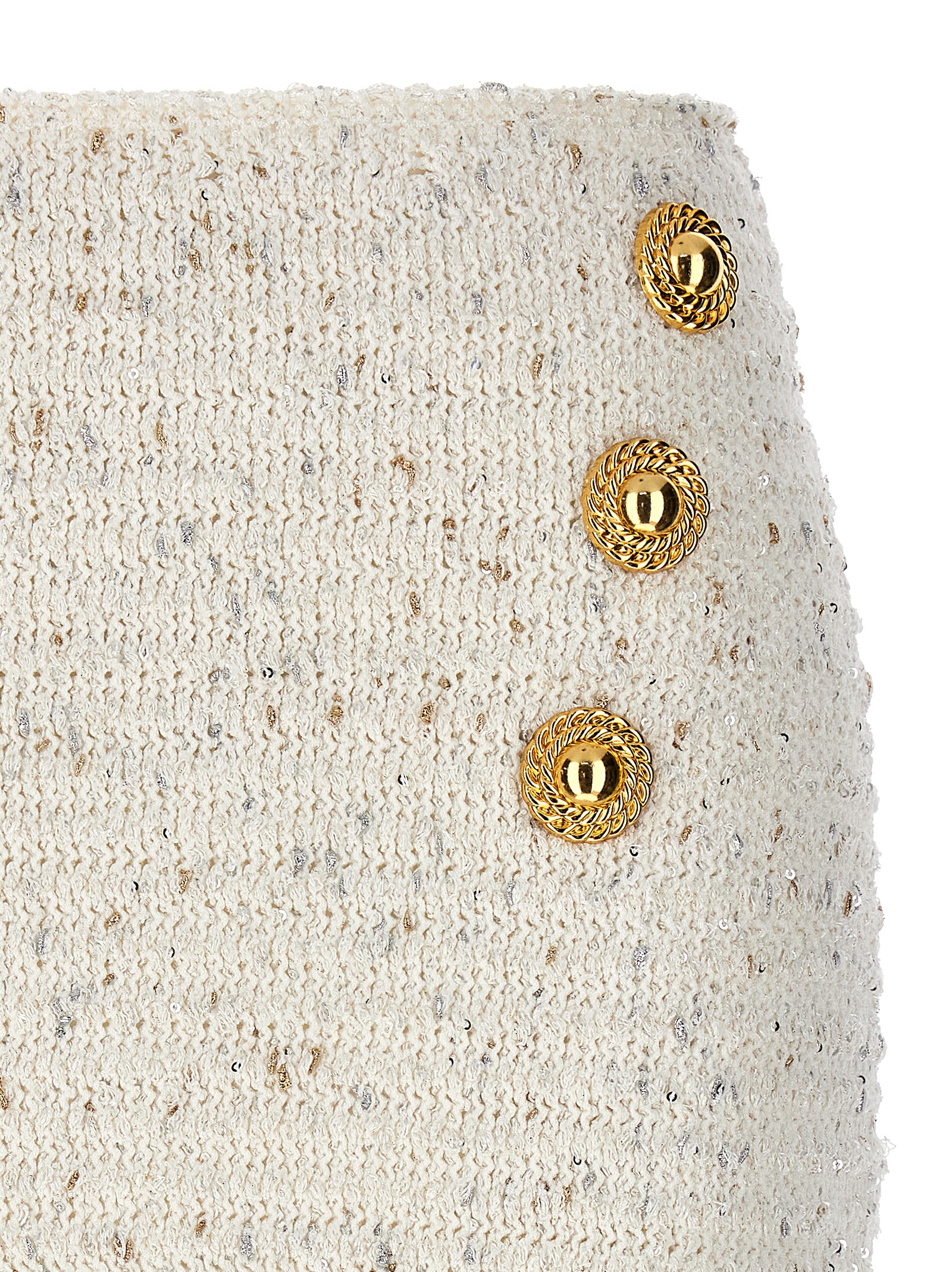 'Fringed Tweed' tweed skirt with sequins and fringes on the hem, front logo buttons, back zip closure.