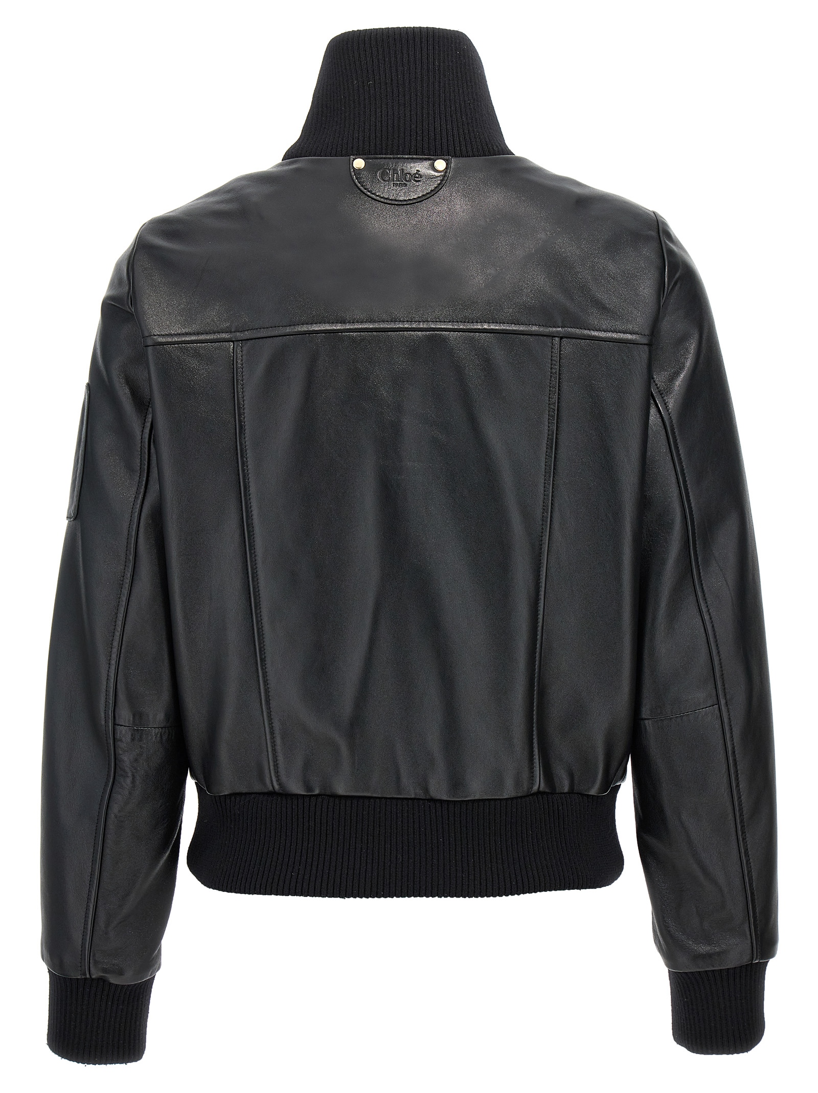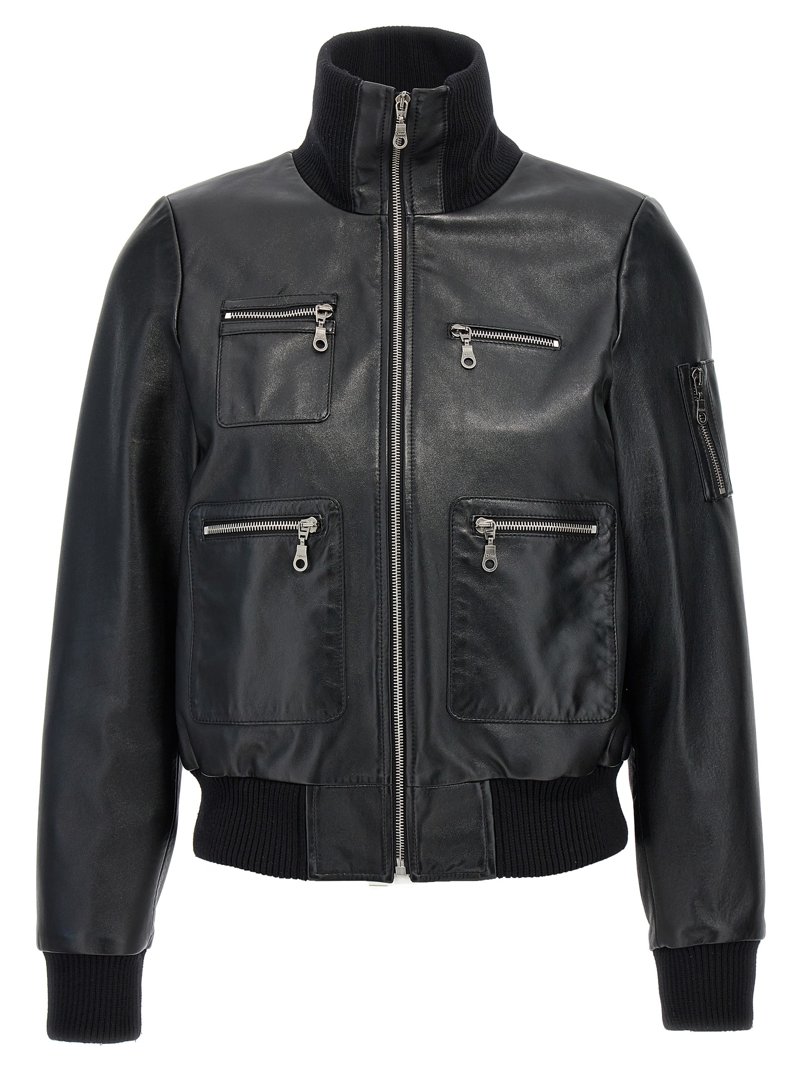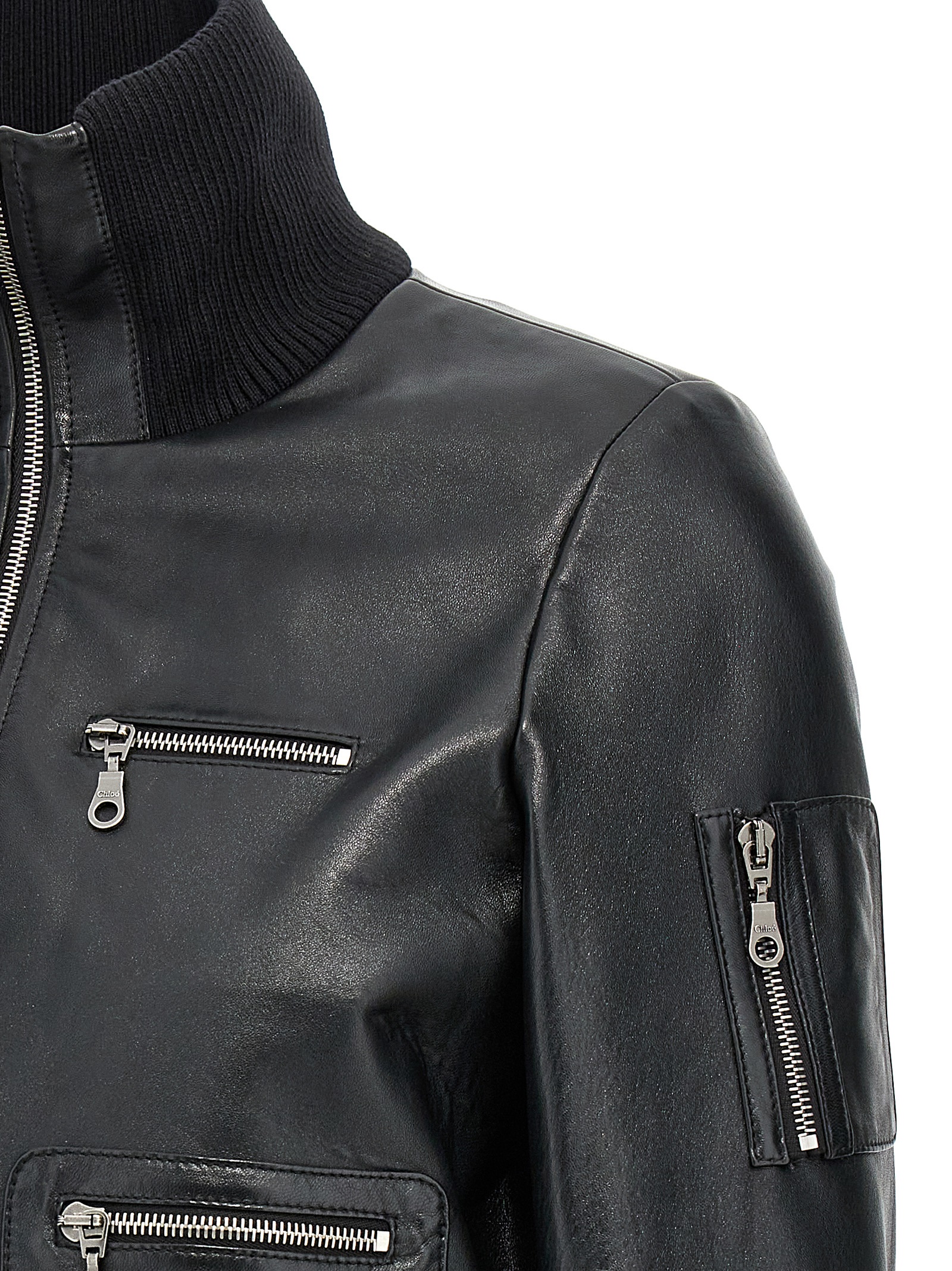 Leather bomber jacket with ribbed knit details, high neck, zip closure, pockets, long cuffed sleeves, tone-on-tone logo patch at the back.Характеристики товара