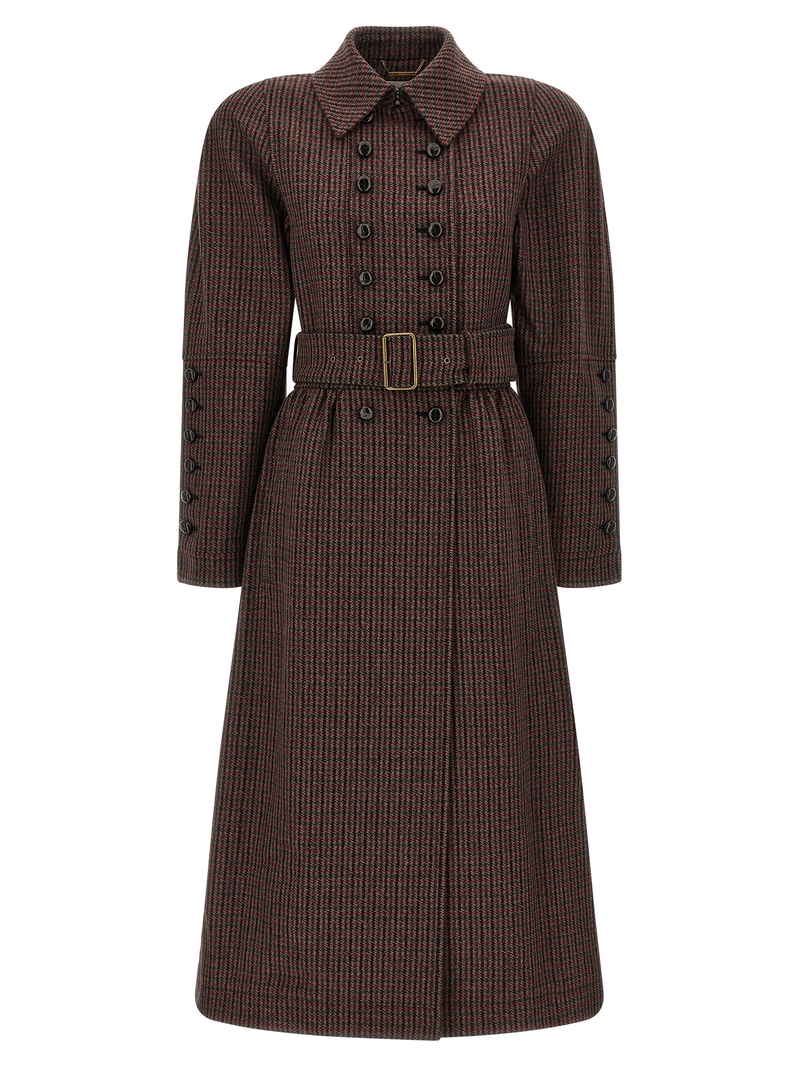 Pied-de-Poule, double-breasted riding wool coat with front button closure, shirt collar, pockets, padded shoulder, long sleeves with buttons on the cuffs, removable belt, viscose and cotton blend lining.