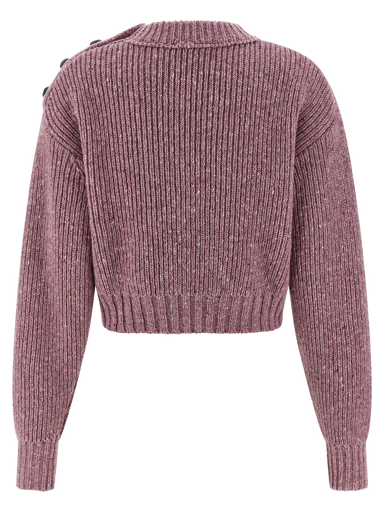 Укороченный вязаный свитер из шерсти мериноса породы Донегол с воротником-стойкой, блестящей кожаной пуговицей на левом плече, длинными рукавами с манжетами и приспущенными плечами.
