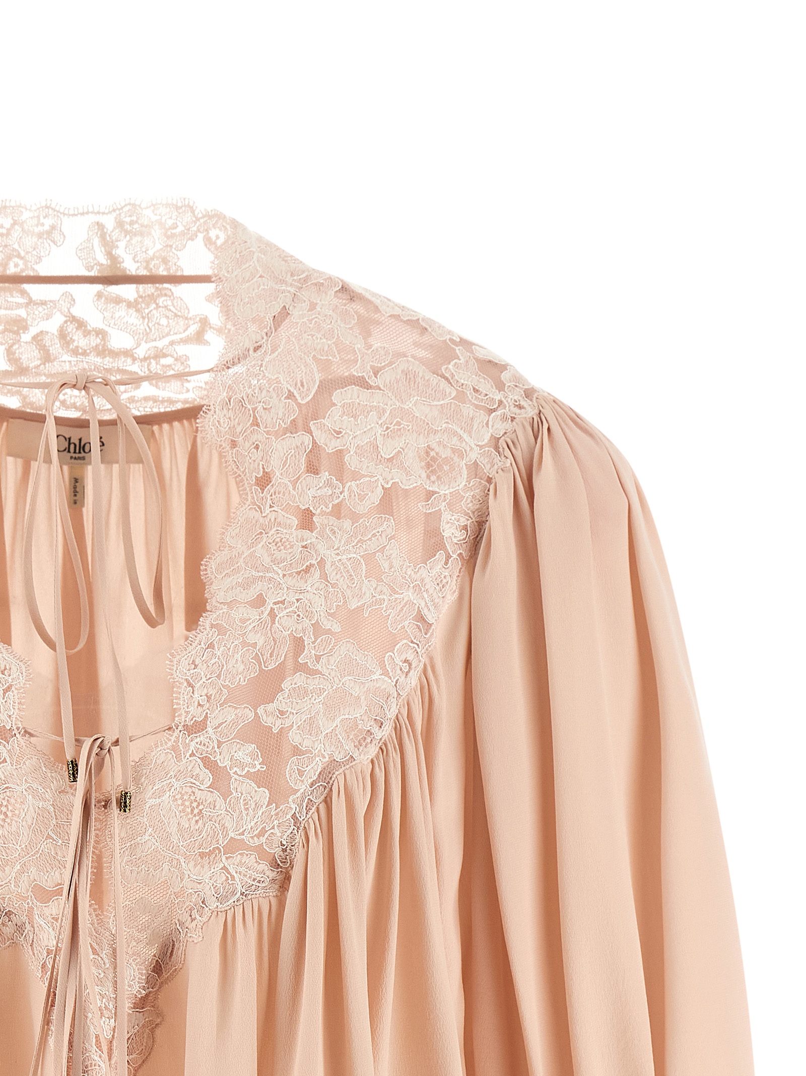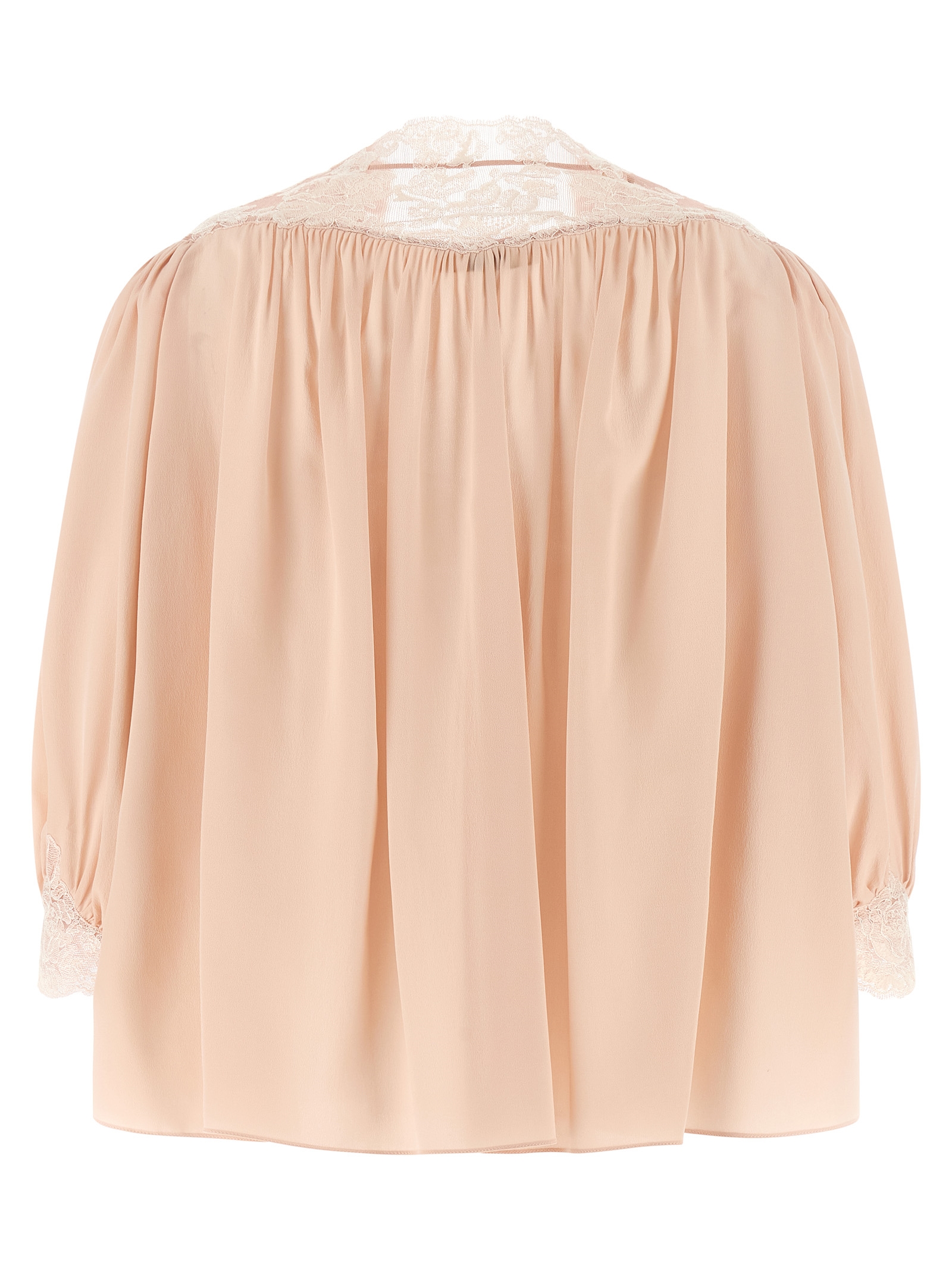 Silk crêpe blouse, loose fit with curls, neckline with lace inserts and knotted laces, 3/4 wide sleeves with lace cuffs on the bottom and buttons.Характеристики товара