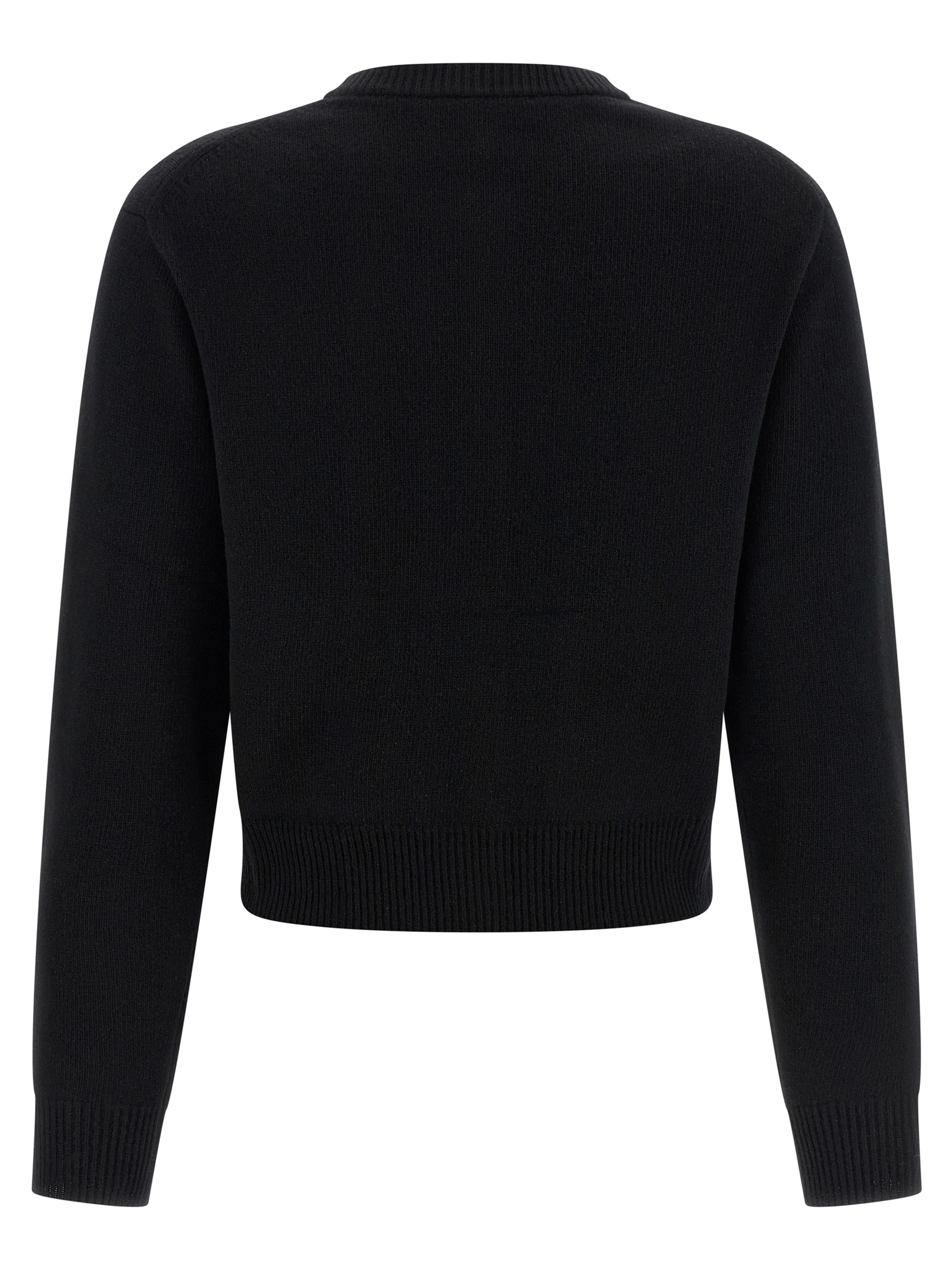 Merino wool and cashmere knit cardigan, crew neck, slightly cropped style, front metal 'Horse Medal' button closure, pockets with jewel details, long sleeves with cuffs and dropped shoulder.