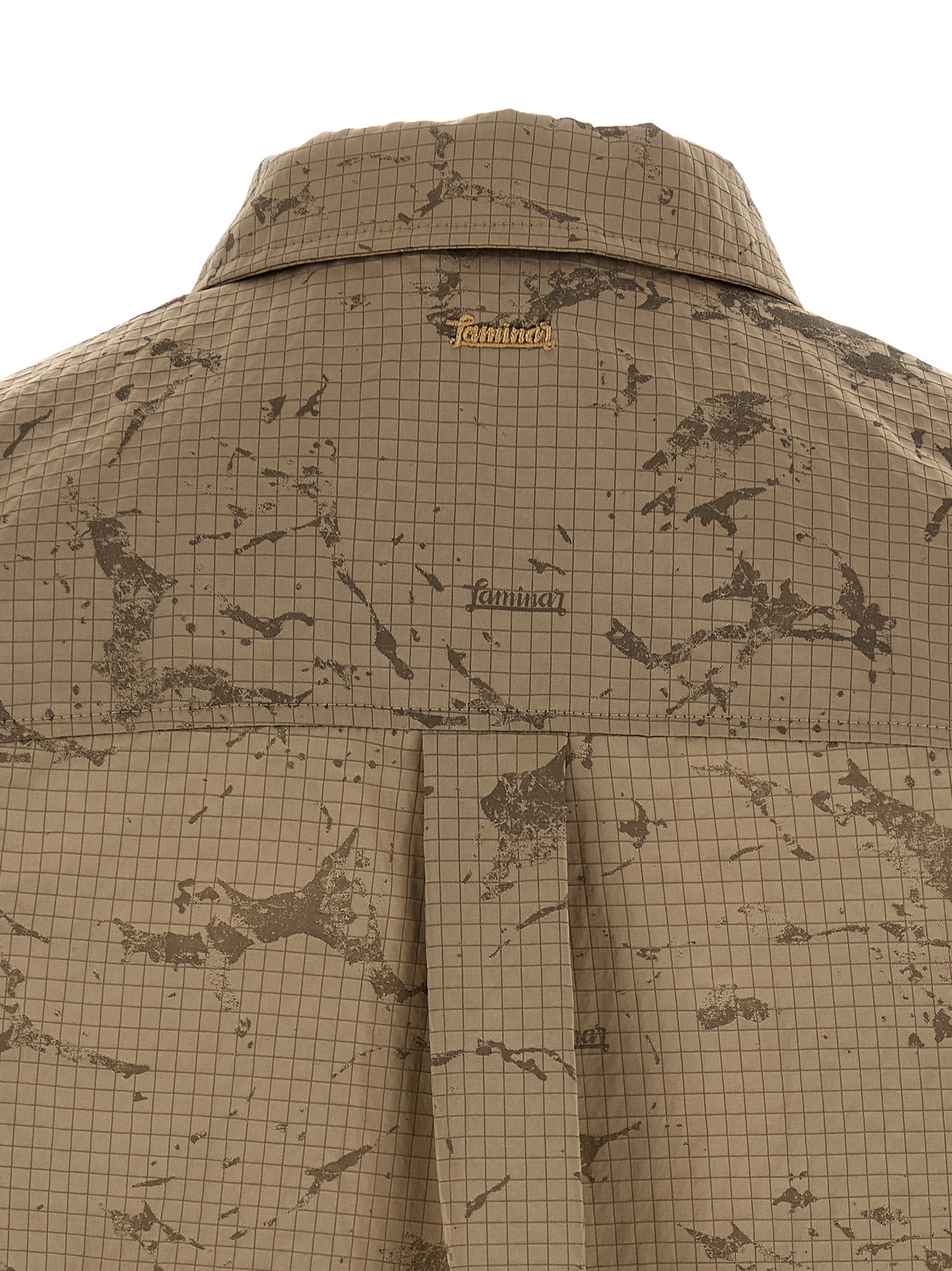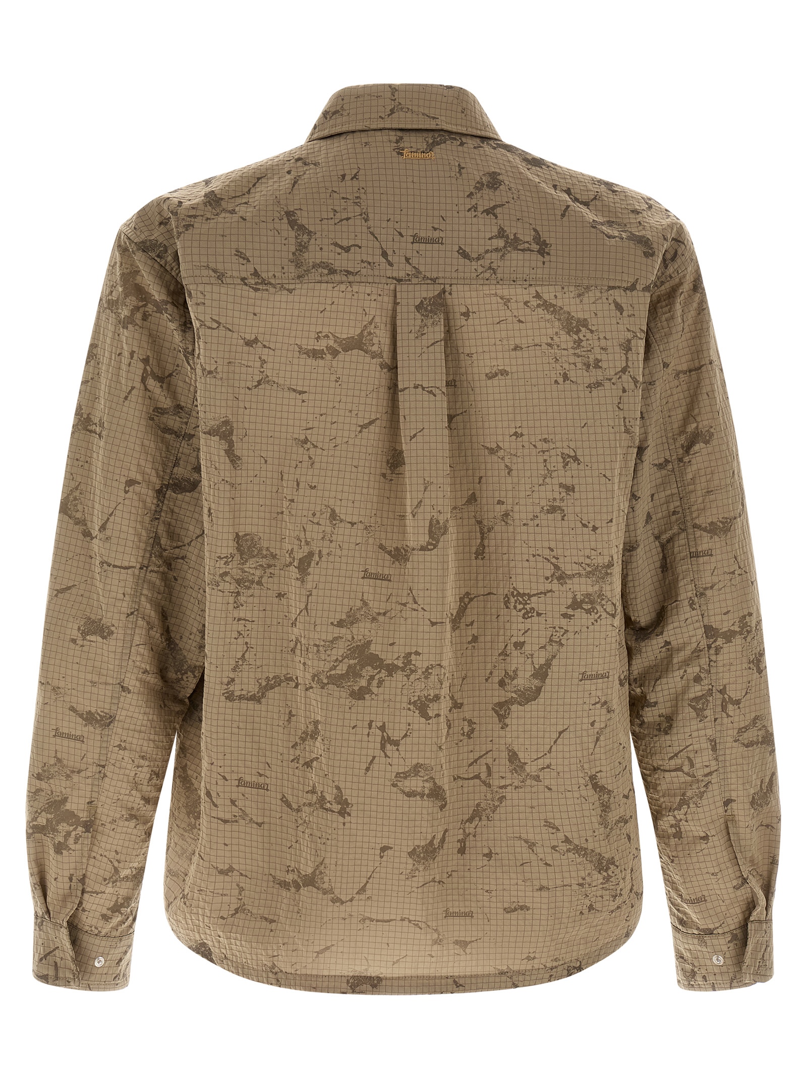 Camouflage patterned ripstop overshirt with logo print, pointed collar, front snap button closure, breast pocket, long cuffed sleeves, and asymmetric hem.Характеристики товара