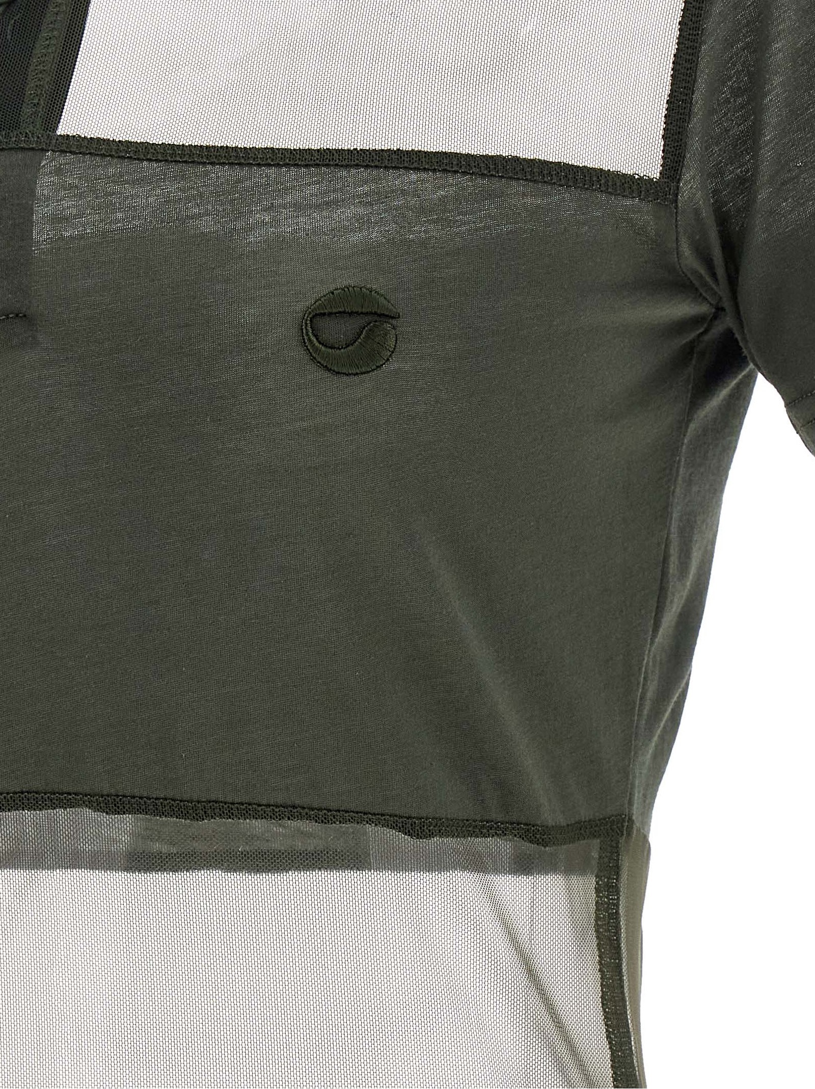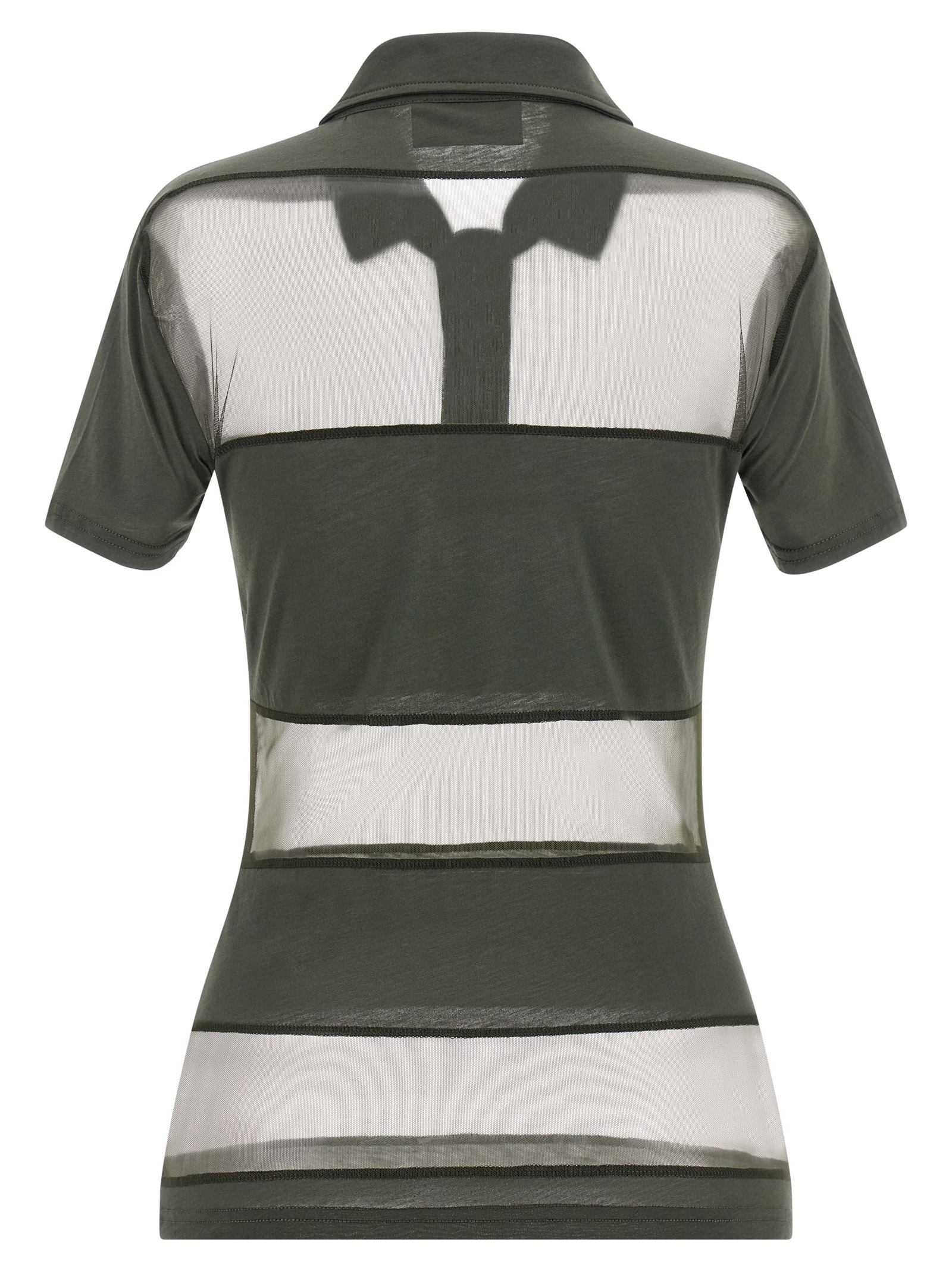 'Sheer Striped' polo shirt in stretch technical fabric with alternating opaque and transparent stripes, tone-on-tone logo embroidery on the front, collar and buttons, short sleeves.
